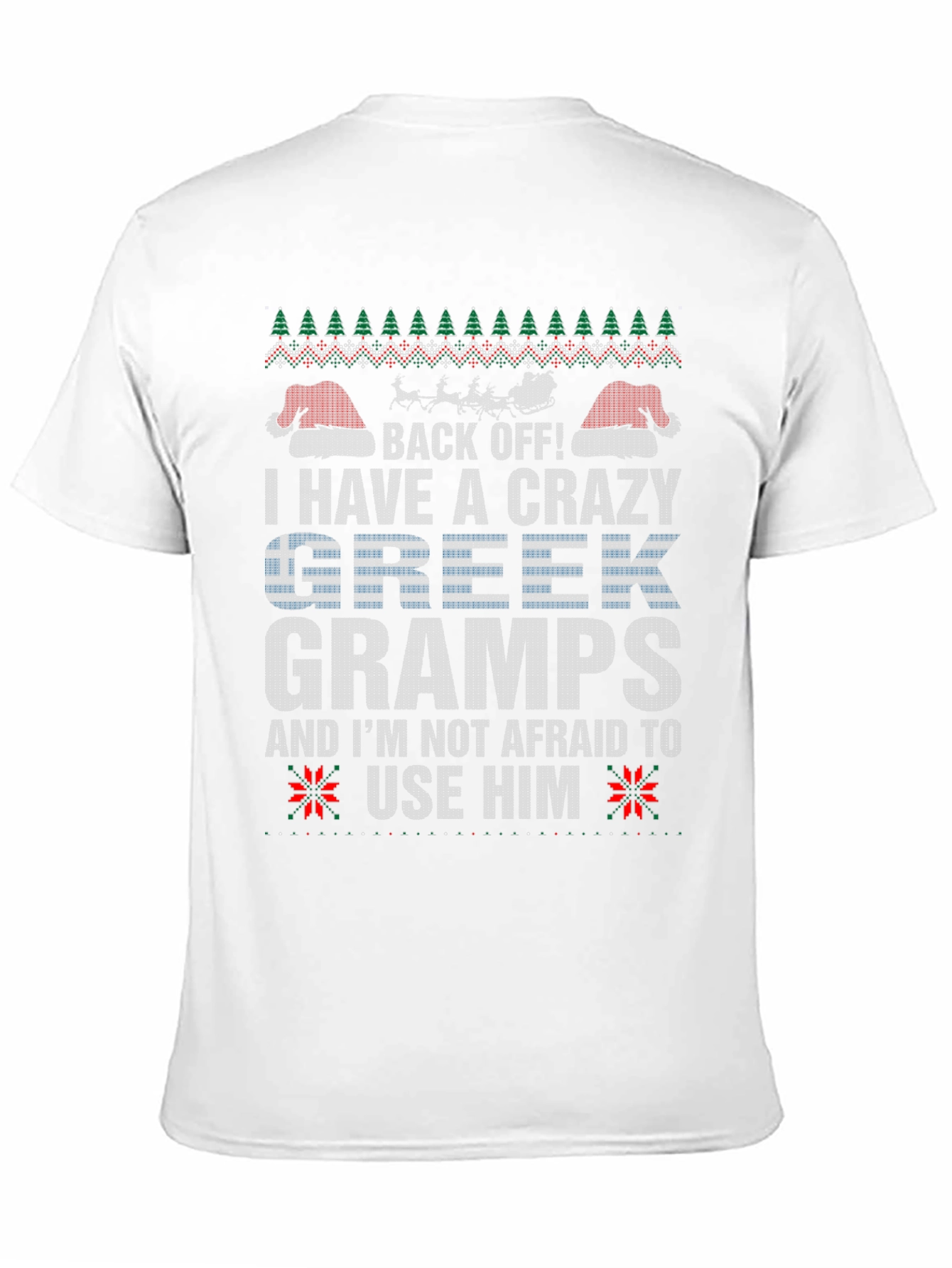 ¡Celebra la Navidad con humor! Esta camiseta negra presenta un diseño festivo con la frase "Back off! I Have A Crazy Greek Gramps and I'm Not Afraid To Use Him". El texto está decorado con motivos navideños como árboles, copos de nieve y gorros de Papá Noel. Ideal para usar en reuniones familiares, fiestas navideñas o simplemente para mostrar tu orgullo por tu abuelo griego. La tela parece suave y cómoda, perfecta para mantenerte abrigado y con estilo durante toda la temporada navideña. Regala esta camiseta divertida y original a alguien especial o ¡date un capricho!