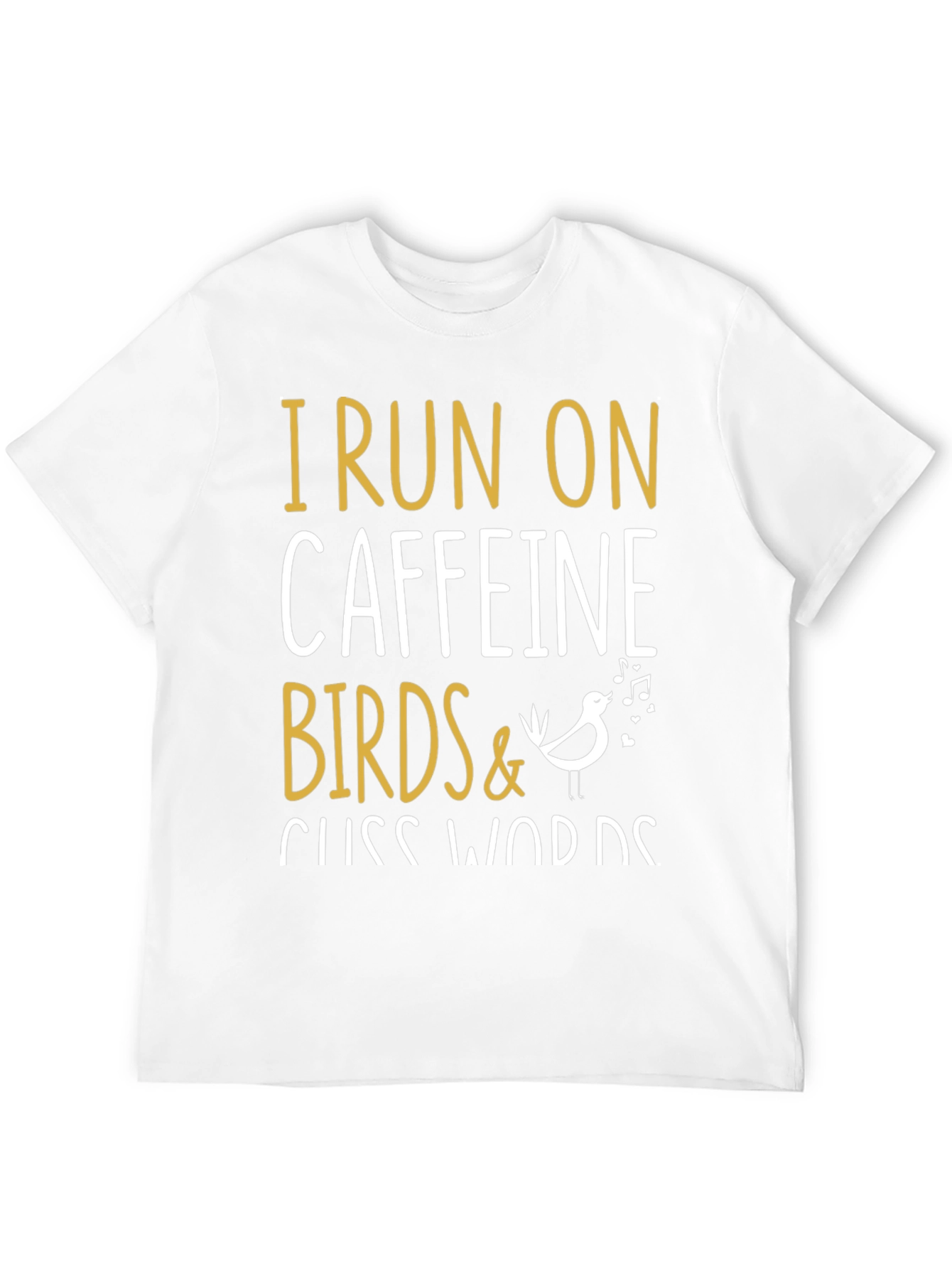 Luce esta divertida camiseta de hombre, ideal para expresar tu personalidad con un toque de humor. Esta camiseta negra de manga corta presenta un diseño llamativo con letras en color dorado y blanco que dicen "I run on Caffeine, Birds & Cuss Words" (Funciono con cafeína, pájaros y palabrotas), junto con un simpático dibujo de un pájaro. Perfecta para el día a día, salidas informales o simplemente para relajarte en casa. Su diseño único la convierte en una excelente opción para regalar a amigos y familiares con un sentido del humor similar. Fabricada con materiales suaves y cómodos, esta camiseta te mantendrá fresco y con estilo durante todo el día. ¡Atrévete a mostrar tu lado divertido!