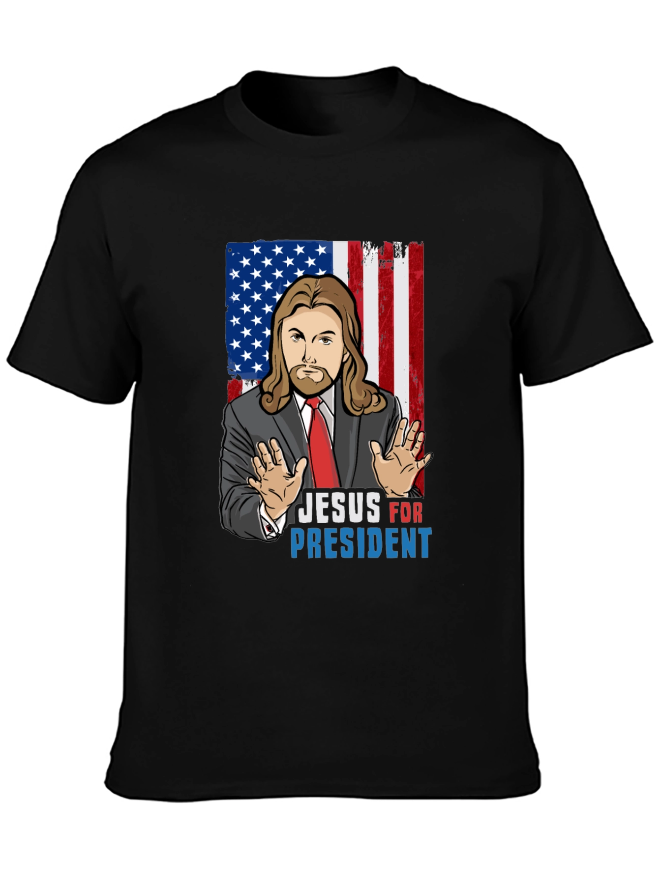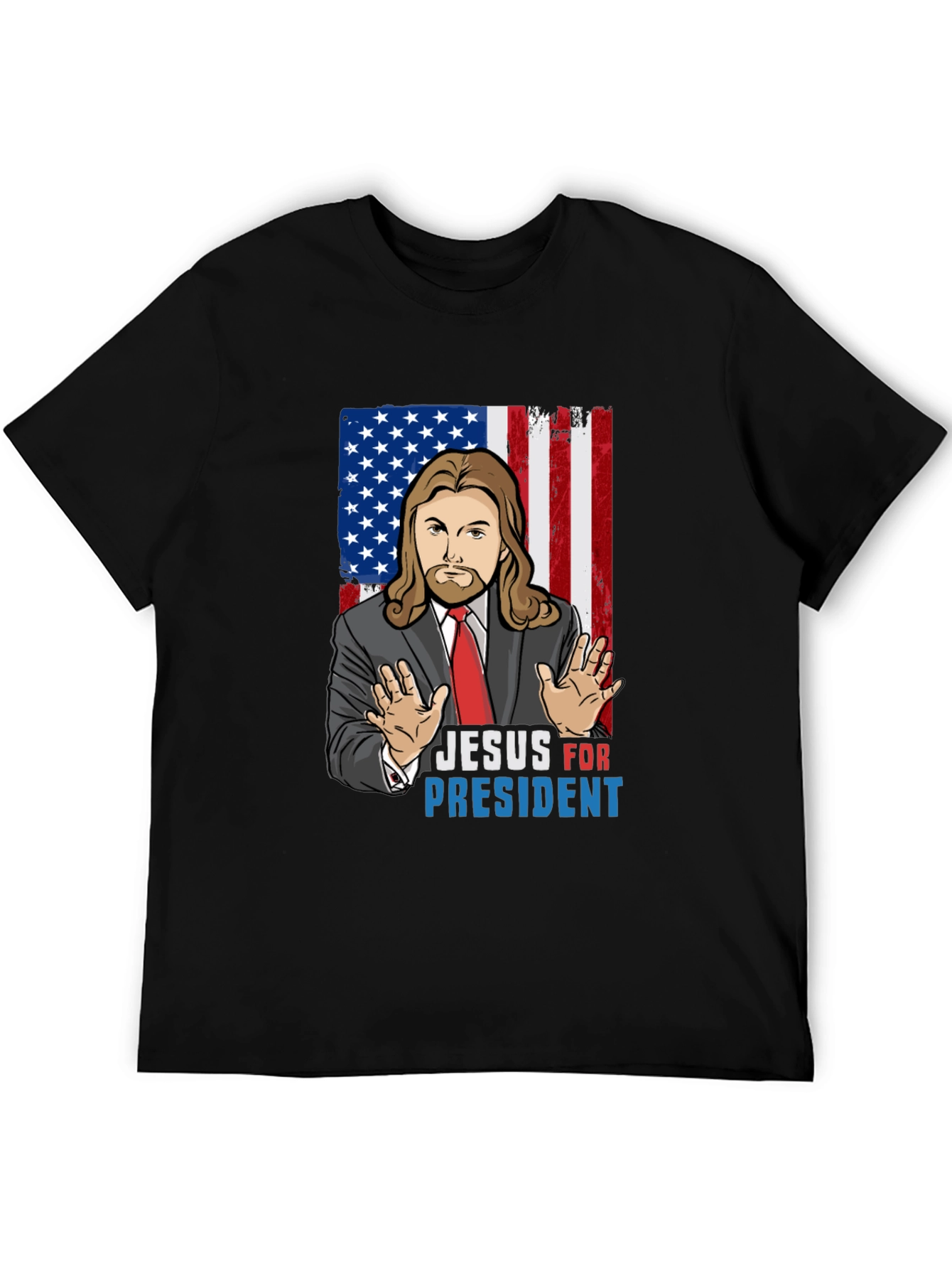 Luce con orgullo esta camiseta negra con un diseño llamativo de Jesús como candidato a la presidencia de Estados Unidos. El estampado combina elementos religiosos con la bandera estadounidense, creando una pieza única y expresiva. Perfecta para aquellos que buscan expresar su fe con un toque de humor y originalidad. Confeccionada en un tejido suave y cómodo, ideal para el uso diario. Muestra tu estilo y tus creencias con esta prenda que no pasará desapercibida en cualquier ocasión. ¡Una declaración de fe con un toque patriótico!