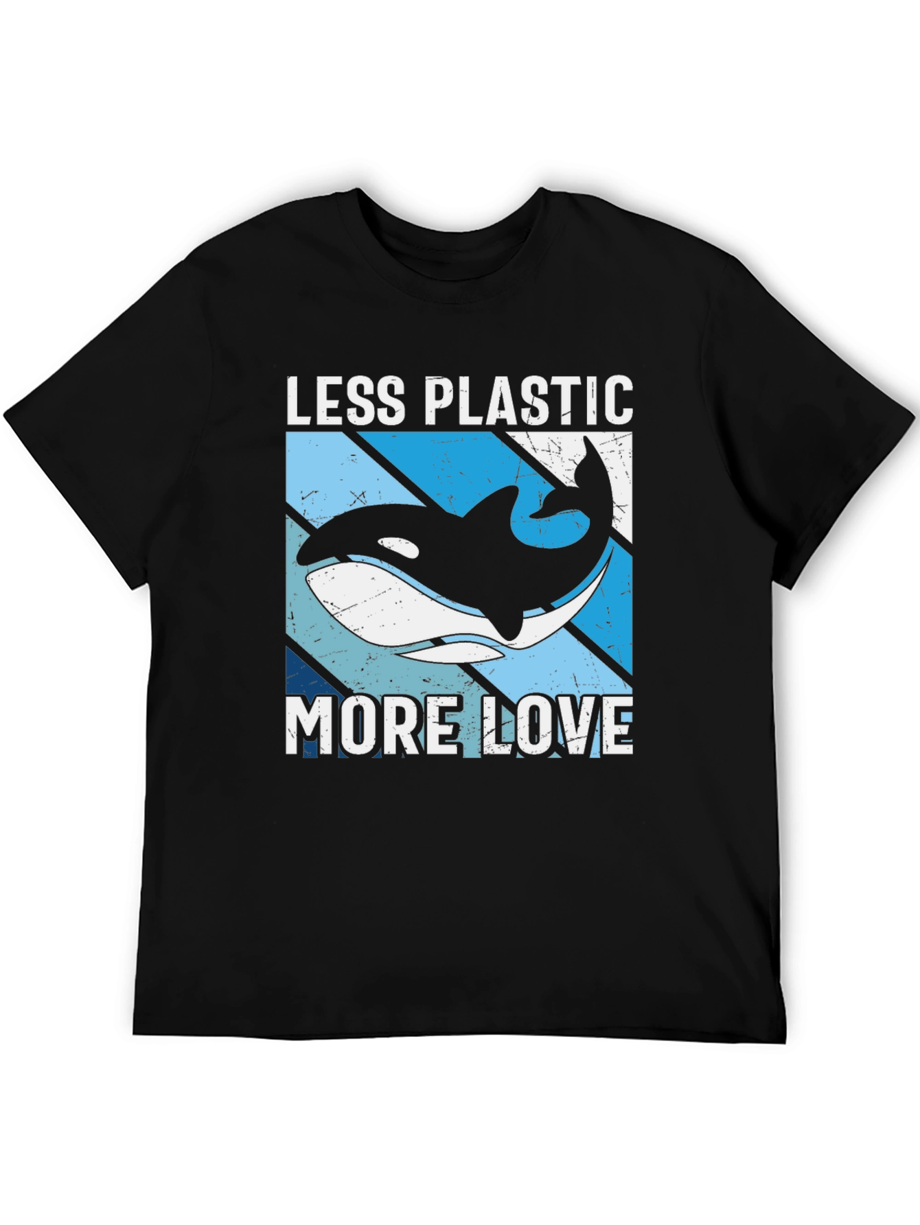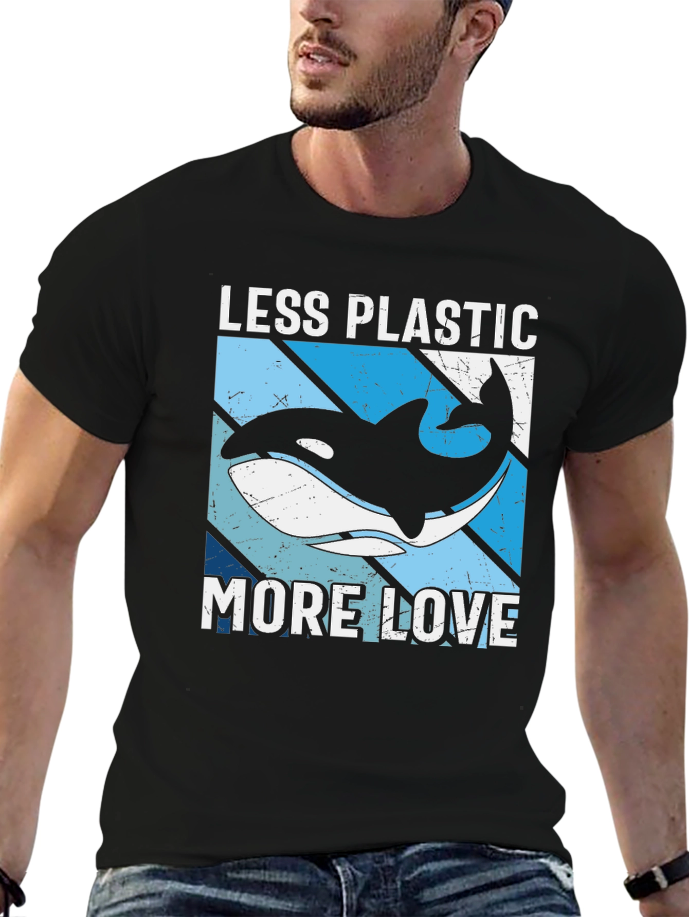 Luce esta original camiseta negra con un diseño llamativo que promueve la conciencia ambiental. Presenta una ilustración de una orca en un recuadro azul con franjas degradadas, acompañada del mensaje "LESS PLASTIC MORE LOVE" en letras blancas estilo retro. Ideal para quienes aman la naturaleza y desean expresar su compromiso con el planeta. Perfecta para uso diario, eventos casuales o como un regalo consciente. Su diseño único te hará destacar mientras transmites un mensaje positivo. ¡Muestra tu apoyo a la conservación marina con estilo!