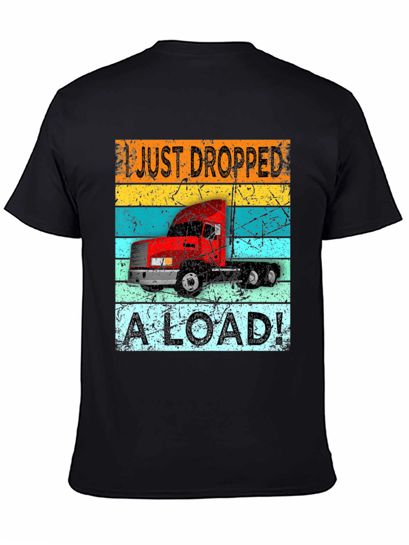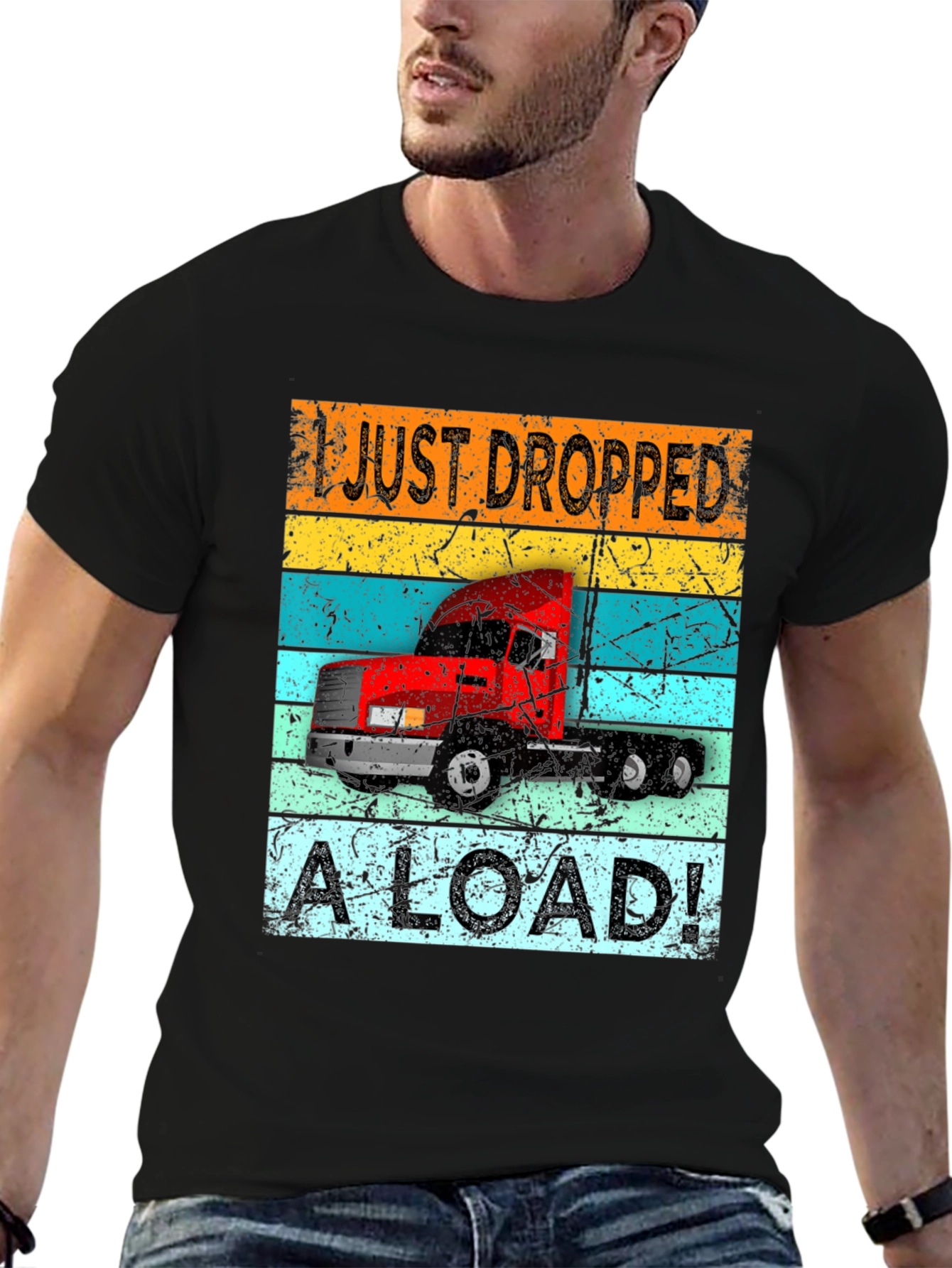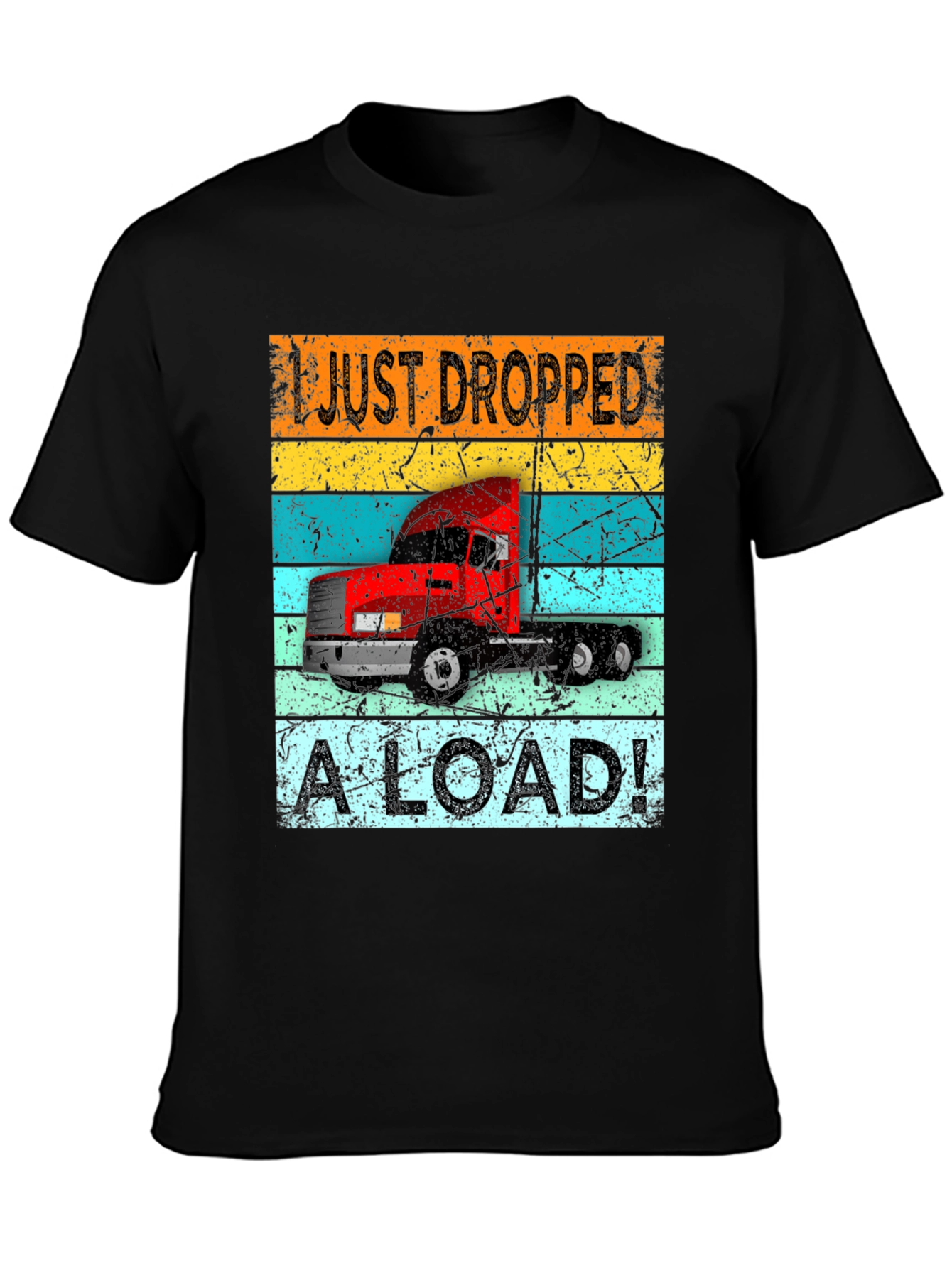 Luce esta llamativa camiseta negra con un diseño único. La camiseta presenta la frase "¡Acabo de Dejar Una Carga!" junto a la ilustración de un camión rojo sobre un fondo retro con franjas de colores. Perfecta para camioneros, amantes de los camiones y aquellos con un sentido del humor audaz. Fabricada con materiales de alta calidad, esta camiseta ofrece comodidad y durabilidad. Su diseño original y divertido la convierte en una excelente opción para el uso diario o para regalar a alguien especial. ¡Atrévete a destacar con esta prenda única y expresa tu pasión por el mundo del transporte!
