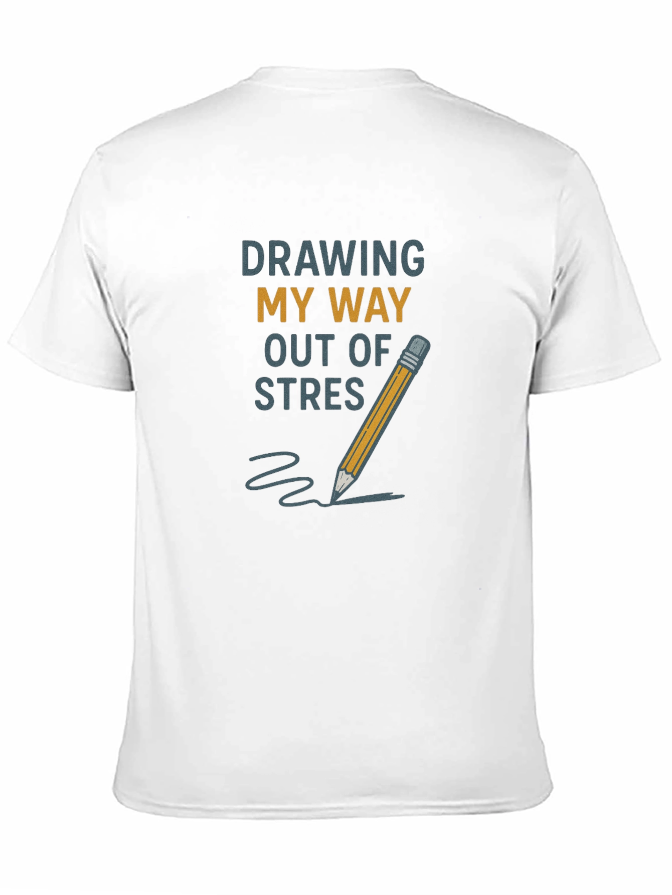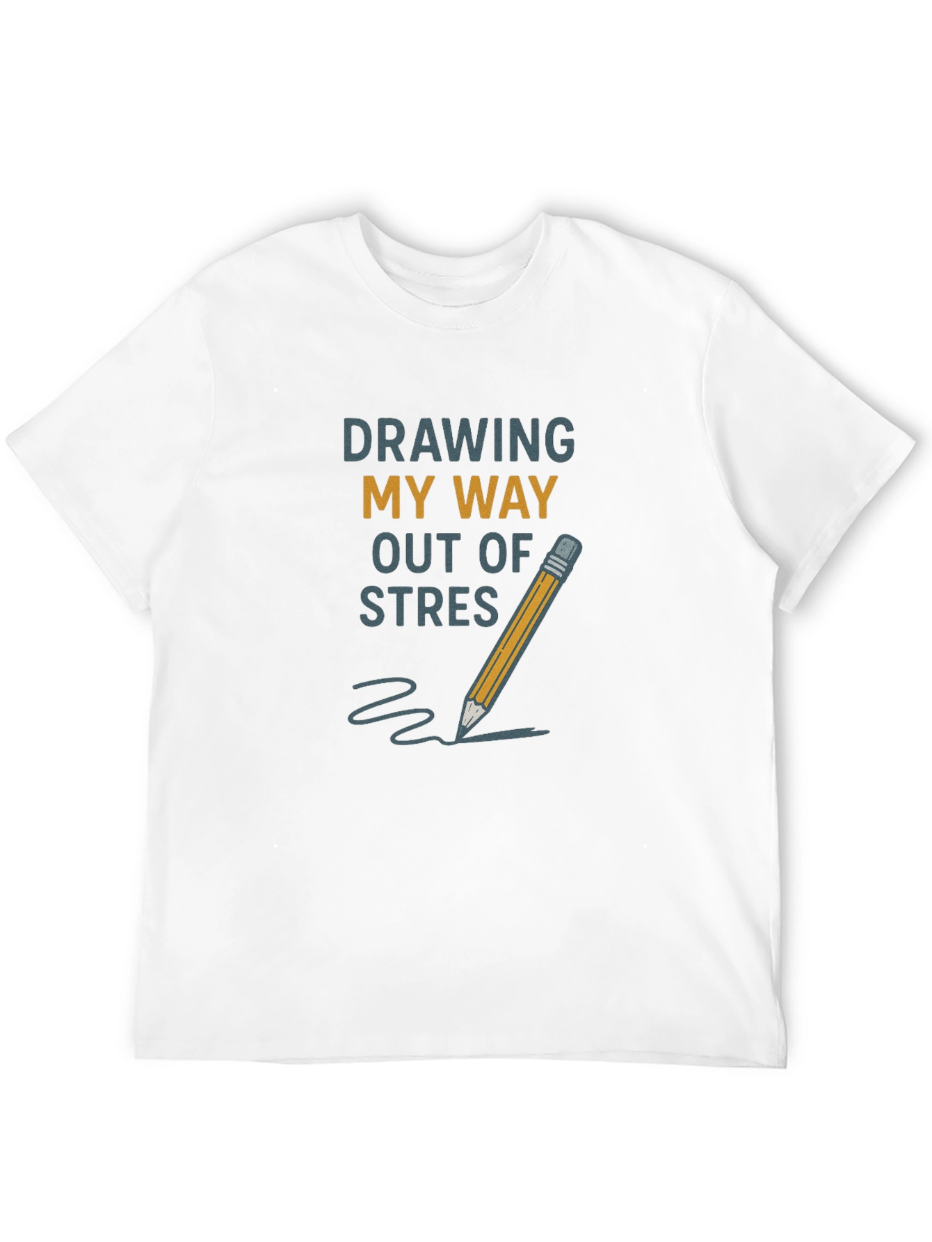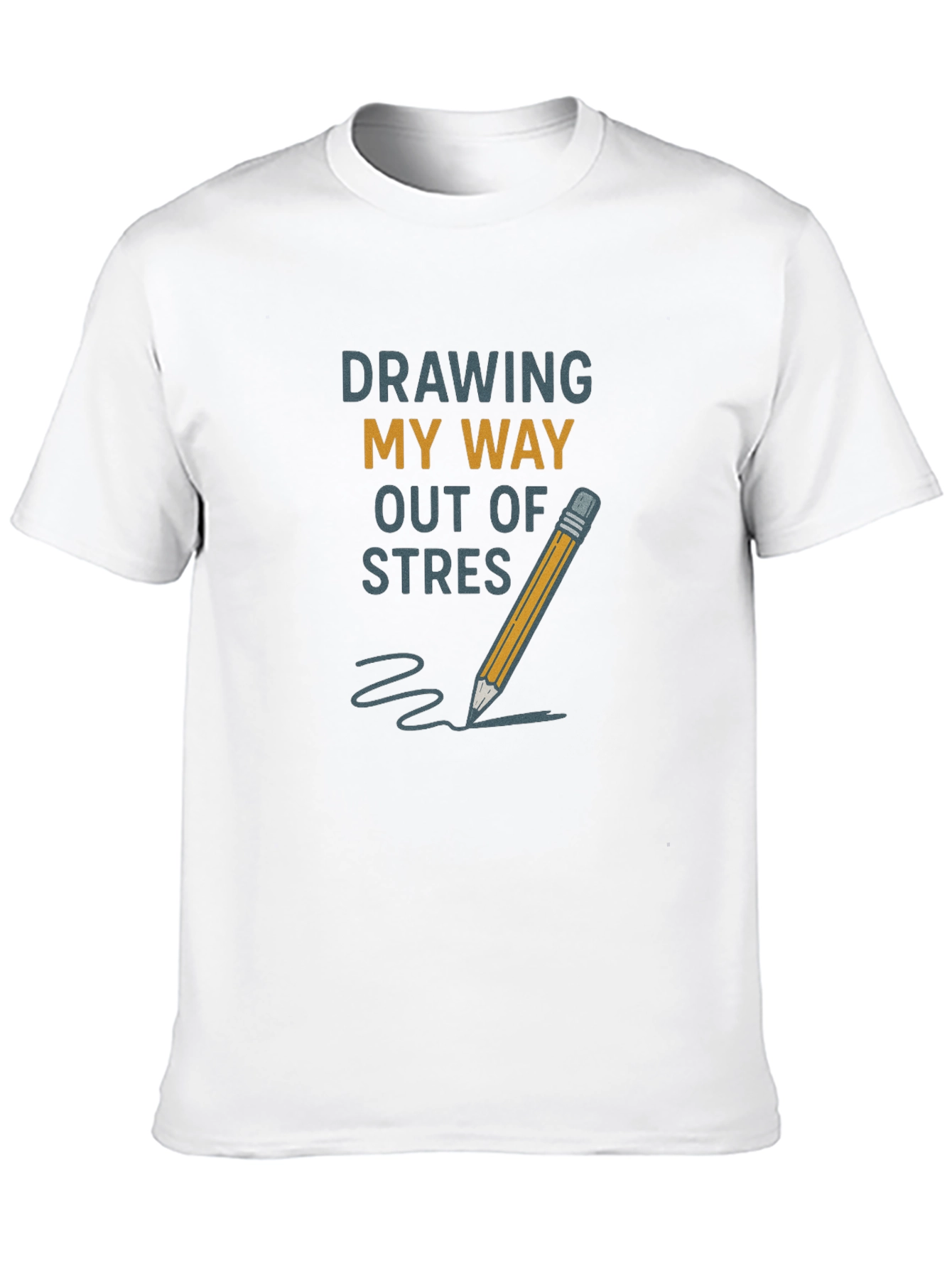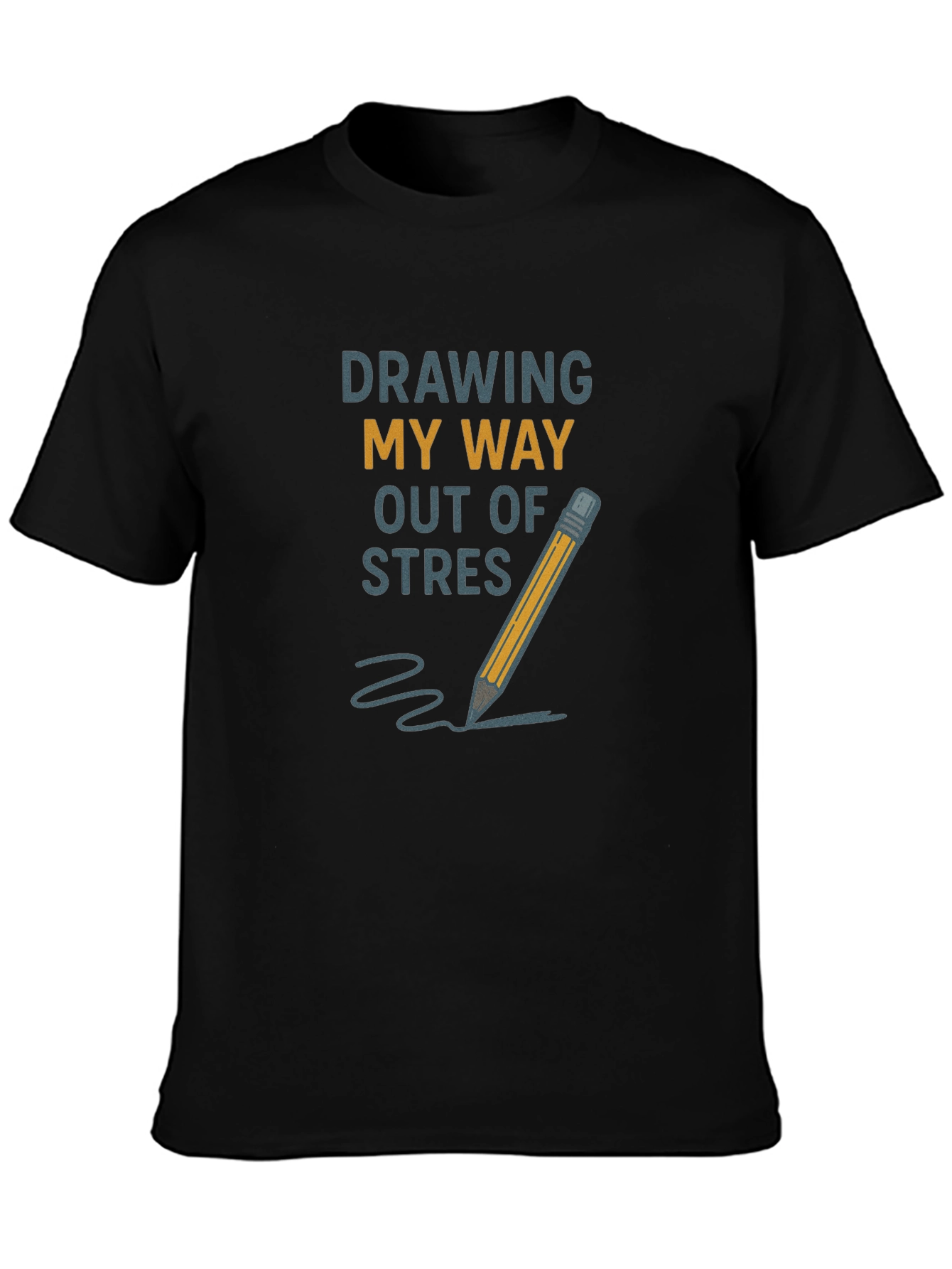 Esta camiseta negra presenta un diseño creativo y relajante. La frase "DRAWING MY WAY OUT OF STRESS" (Dibujando para desestresarme) destaca en colores contrastantes, junto con la ilustración de un lápiz que traza una línea ondulada. Perfecta para artistas, creativos o cualquier persona que encuentre alivio en el arte. Fabricada con un tejido suave y cómodo, esta camiseta de manga corta es ideal para usarla a diario, en clases de arte o simplemente para expresar tu pasión por el dibujo. Su diseño original la convierte en una excelente opción para regalar o para añadir un toque artístico a tu guardarropa.