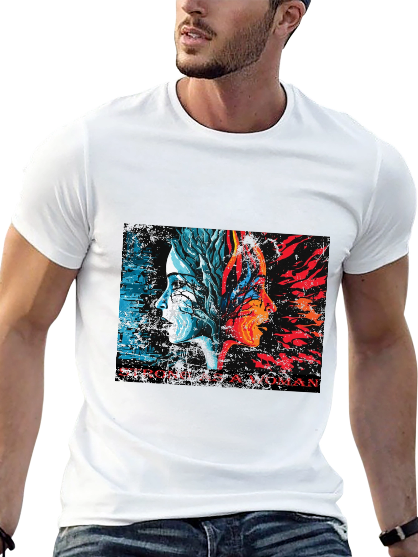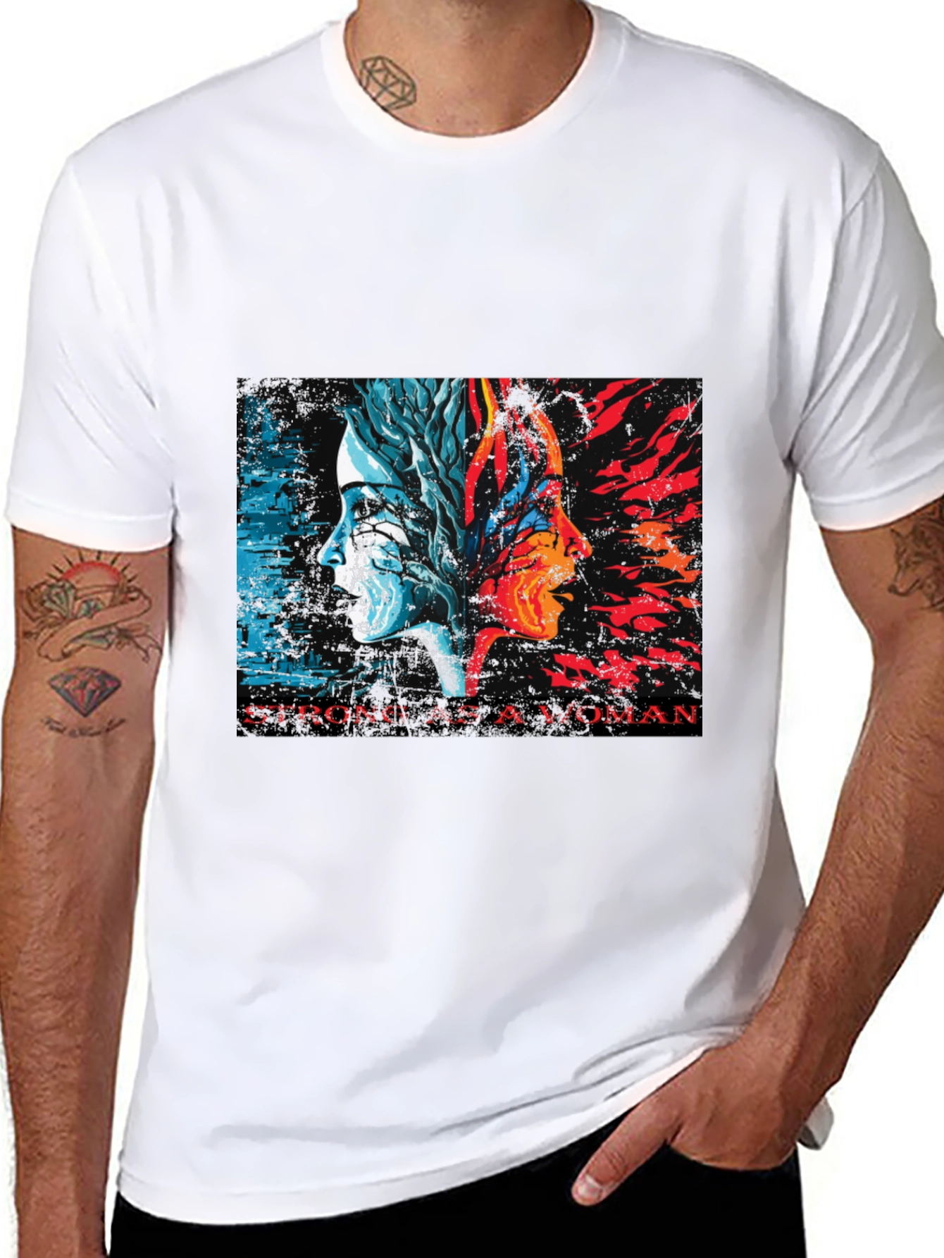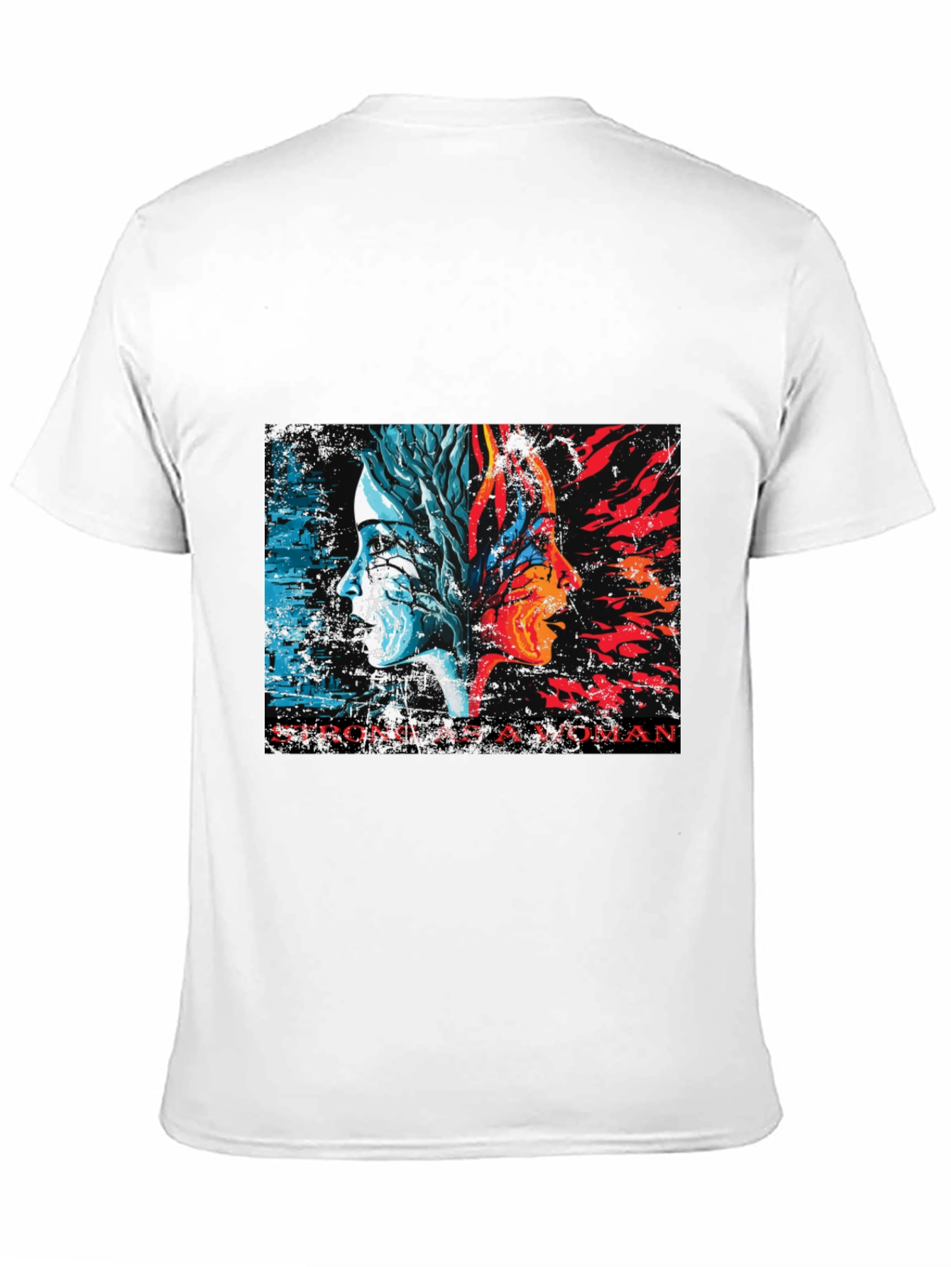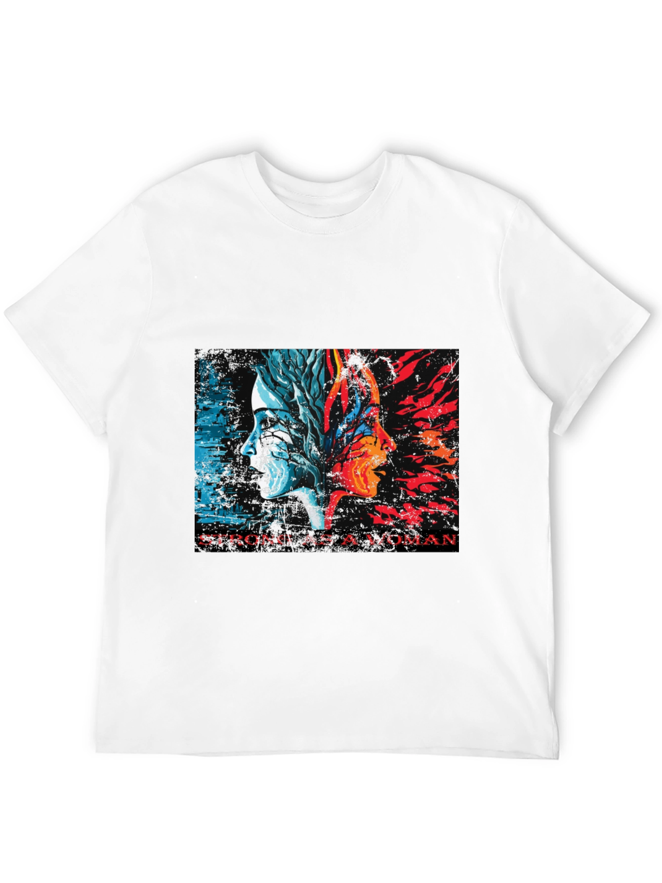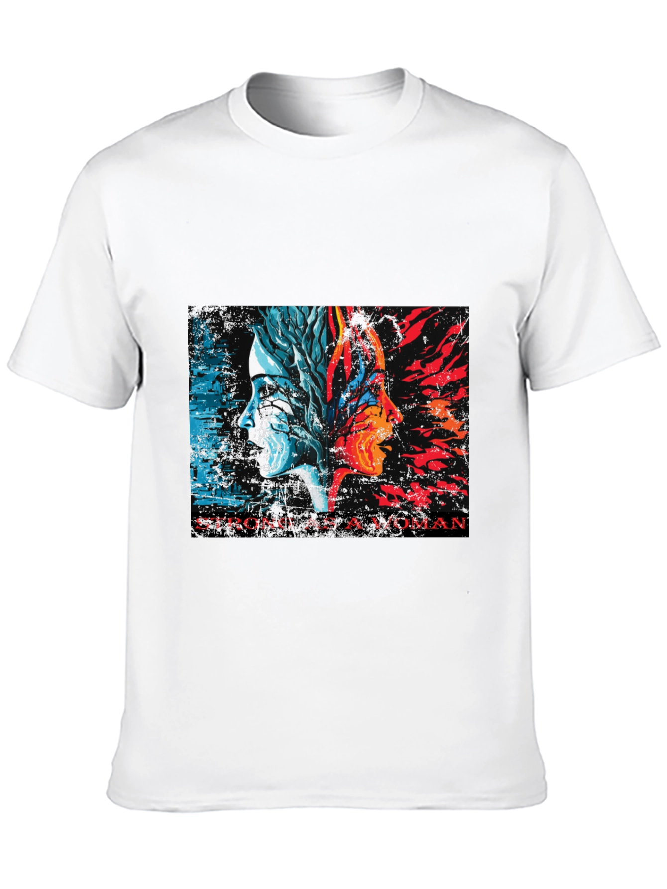 Luce esta impactante camiseta negra con un diseño artístico y poderoso. En el centro, dos perfiles de mujer se fusionan, uno representando la frialdad y la naturaleza con tonos azules y blancos, y el otro la pasión y el fuego en rojos y naranjas vibrantes. La inscripción "STRONG AS A WOMAN" resalta la fuerza y la resiliencia femenina. Fabricada con un tejido suave y cómodo, esta camiseta de corte clásico es ideal para el uso diario. Perfecta para expresar tu individualidad y apoyar el empoderamiento femenino. Úsala para un look casual con jeans, o combínala con una chaqueta para un estilo más moderno. Una prenda única que no pasará desapercibida.