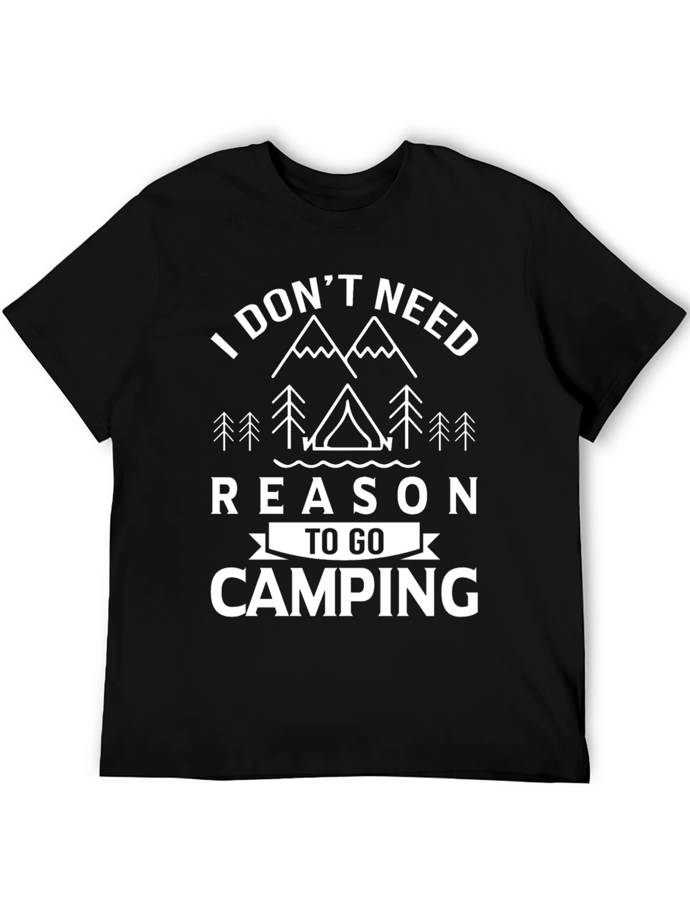 Esta camiseta negra de manga corta presenta un diseño llamativo en color blanco. El estampado dice: "I DON'T NEED REASON TO GO CAMPING" (No necesito una razón para ir a acampar), con gráficos de montañas, árboles y una tienda de campaña. Es perfecta para los amantes de la naturaleza y las actividades al aire libre. Su diseño simple y atractivo la hace ideal para usar en campamentos, caminatas o simplemente para expresar tu pasión por la aventura en tu día a día. Fabricada con materiales cómodos y duraderos. Ideal para un look casual y relajado.