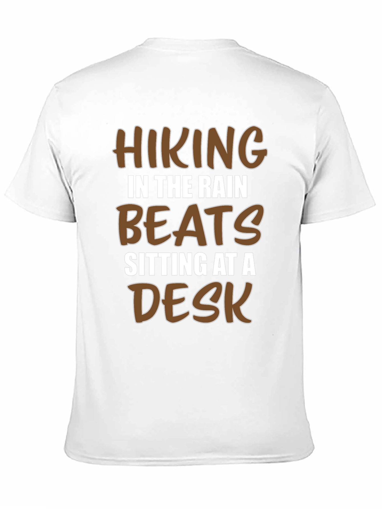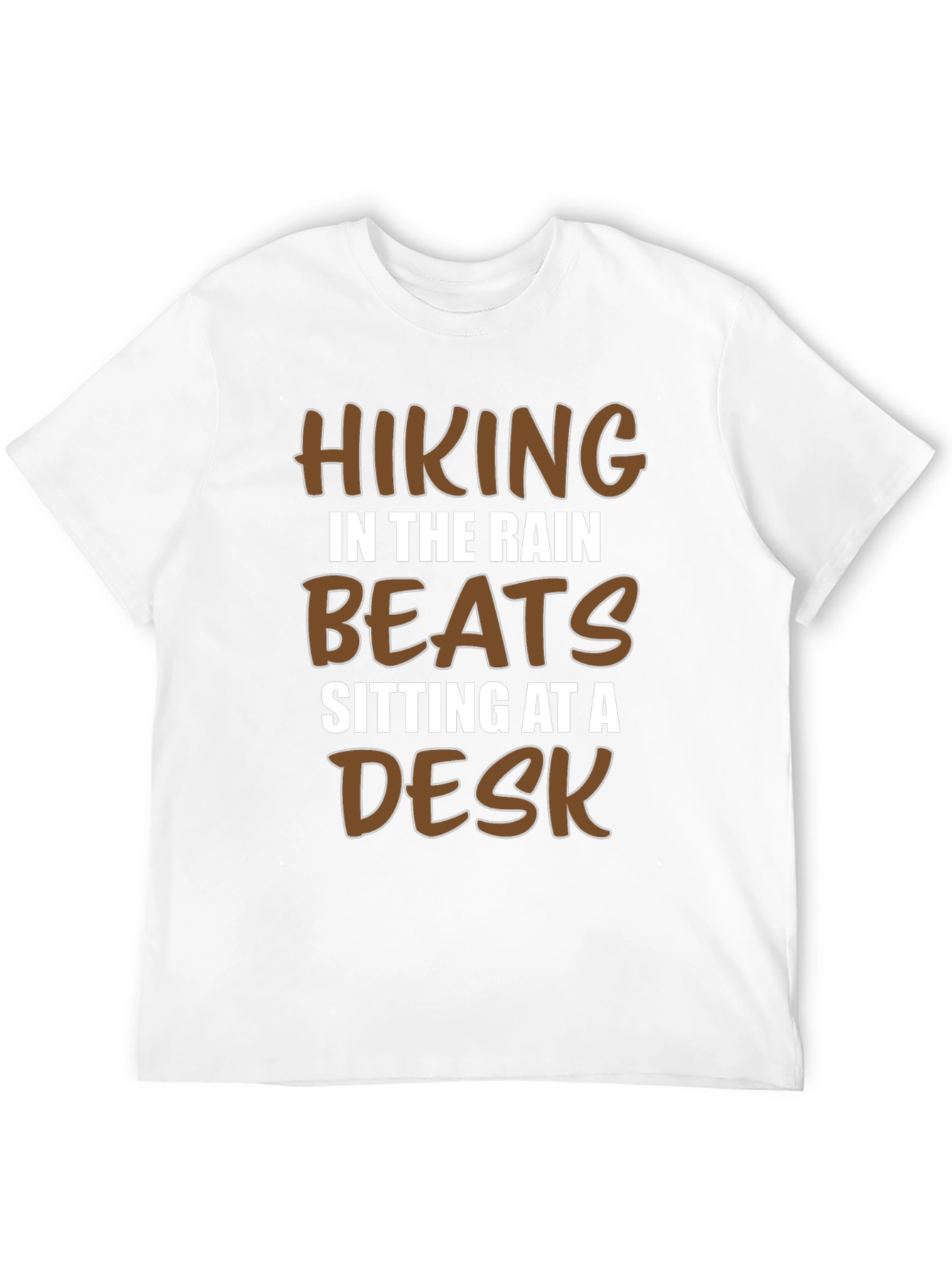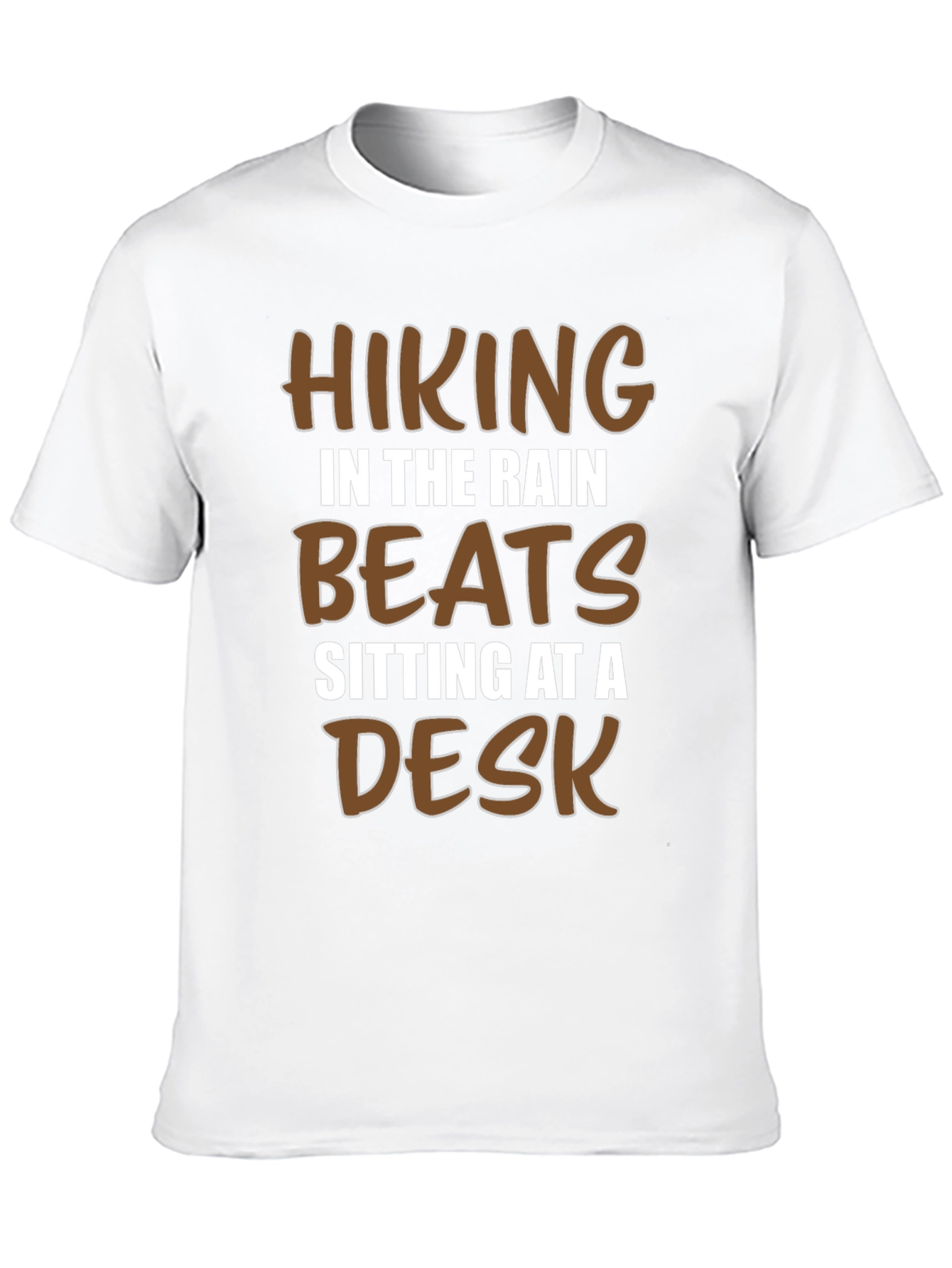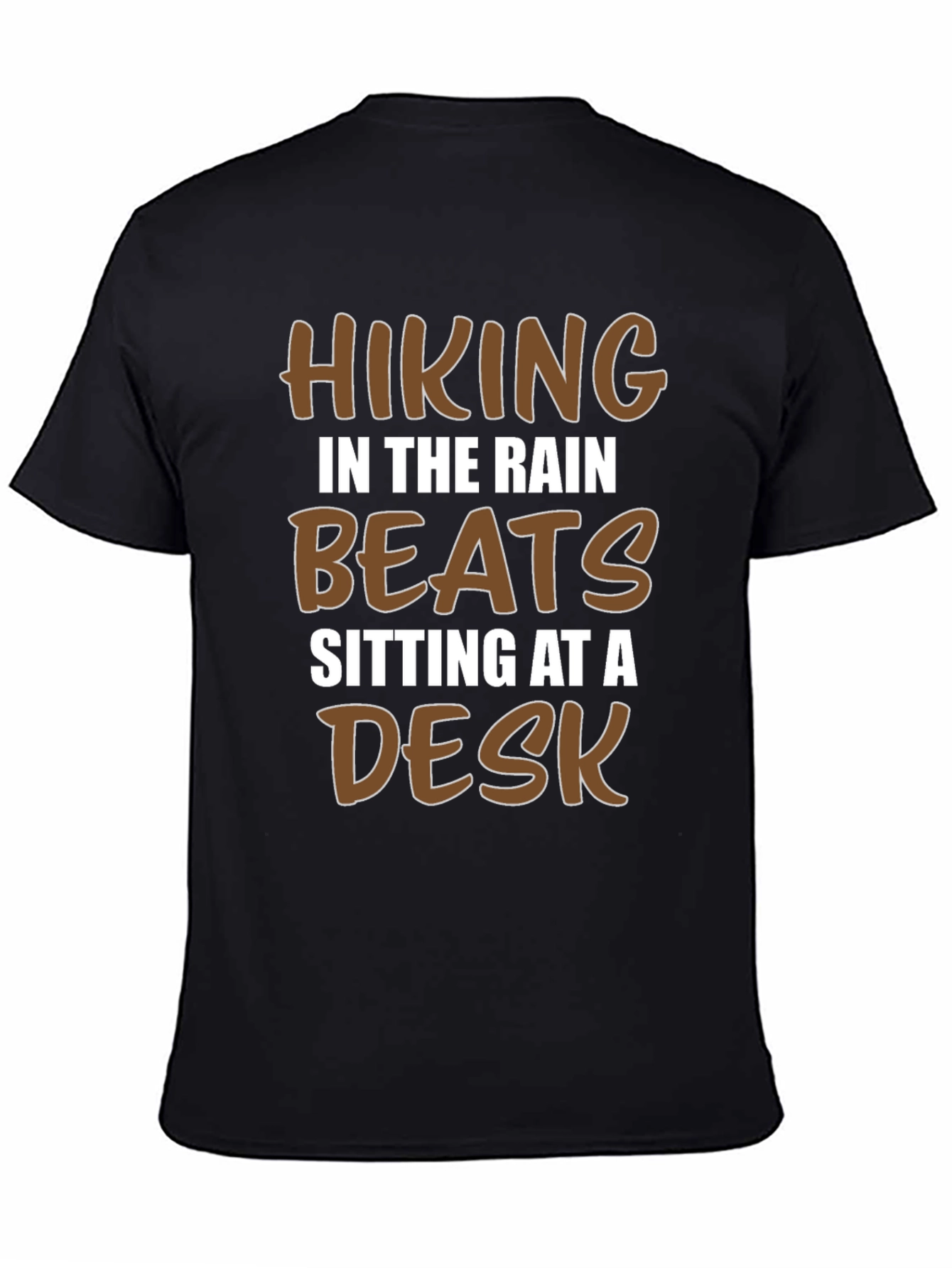 Luce esta llamativa camiseta negra con un diseño que celebra el espíritu aventurero. Presenta un texto en color marrón y blanco que dice "HIKING IN THE RAIN BEATS SITTING AT A DESK" (Senderismo bajo la lluvia es mejor que estar sentado en un escritorio), ideal para los amantes de la naturaleza y el senderismo. Perfecta para un look casual, esta camiseta es cómoda y expresa tu pasión por las actividades al aire libre. ¡Muestra tu amor por la aventura con esta prenda única!