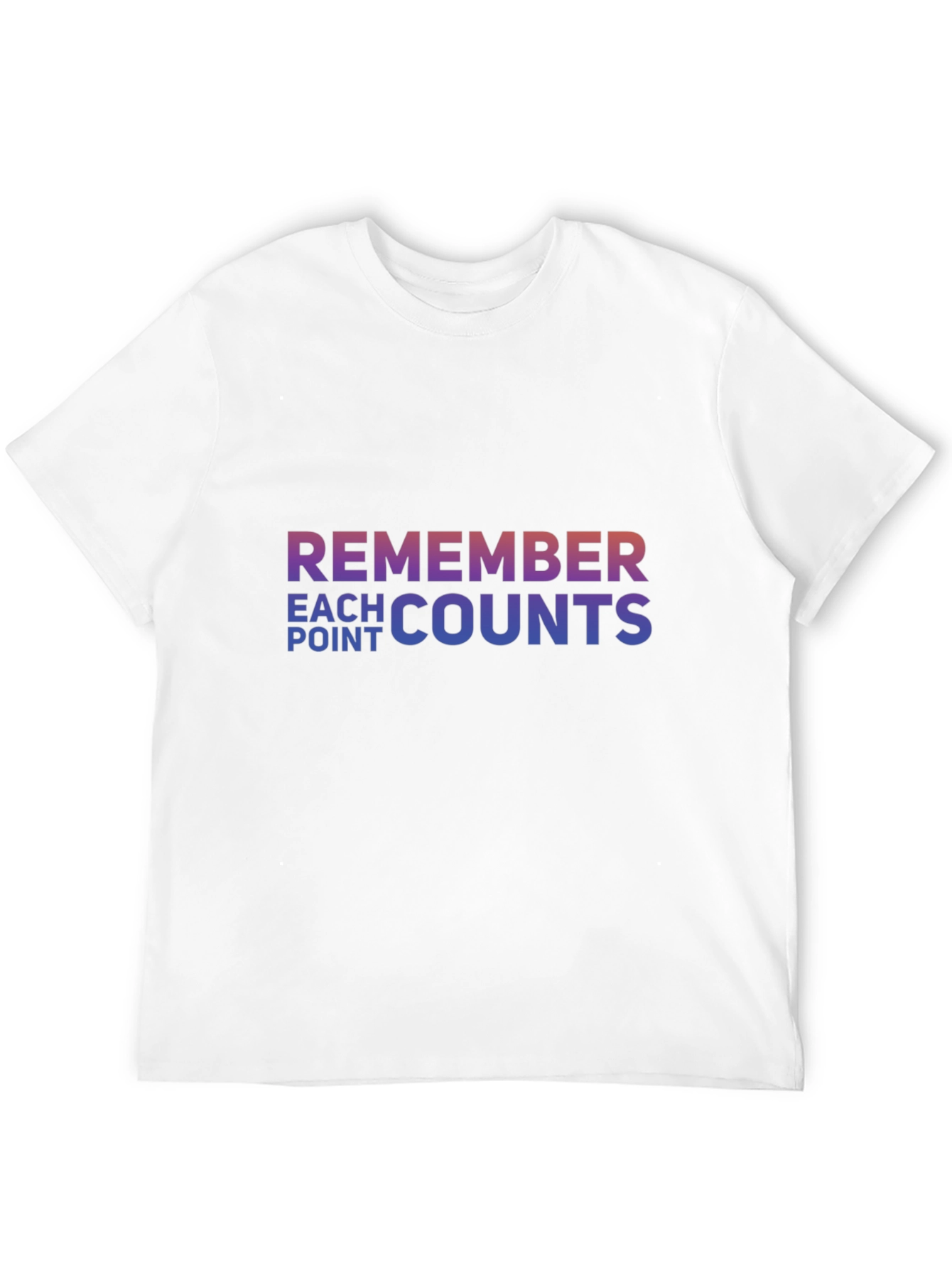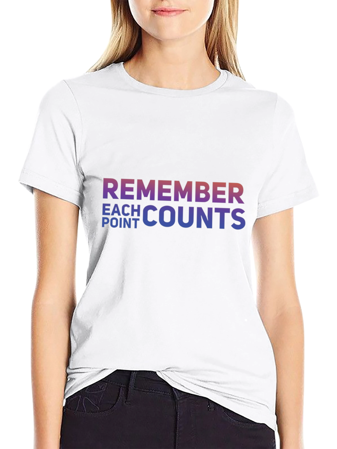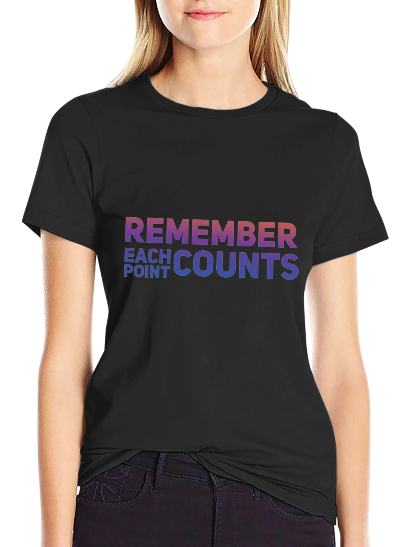 Luce esta moderna camiseta negra con un diseño motivacional que dice "Remember Each Point Counts" con un degradado de color que va desde el rosa hasta el azul. Ideal para usar en el gimnasio, durante tus entrenamientos, o para un estilo casual en el día a día. Su tejido suave y cómodo te permitirá moverte con libertad. Demuestra tu pasión por el deporte y tu mentalidad ganadora con esta prenda única.