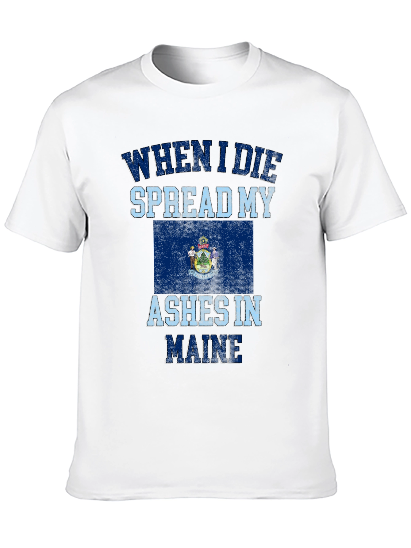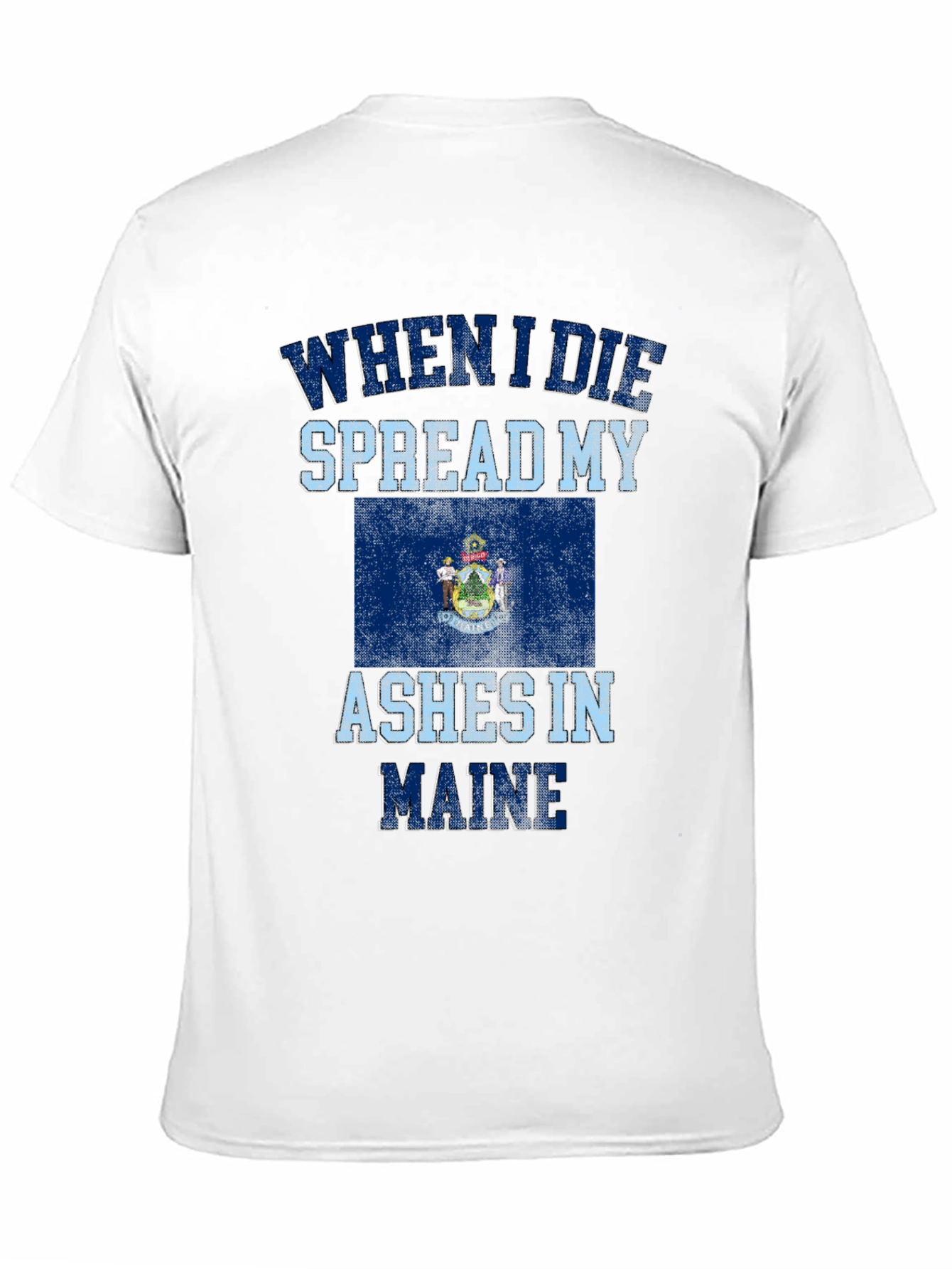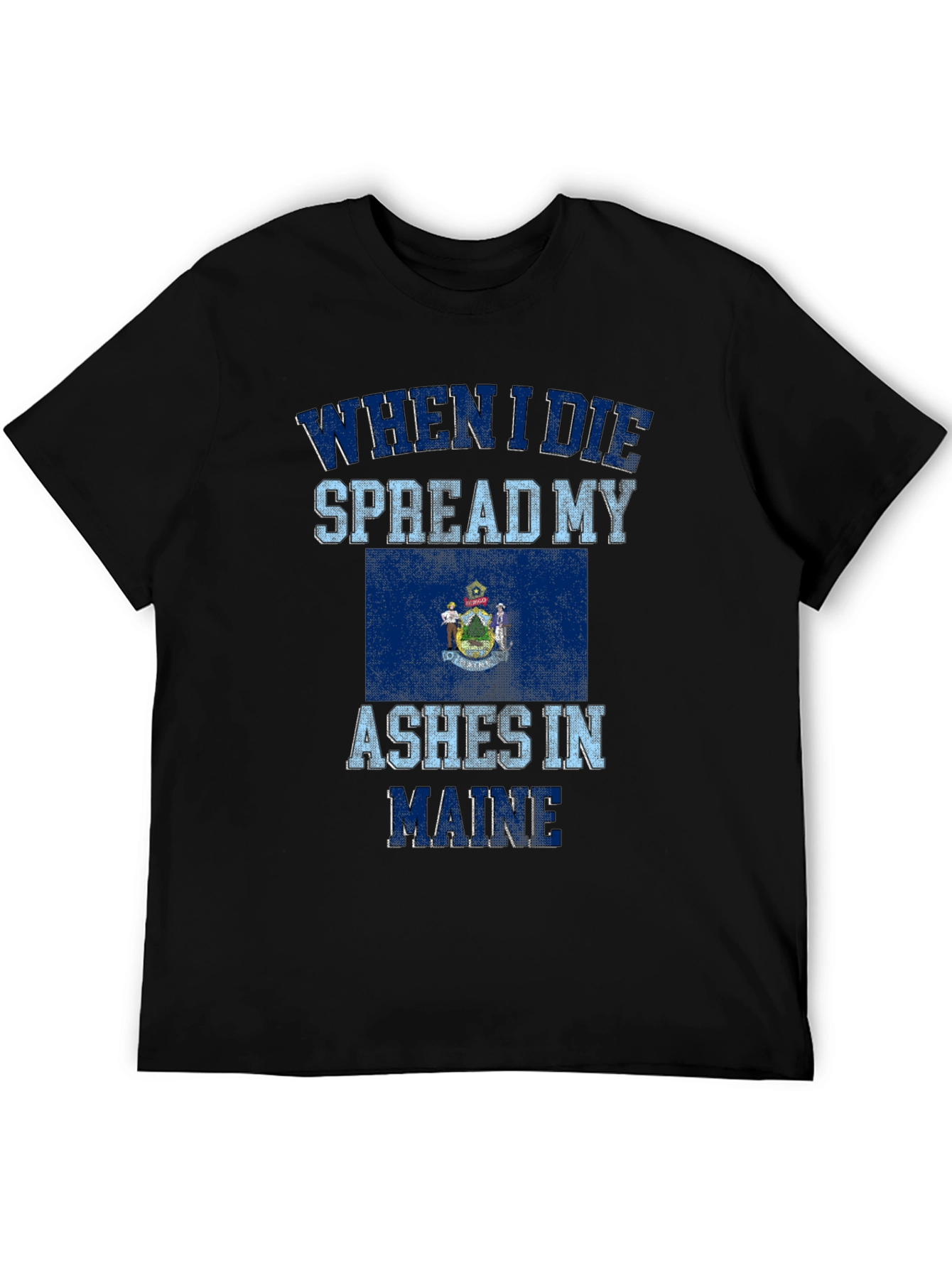 Luce esta original camiseta negra con un diseño patriótico y un toque de humor. En el pecho, destaca la frase "When I Die Spread My Ashes in Maine" (Cuando muera, esparce mis cenizas en Maine), con un estilo de letras vintage en color azul y la bandera del estado de Maine como fondo. Fabricada con materiales suaves y cómodos, esta camiseta de manga corta es perfecta para el uso diario, salidas casuales o para mostrar tu amor por Maine con un toque divertido. Ideal para hombres con estilo y sentido del humor. Una prenda única que sin duda llamará la atención.