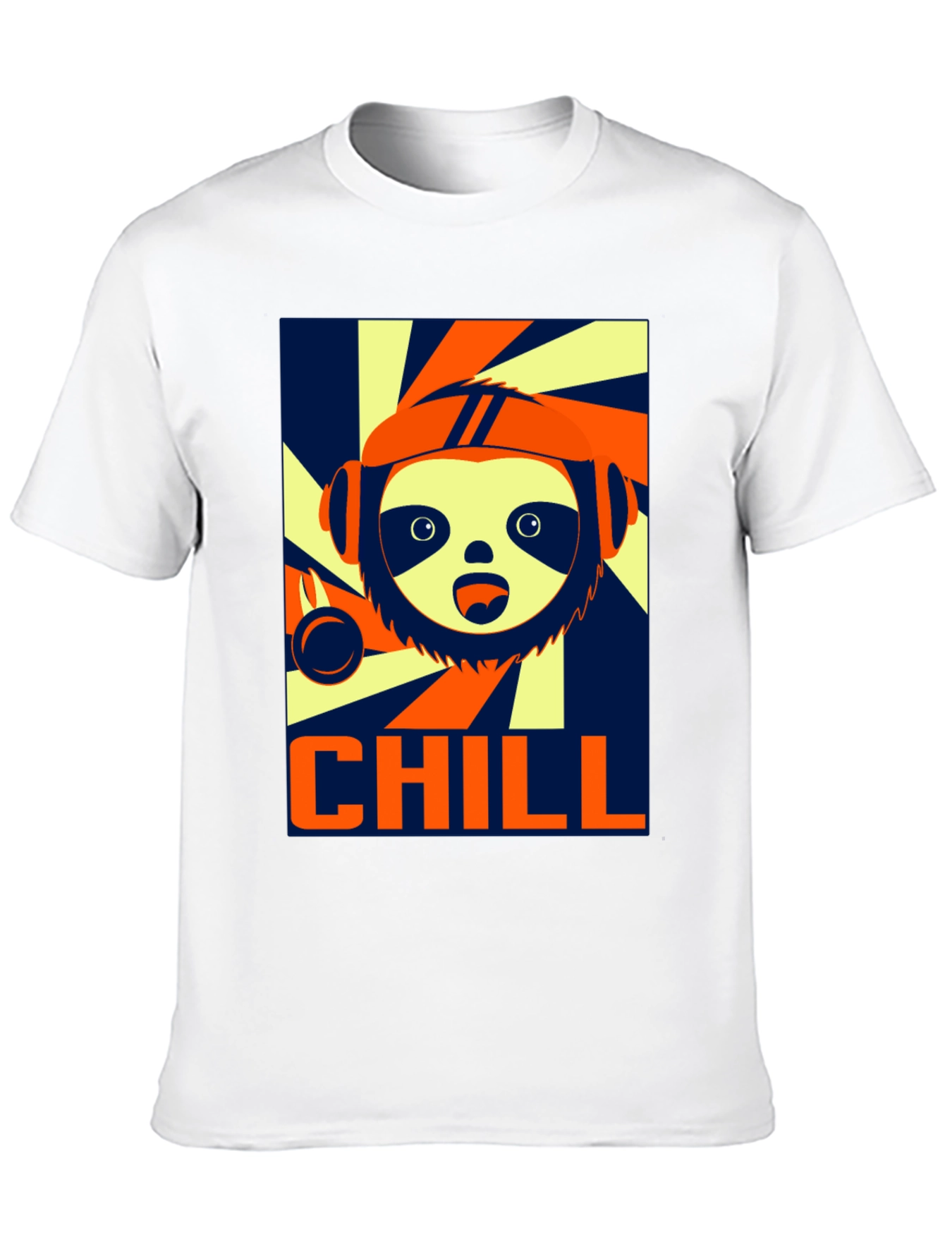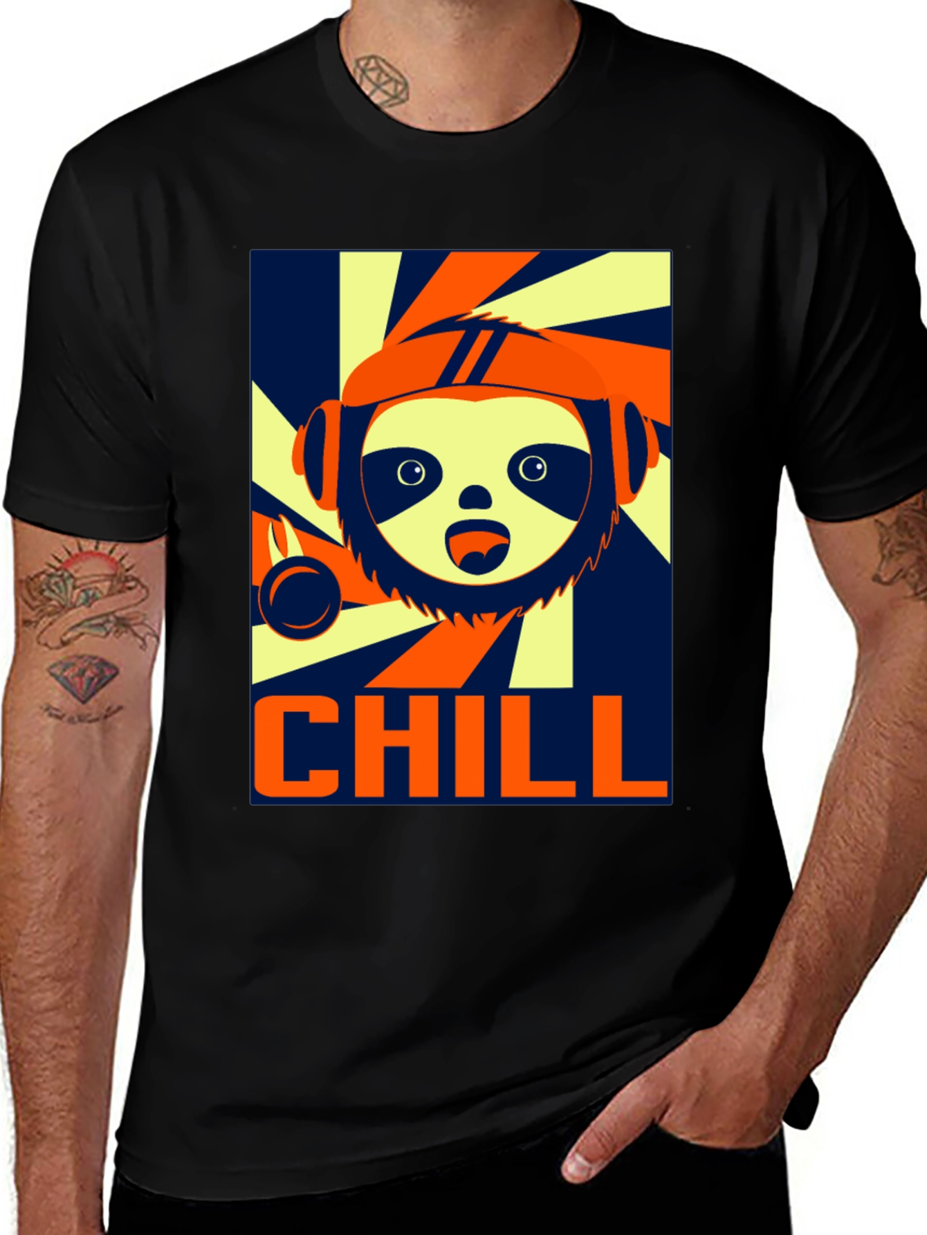¡Relájate con estilo! Esta camiseta negra presenta un diseño moderno y llamativo de un perezoso con audífonos, perfecto para los amantes de la música y el buen humor. La palabra 'CHILL' impresa debajo del diseño refuerza el mensaje relajado. Ideal para usar en casa, salir con amigos o simplemente para expresar tu personalidad relajada y divertida. Fabricada con materiales suaves y cómodos, esta camiseta es perfecta para el uso diario. Añade un toque único y desenfadado a tu guardarropa con esta prenda que seguro llamará la atención.