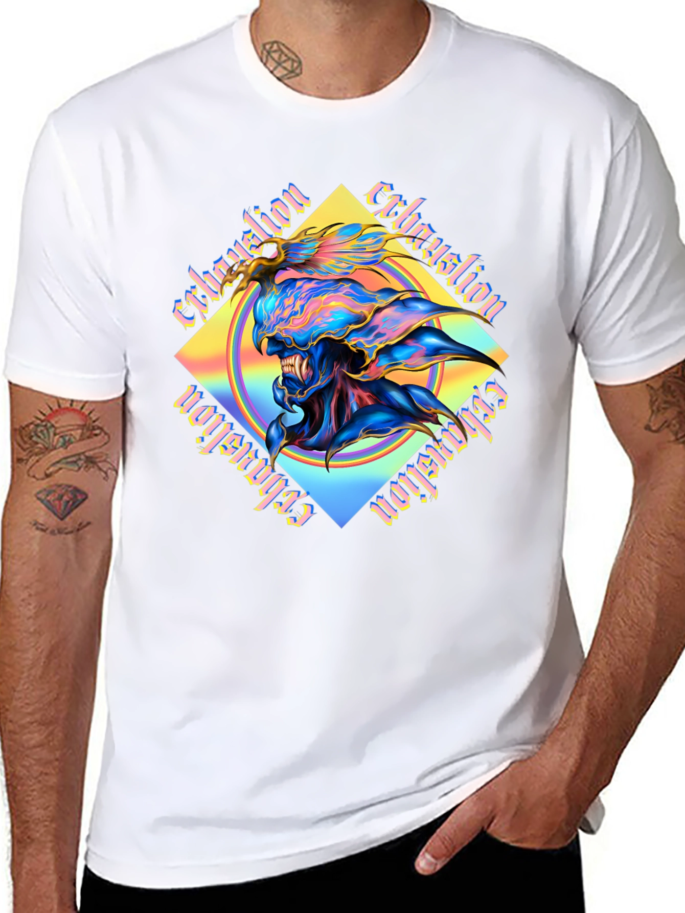 Esta camiseta negra de corte clásico presenta un llamativo diseño abstracto en el pecho. El motivo central consiste en una figura espectral con detalles iridiscentes, enmarcada dentro de un rombo con la palabra 'exhaustion'. Los colores vibrantes y el diseño original hacen de esta camiseta una pieza única para destacar en cualquier ocasión casual. Perfecta para expresar tu individualidad y estilo vanguardista. Ideal para combinar con jeans o pantalones oscuros para un look moderno y cómodo.