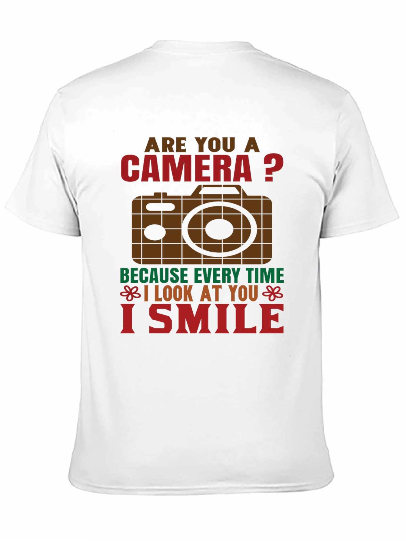 Esta camiseta negra de manga corta presenta un diseño original y llamativo. En el centro, destaca la ilustración de una cámara de estilo retro en color marrón, complementada con una frase ingeniosa y romántica: "Are you a camera? Because every time I look at you I smile". La frase combina colores rojo y verde, creando un contraste visual atractivo. Ideal para los amantes de la fotografía o para aquellos que buscan una prenda con un toque original y divertido. Perfecta para llevar en el día a día, expresar tu personalidad y contagiar sonrisas a tu alrededor. Confeccionada con materiales cómodos y duraderos, esta camiseta se convertirá en tu favorita para cualquier ocasión casual.