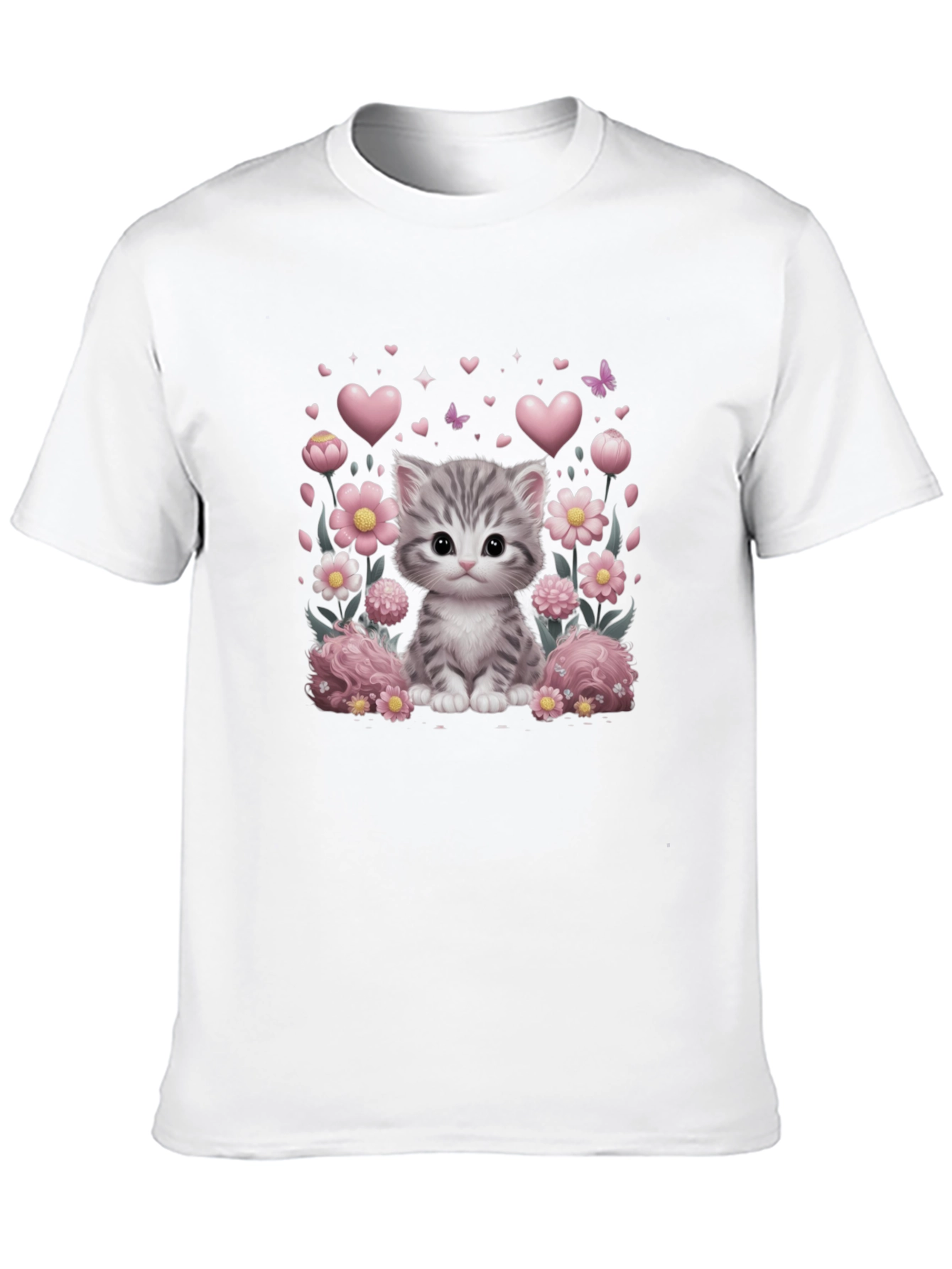 ¡Luce esta adorable camiseta negra con un diseño encantador! Presenta un tierno gatito gris atigrado rodeado de flores rosas, corazones y mariposas. Perfecta para los amantes de los gatos y aquellos que buscan un toque dulce y femenino en su vestuario. Confeccionada en un tejido suave y cómodo, esta camiseta es ideal para usar a diario, ya sea para salir con amigos, relajarte en casa o como un regalo especial para alguien querido. Su diseño único y llamativo te hará destacar con estilo y ternura. ¡Añádela a tu colección y expresa tu amor por los felinos con esta prenda adorable!