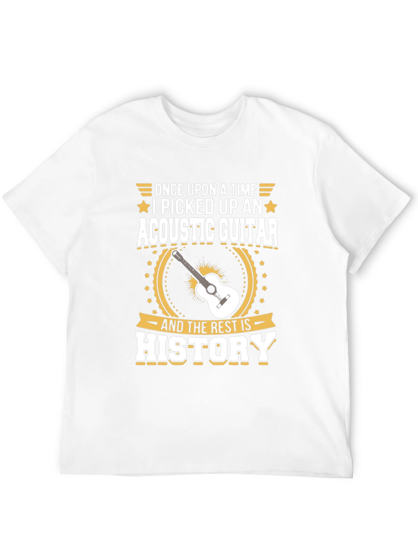Esta camiseta negra presenta un llamativo diseño centrado en la música. En la parte delantera, se destaca una ilustración de una guitarra acústica blanca rodeada de elementos gráficos dorados. La frase "ONCE UPON A TIME I PICKED UP AN ACOUSTIC GUITAR AND THE REST IS HISTORY" está impresa con un estilo audaz y legible, agregando un toque divertido y nostálgico. Ideal para los amantes de la música y guitarristas, esta camiseta es perfecta para usar en conciertos, reuniones informales o simplemente para expresar tu pasión por la música. El diseño llamativo y la tela cómoda la convierten en una prenda imprescindible en cualquier guardarropa casual.