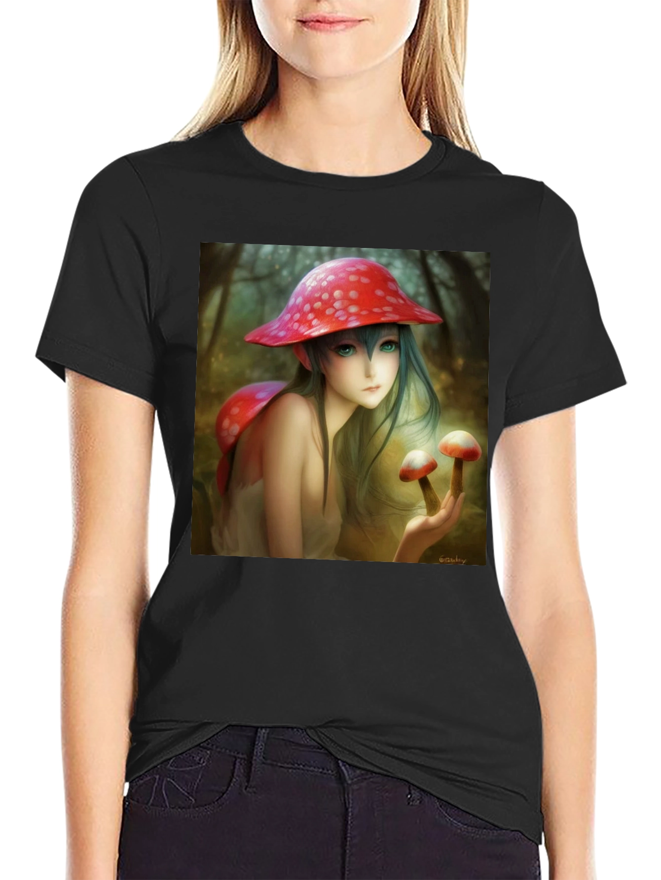 Camiseta Negra con Diseño de Hada de Hongos