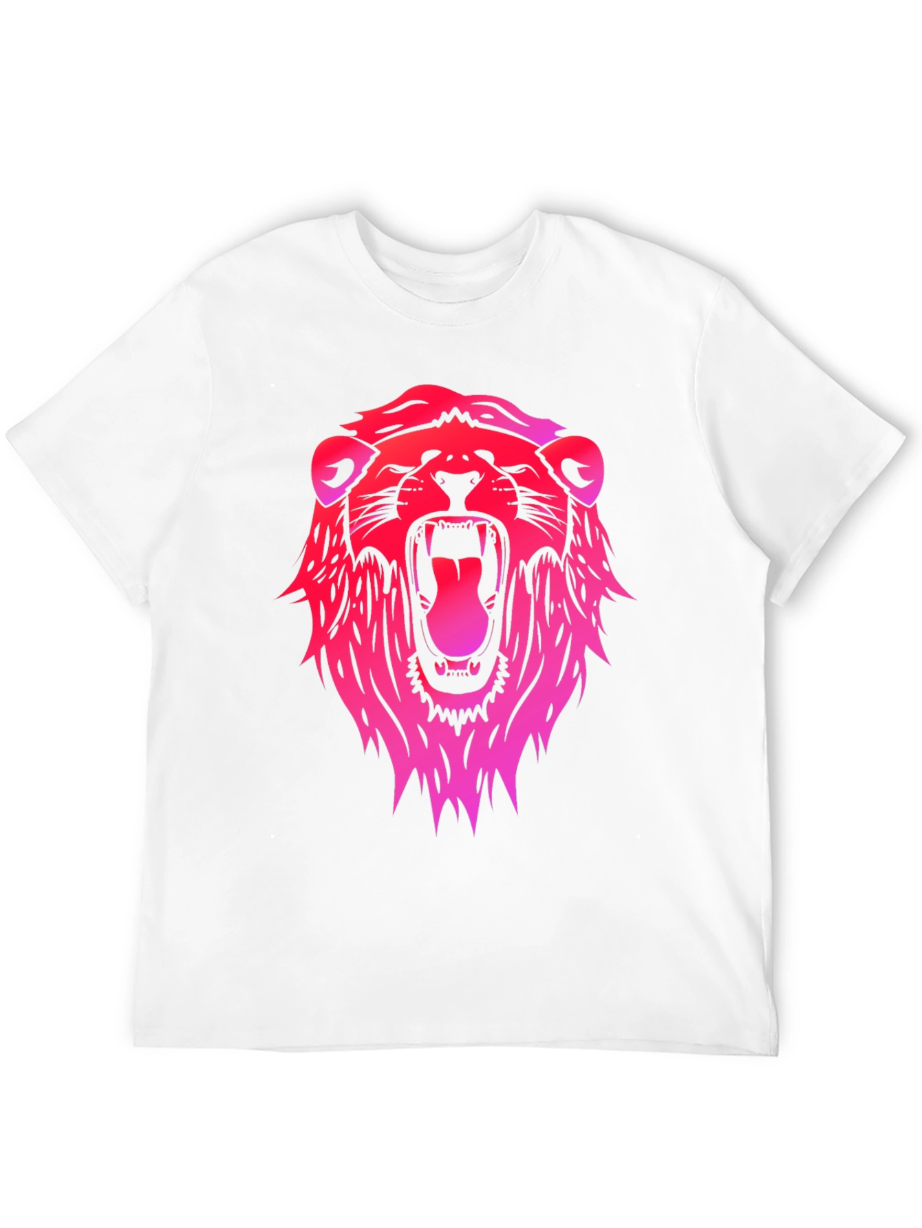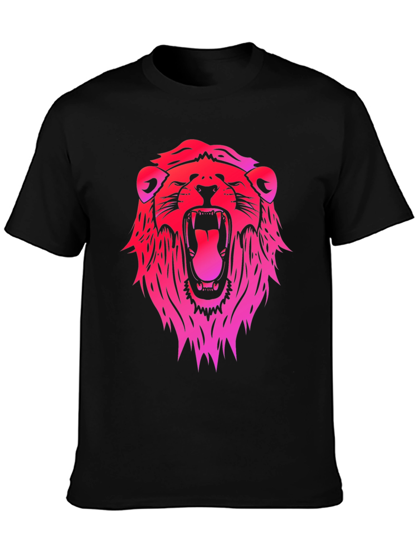 Luce un estilo audaz con esta camiseta negra de manga corta. El diseño presenta un impactante león rugiente en colores degradados que van del rosa al rojo, capturando la atención al instante. Ideal para quienes buscan expresar su personalidad con prendas llamativas. Fabricada con materiales de alta calidad para asegurar comodidad y durabilidad. Perfecta para un look casual, conciertos o cualquier ocasión donde quieras destacar. Combínala con jeans o pantalones negros para un outfit moderno y sofisticado. ¡Atrévete a mostrar tu lado salvaje!