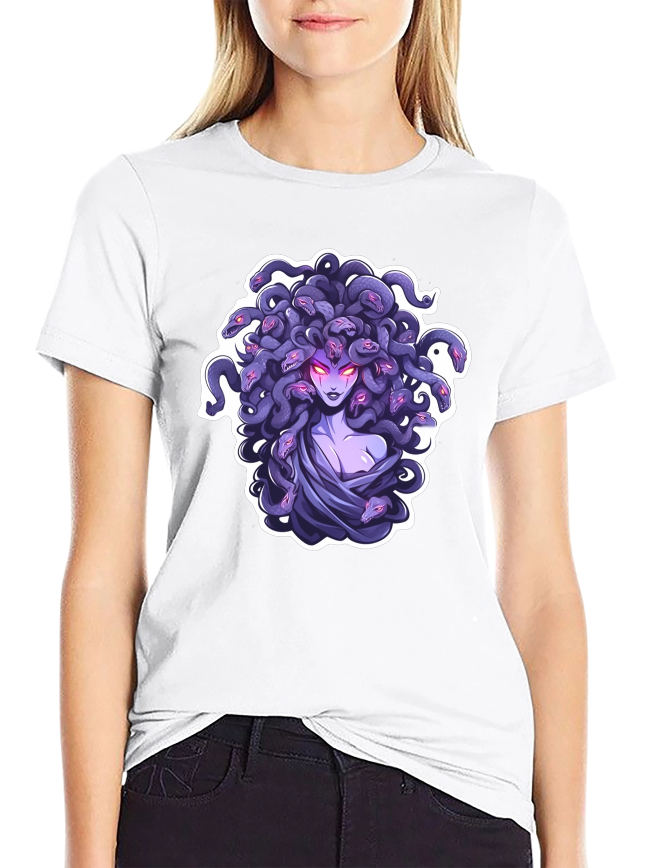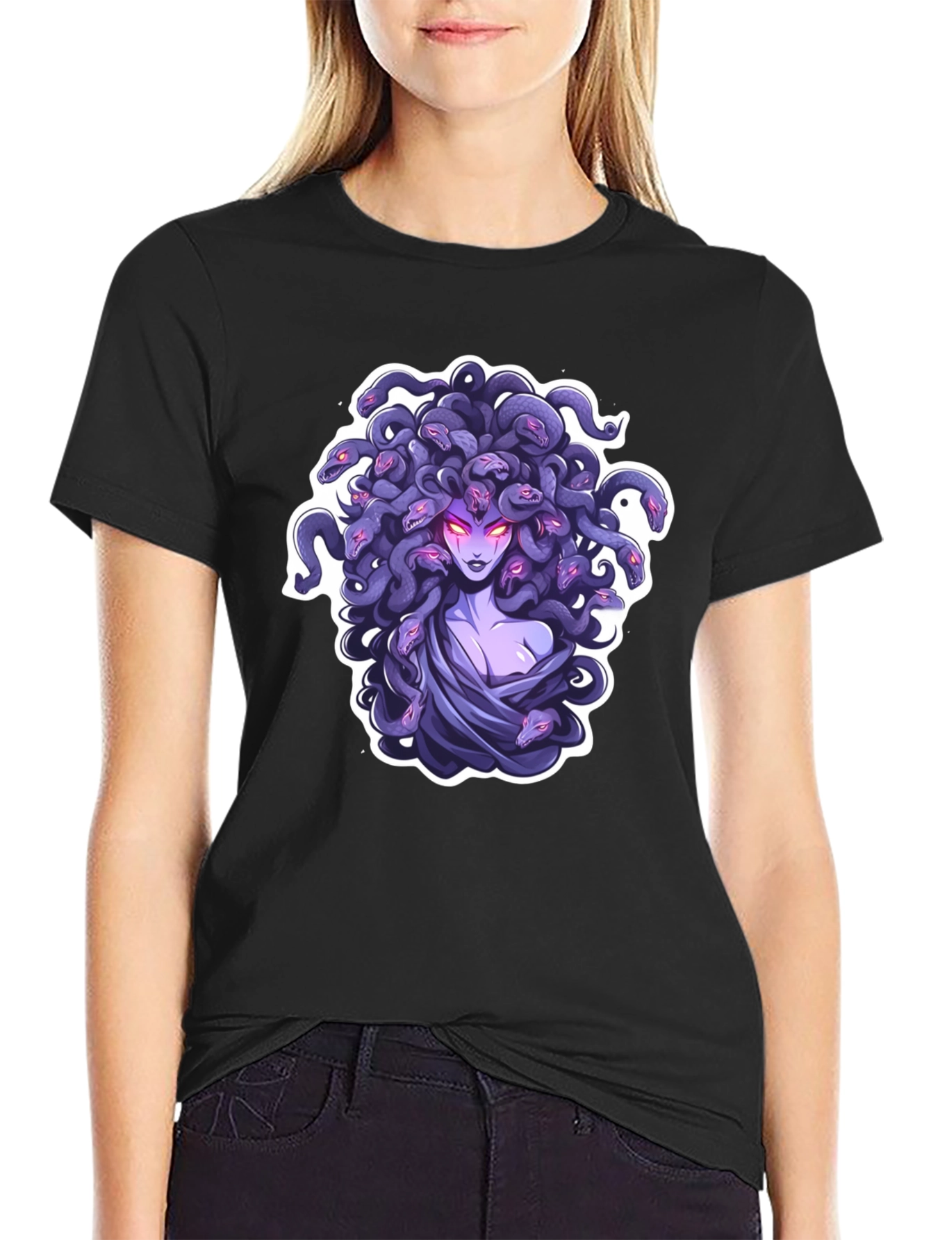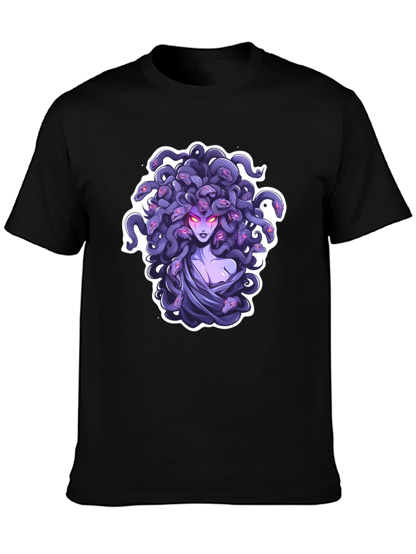 Luce un estilo único con esta camiseta negra de algodón de alta calidad. Presenta un impactante diseño de Medusa, la figura mitológica, con serpientes en lugar de cabello y ojos brillantes. El diseño está impreso con gran detalle y colores vibrantes, destacando sobre el fondo negro de la camiseta. Ideal para expresar tu personalidad y amor por la mitología griega. Perfecta para uso casual, eventos temáticos o como un regalo original para amantes de la historia y el arte. Cómoda y llamativa, esta camiseta te hará destacar dondequiera que vayas.