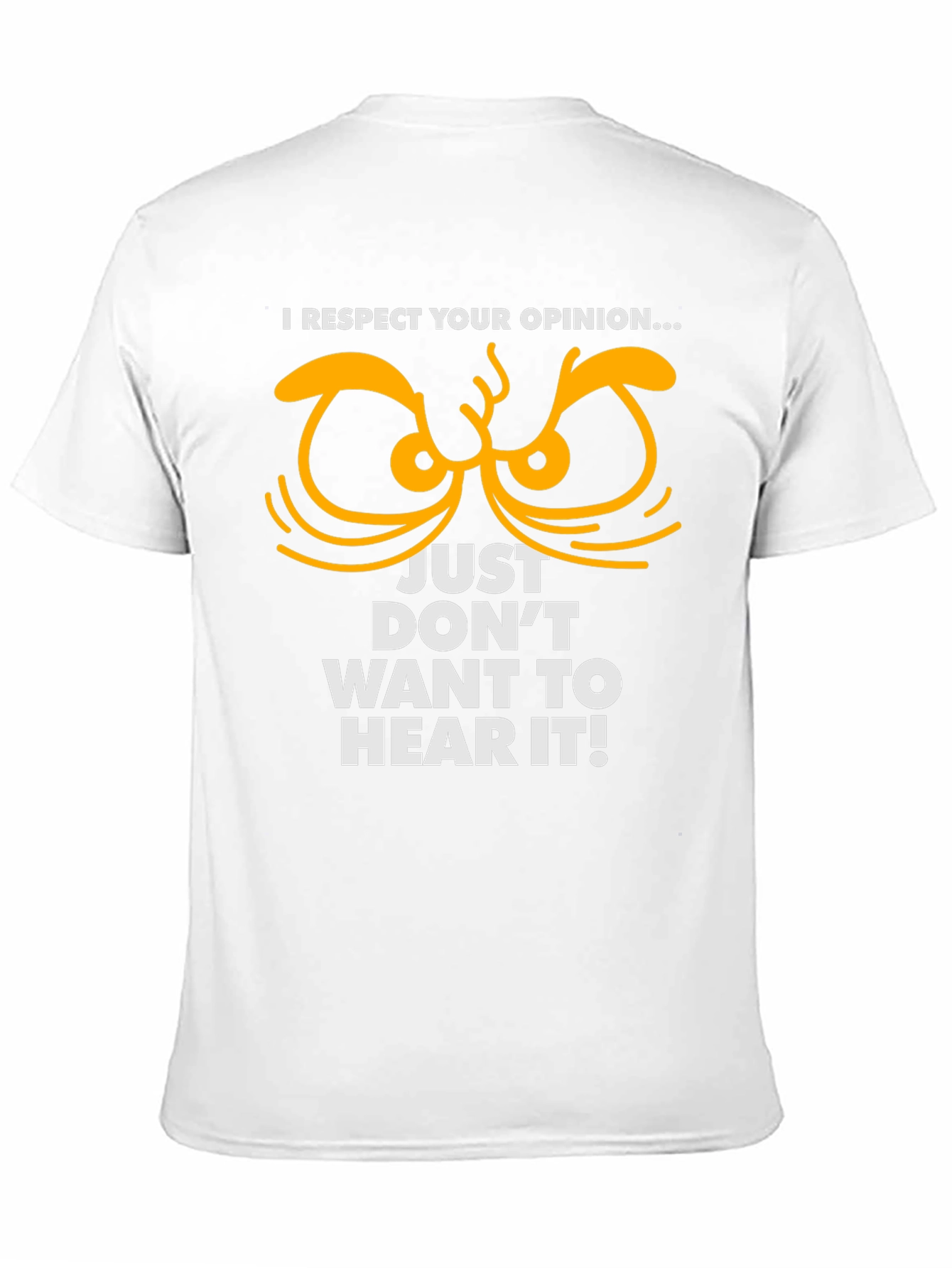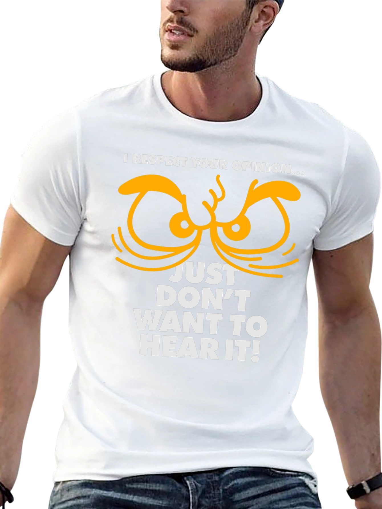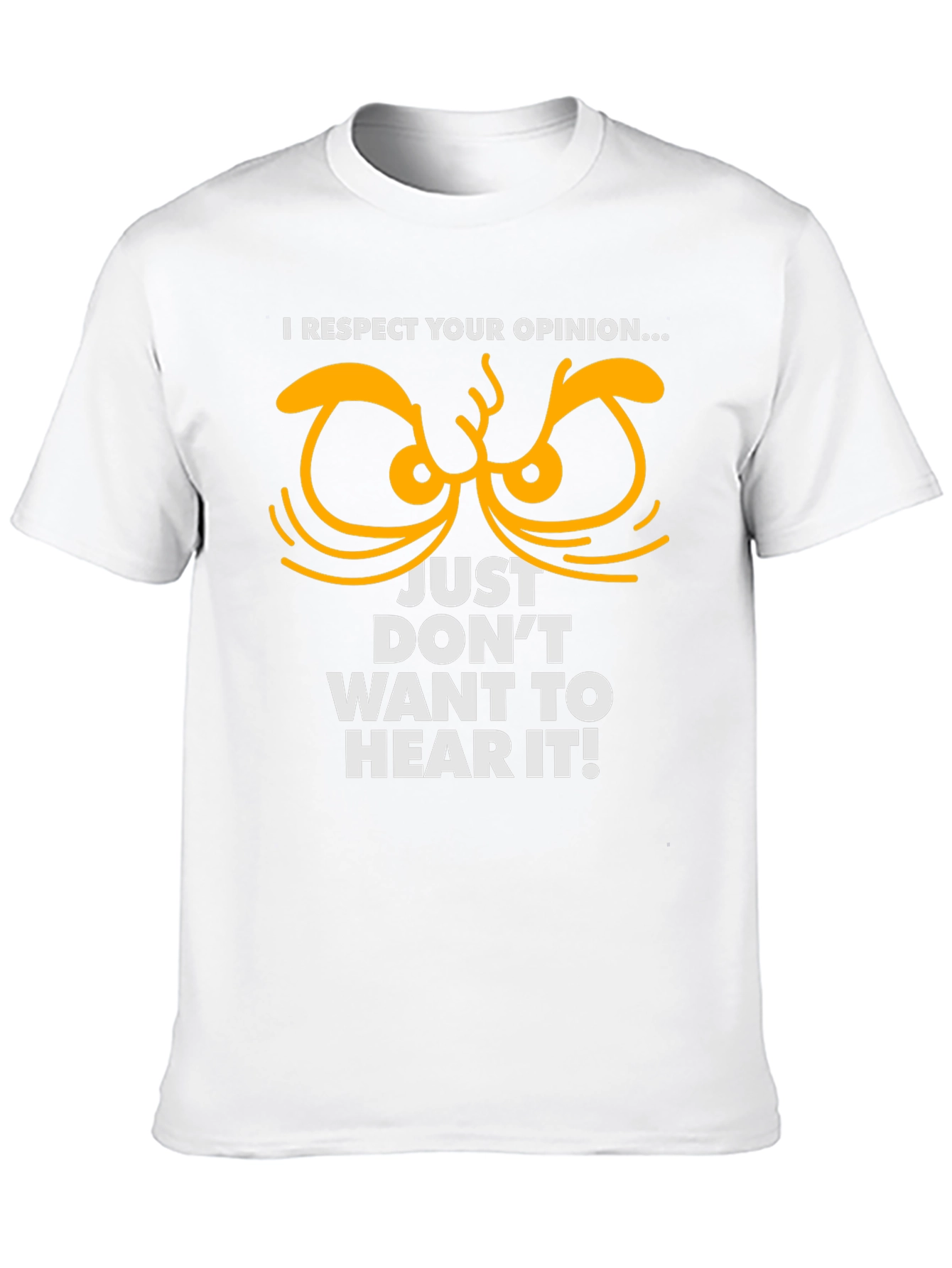 Esta camiseta negra de corte clásico presenta un diseño llamativo y humorístico. Destaca un par de ojos amarillos caricaturizados, acompañados de la frase "I RESPECT YOUR OPINION... JUST DON'T WANT TO HEAR IT!". El diseño, en colores contrastantes, se imprime en la parte frontal de la prenda. Ideal para quienes disfrutan de un estilo casual con un toque de ironía y diversión. Perfecta para expresar tu personalidad con un mensaje ingenioso. Confeccionada en un material suave y cómodo, ideal para el uso diario. Combina esta camiseta con tus jeans favoritos para un look relajado y con actitud.