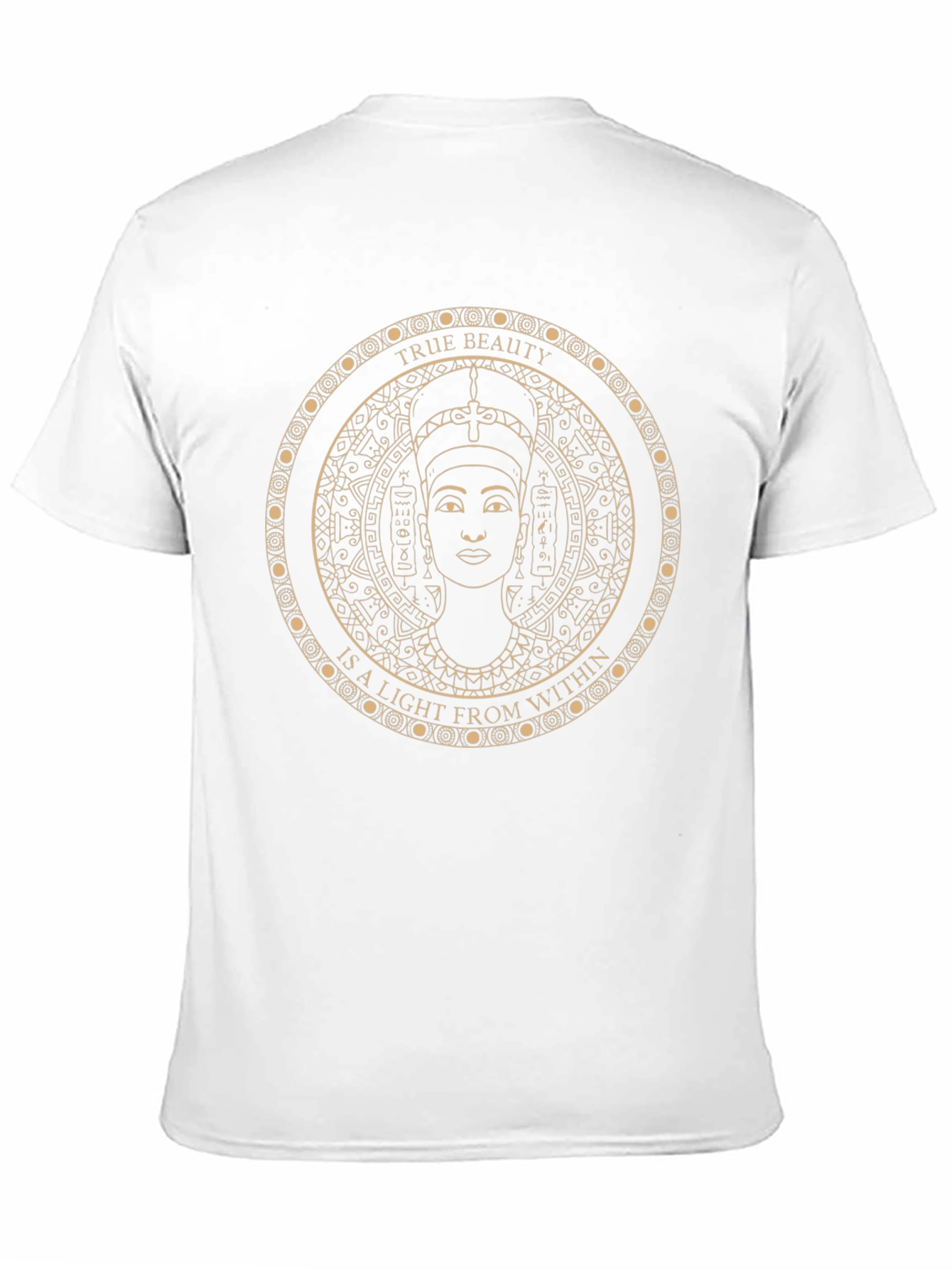 Luce esta elegante camiseta negra con un diseño circular dorado que evoca la belleza y misterio del antiguo Egipto. El diseño presenta un retrato estilo Nefertiti, rodeado de inscripciones y patrones intrincados. La frase 'True Beauty is a light from within' ('La verdadera belleza es una luz desde dentro') añade un toque inspirador. Fabricada con materiales suaves y cómodos, esta camiseta es perfecta para expresar tu estilo único con un toque cultural. Ideal para uso diario o para destacar en ocasiones especiales. Un regalo perfecto para los amantes de la historia y la moda.