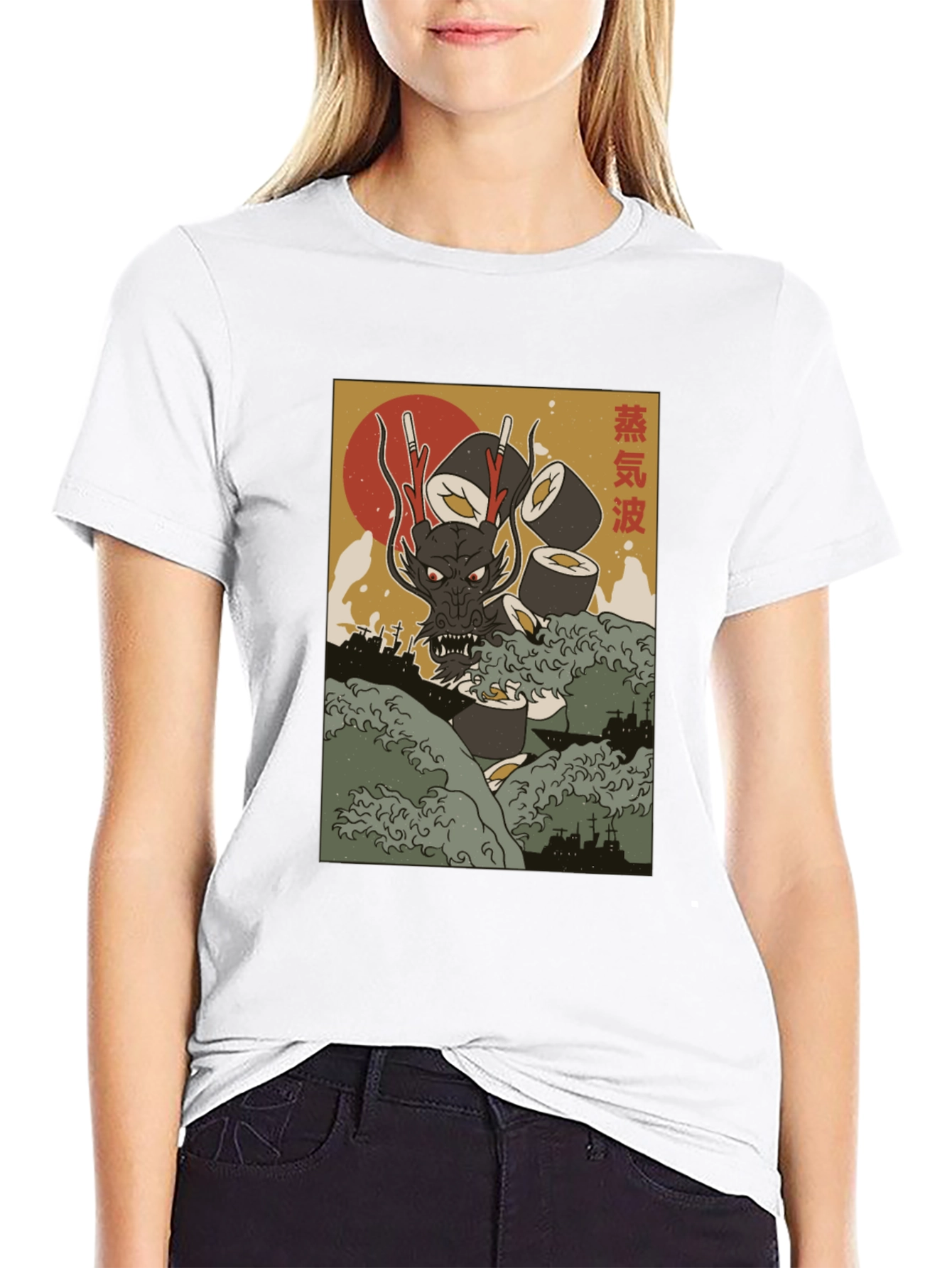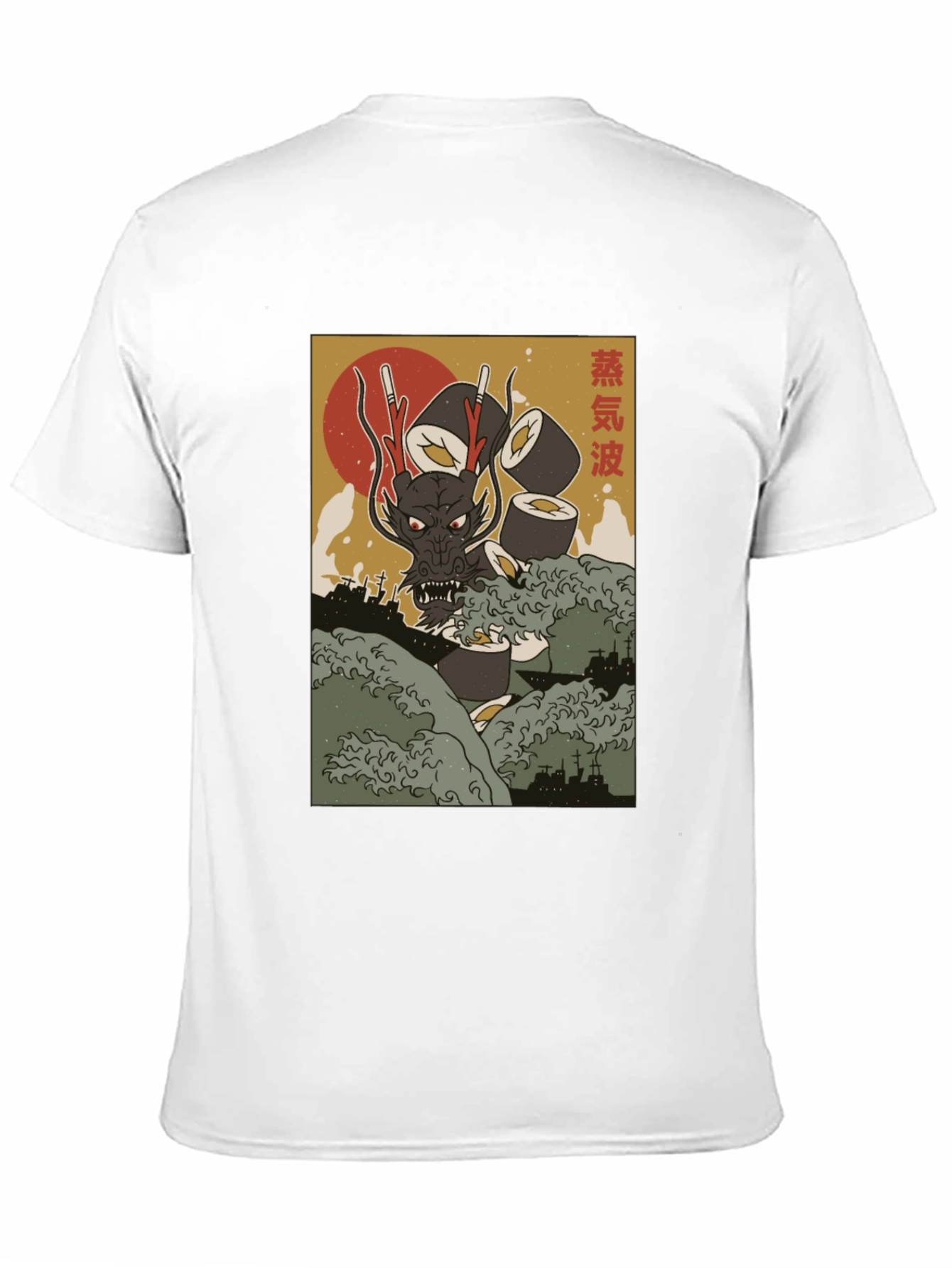Luce esta original camiseta negra con un impactante diseño de inspiración japonesa. En el pecho, destaca una ilustración rectangular con un dragón estilizado rodeado de piezas de sushi flotantes y olas, evocando la estética tradicional del arte japonés. El fondo presenta un sol rojo y caracteres en japonés, añadiendo autenticidad al diseño. Confeccionada en un tejido suave y cómodo, esta camiseta de manga corta es perfecta para expresar tu estilo único y tu pasión por la cultura oriental. Ideal para uso diario, eventos informales o como un regalo original para los amantes del arte y la gastronomía japonesa.