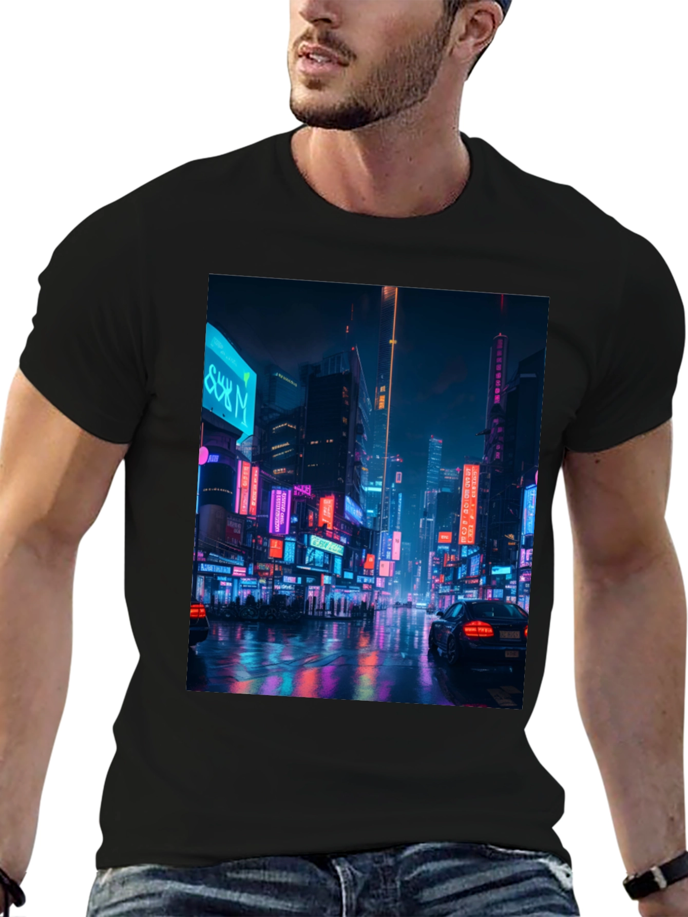 Eleva tu estilo con esta camiseta negra de corte moderno. El llamativo diseño estampado captura la esencia de una metrópolis futurista iluminada con luces de neón vibrantes. La imagen detallada muestra rascacielos, letreros luminosos y reflejos en una calle mojada, creando un efecto visual impactante. Perfecta para expresar tu individualidad y destacar entre la multitud. Ideal para usar en salidas nocturnas, eventos urbanos o simplemente para añadir un toque audaz a tu look diario. Confeccionada con materiales suaves y cómodos, esta camiseta te brindará estilo y confort durante todo el día.