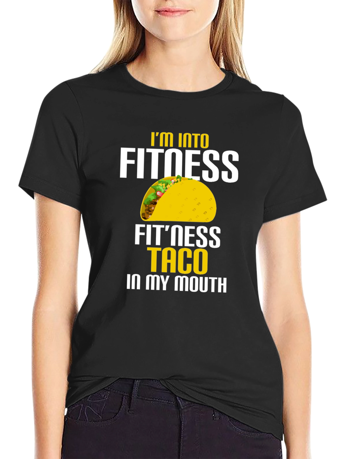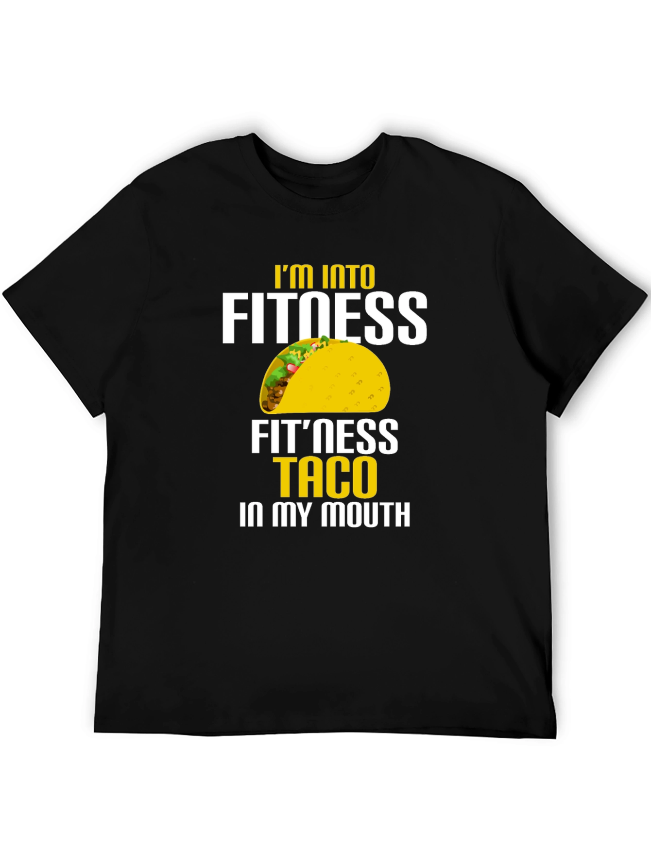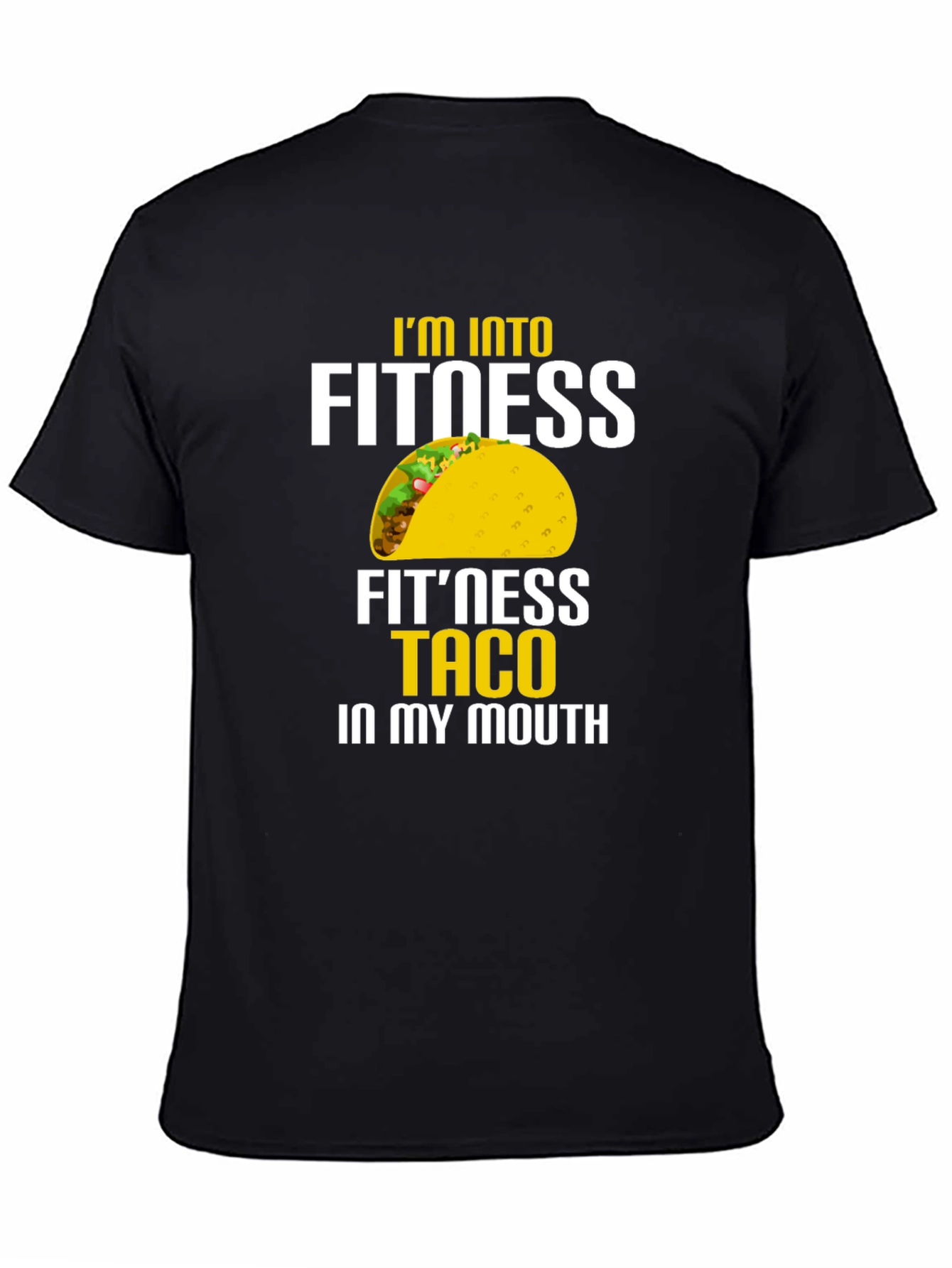 Esta camiseta negra de manga corta presenta un diseño llamativo y divertido. En el centro, se aprecia la frase "I'M INTO FITNESS FIT'NESS TACO IN MY MOUTH", con la palabra "TACO" reemplazada por una ilustración colorida de un taco. La impresión destaca en colores blanco y amarillo, creando un contraste nítido sobre el fondo negro de la camiseta. Ideal para hombres con sentido del humor que disfrutan de la comida y un estilo relajado. Perfecta para usar en salidas informales, reuniones con amigos o simplemente para expresar tu amor por los tacos con un toque de originalidad. ¡Atrévete a lucir esta camiseta única y divertida!