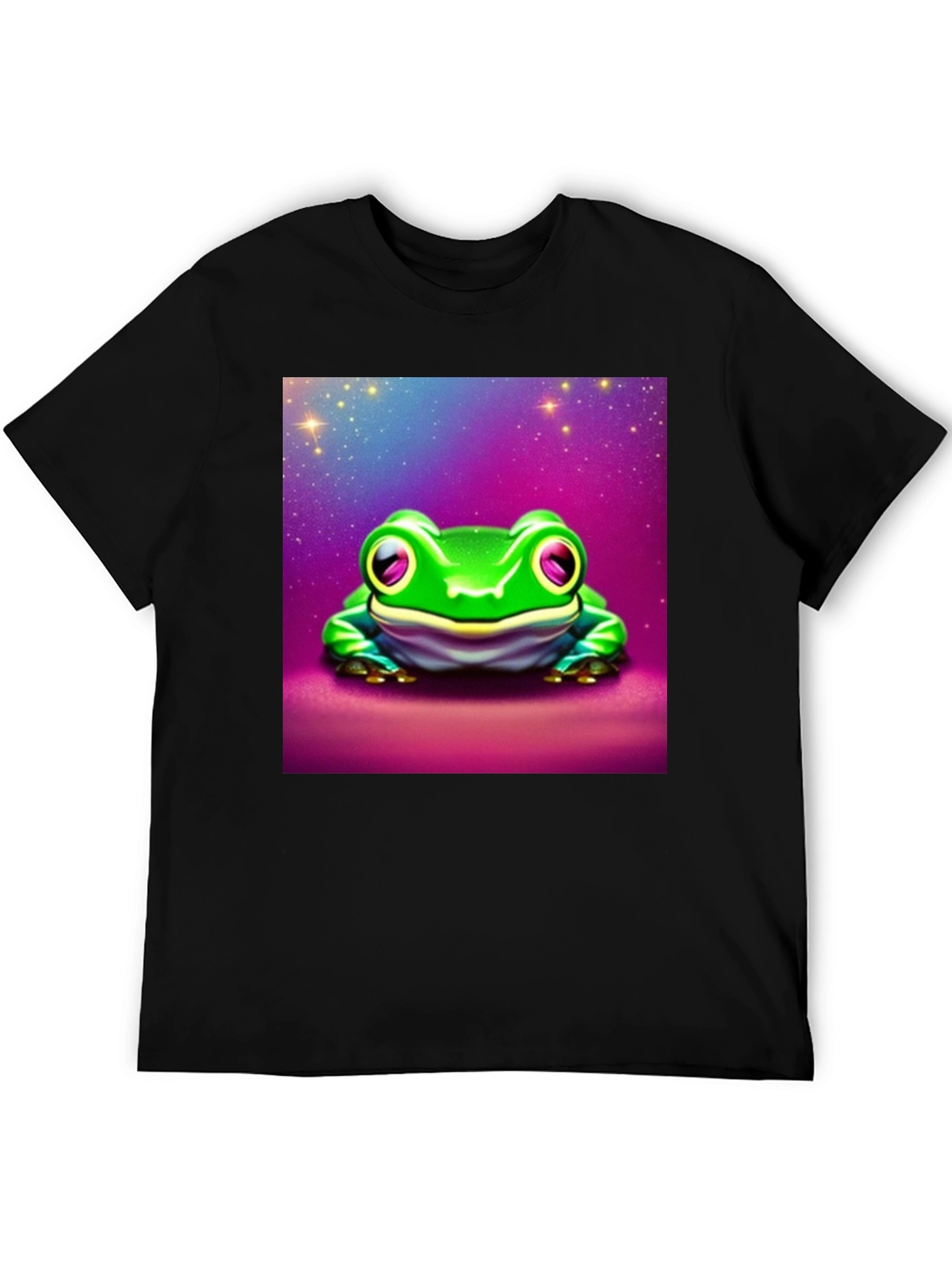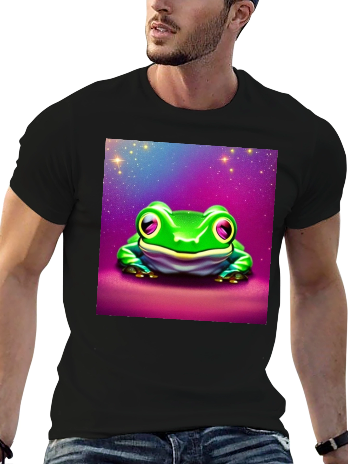 Luce esta llamativa camiseta negra con un diseño único. Presenta una rana verde brillante con ojos rosados, sobre un fondo cósmico de estrellas púrpuras y azules. El diseño captura una estética divertida y moderna, perfecta para aquellos que buscan destacar con un toque original. Ideal para uso diario, eventos casuales o para expresar tu individualidad con estilo. Confeccionada con materiales suaves y cómodos, esta camiseta ofrece un ajuste relajado para usarla todo el día. Añade un toque de fantasía y diversión a tu guardarropa con esta prenda excepcional.