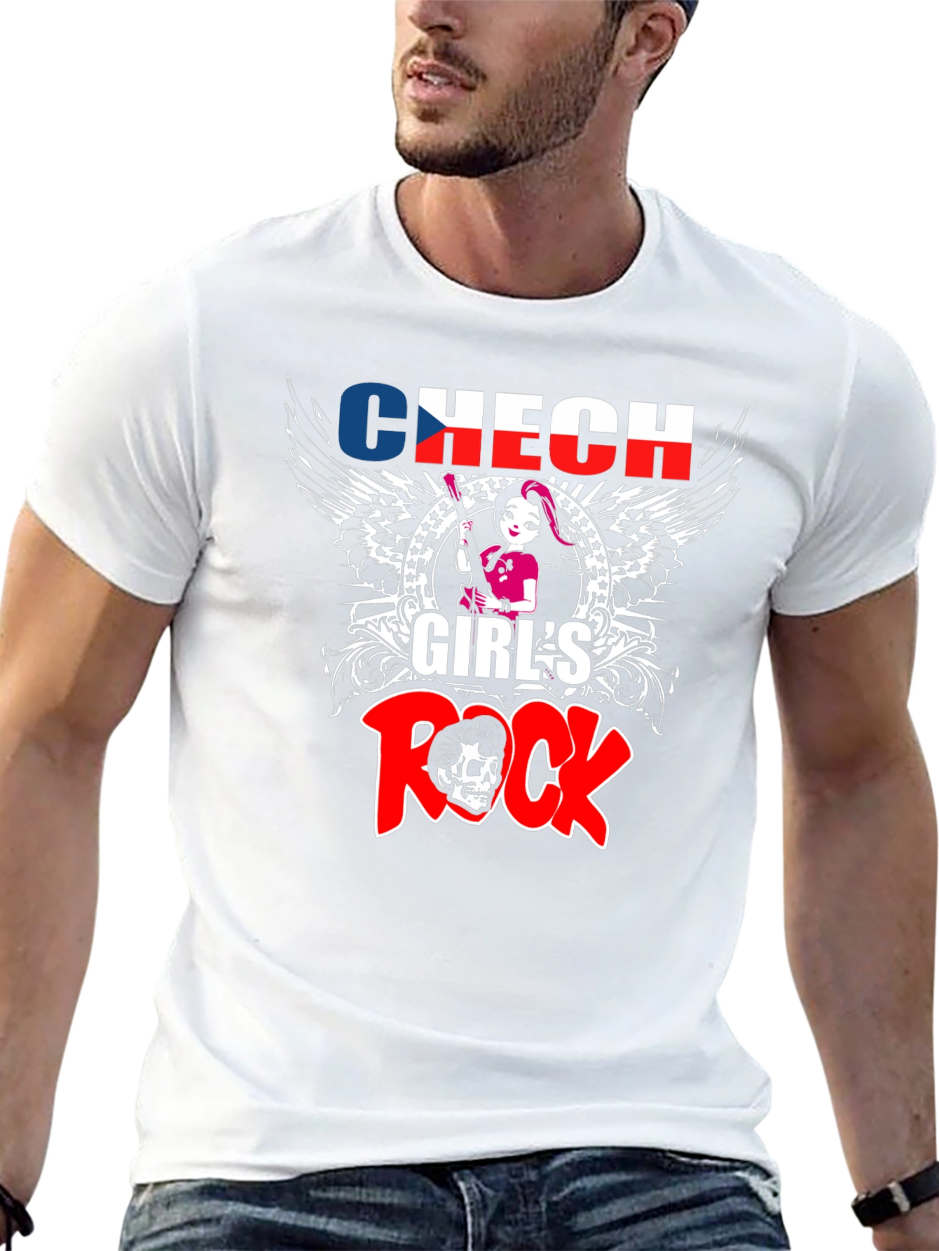 Luce un estilo audaz con esta camiseta negra de diseño exclusivo. Presenta un llamativo estampado "Czech Girl's Rock" con detalles en azul, blanco y rojo que capturan la atención. El diseño incorpora una ilustración de una chica con una guitarra, alas ornamentadas y un cráneo estilizado, creando una estética rockera y original. Fabricada con materiales suaves y cómodos, esta camiseta es perfecta para expresar tu individualidad y pasión por la música. Ideal para conciertos, salidas casuales o simplemente para añadir un toque rebelde a tu outfit diario. ¡Muestra tu espíritu rockero con esta prenda única!