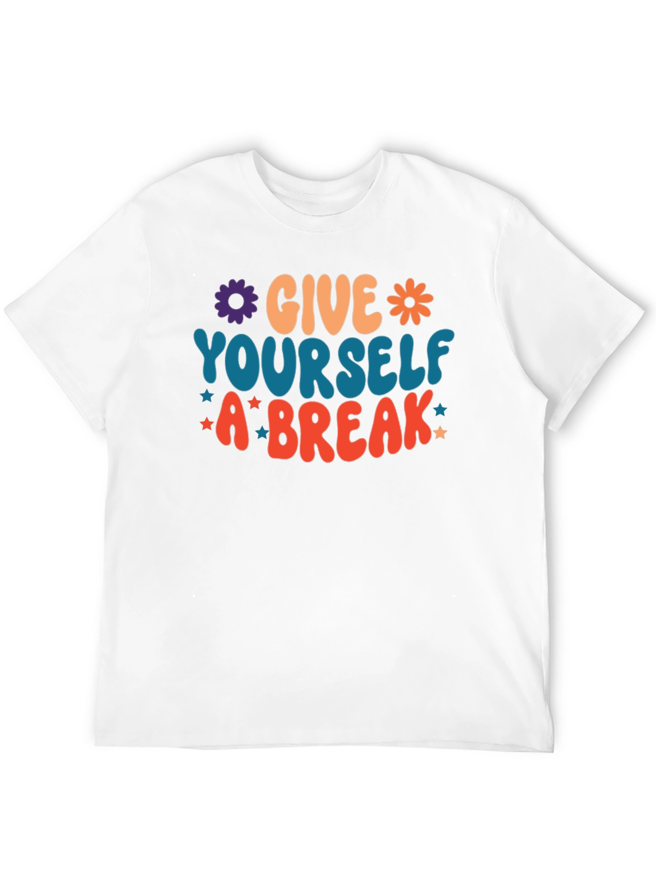 Esta camiseta negra presenta un diseño retro y llamativo. La frase "GIVE YOURSELF A BREAK" (Date un respiro) está estampada en colores vibrantes como naranja, azul y rojo, con detalles de flores y estrellas que le dan un toque divertido y relajado. La camiseta parece ser de algodón suave y cómodo, ideal para uso diario. Perfecta para quienes buscan un estilo único y un mensaje positivo, esta camiseta es ideal para combinar con jeans, shorts o faldas. Lúcela en tus salidas casuales, en el gimnasio o simplemente para relajarte en casa. Añade un toque de color y buena onda a tu guardarropa con esta original camiseta.