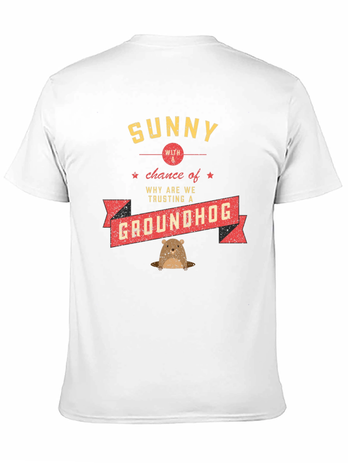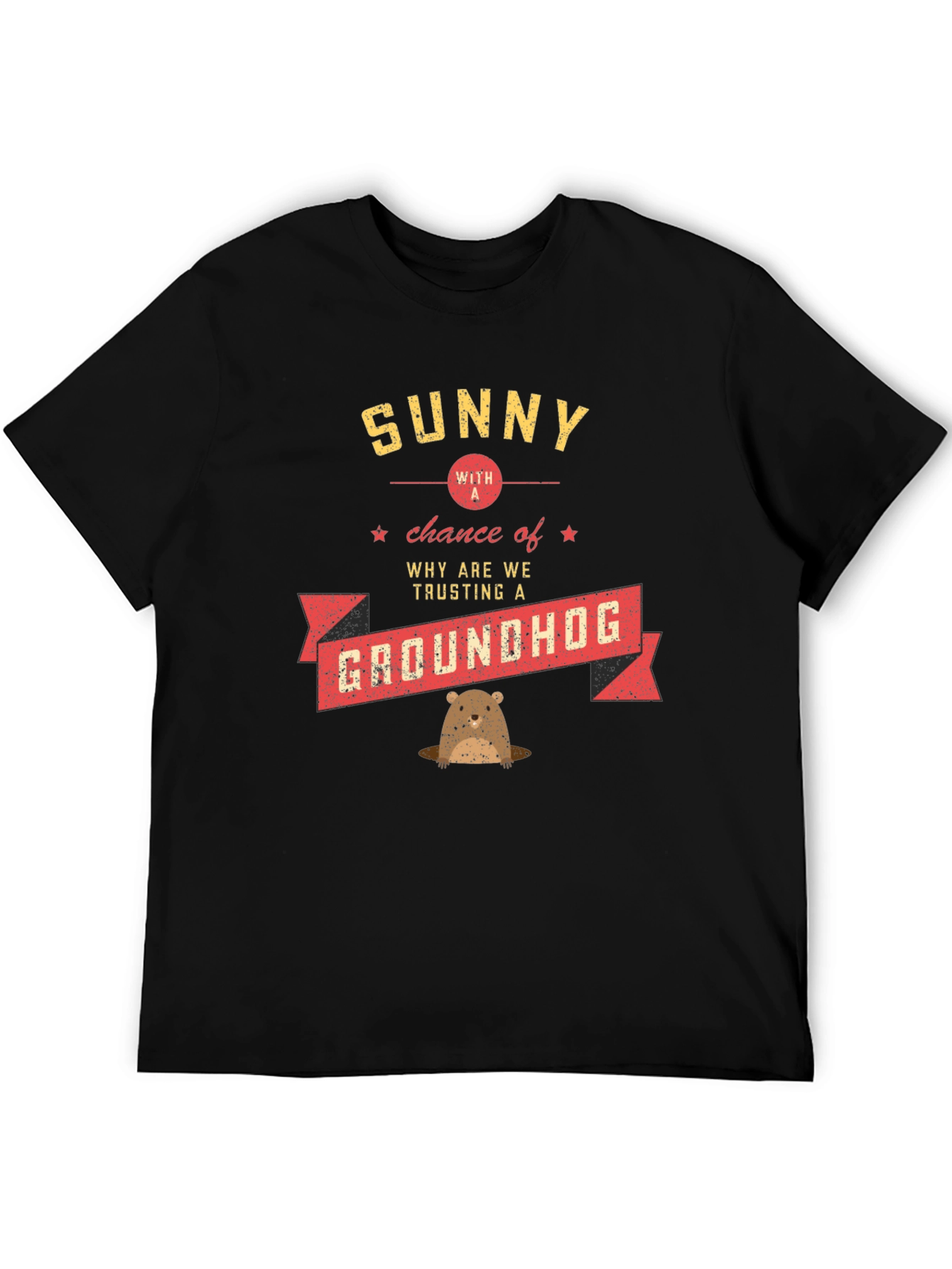 Celebra el Día de la Marmota con esta divertida camiseta negra para hombre. Presenta un diseño llamativo con el texto "Sunny with a chance of why are we trusting a groundhog" (Soleado con probabilidad de por qué confiamos en una marmota). El diseño incluye una marmota caricaturesca asomándose desde su madriguera. Ideal para llevar en el Día de la Marmota, fiestas temáticas o simplemente para expresar tu sentido del humor. Hecha de tela suave y cómoda, perfecta para el uso diario. ¡Añade un toque de diversión a tu armario con esta original camiseta!