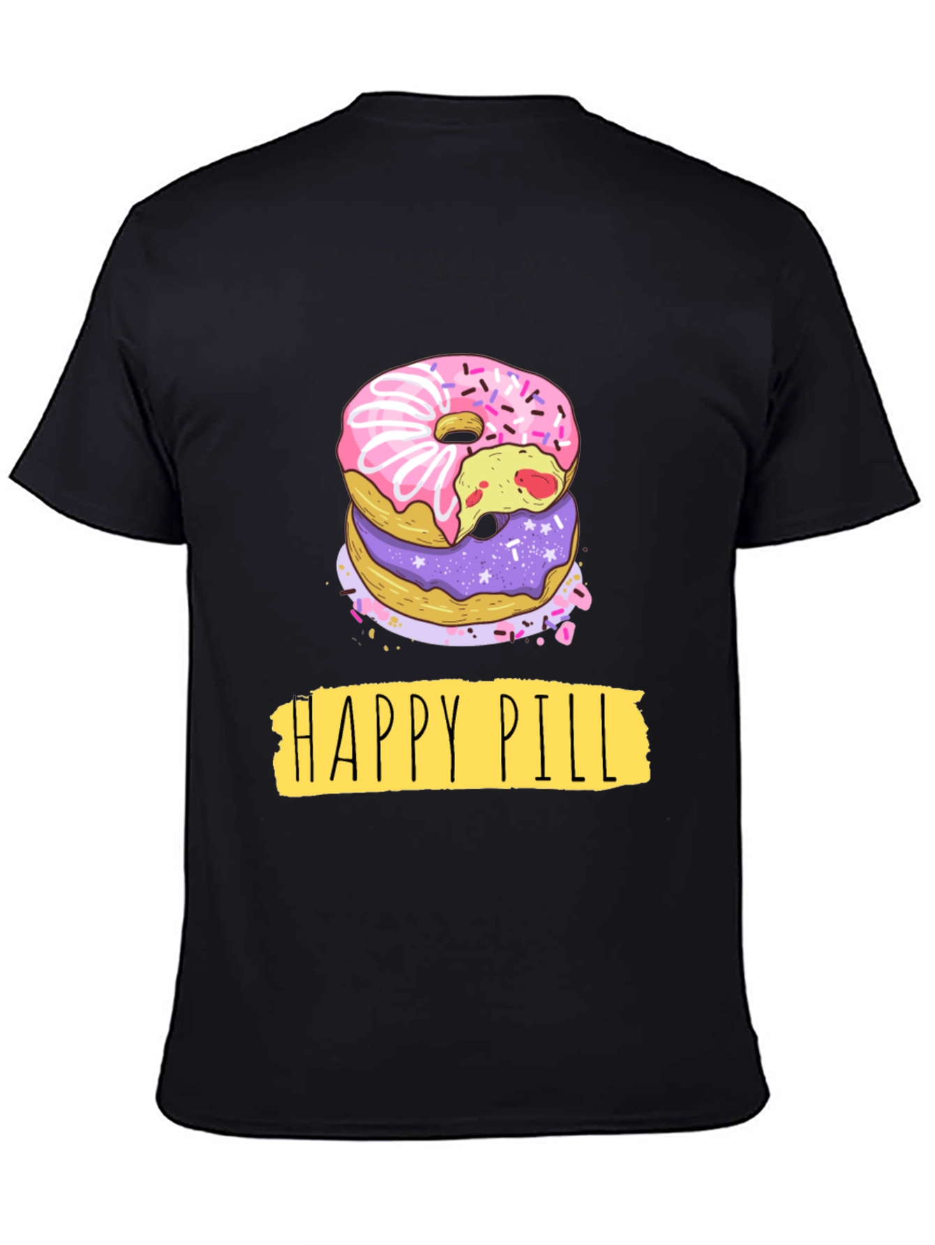 Esta camiseta negra presenta un diseño divertido y llamativo de dos donas apiladas, una con glaseado rosa y otra con glaseado morado, con el texto "HAPPY PILL" en amarillo. Ideal para los amantes de los dulces y para aquellos que buscan una prenda original y cómoda para el día a día. Perfecta para combinar con jeans o pantalones casuales, esta camiseta añade un toque de alegría a cualquier atuendo. Fabricada con materiales suaves y de alta calidad para garantizar la comodidad y durabilidad. ¡Consigue la tuya y muestra tu lado más dulce!