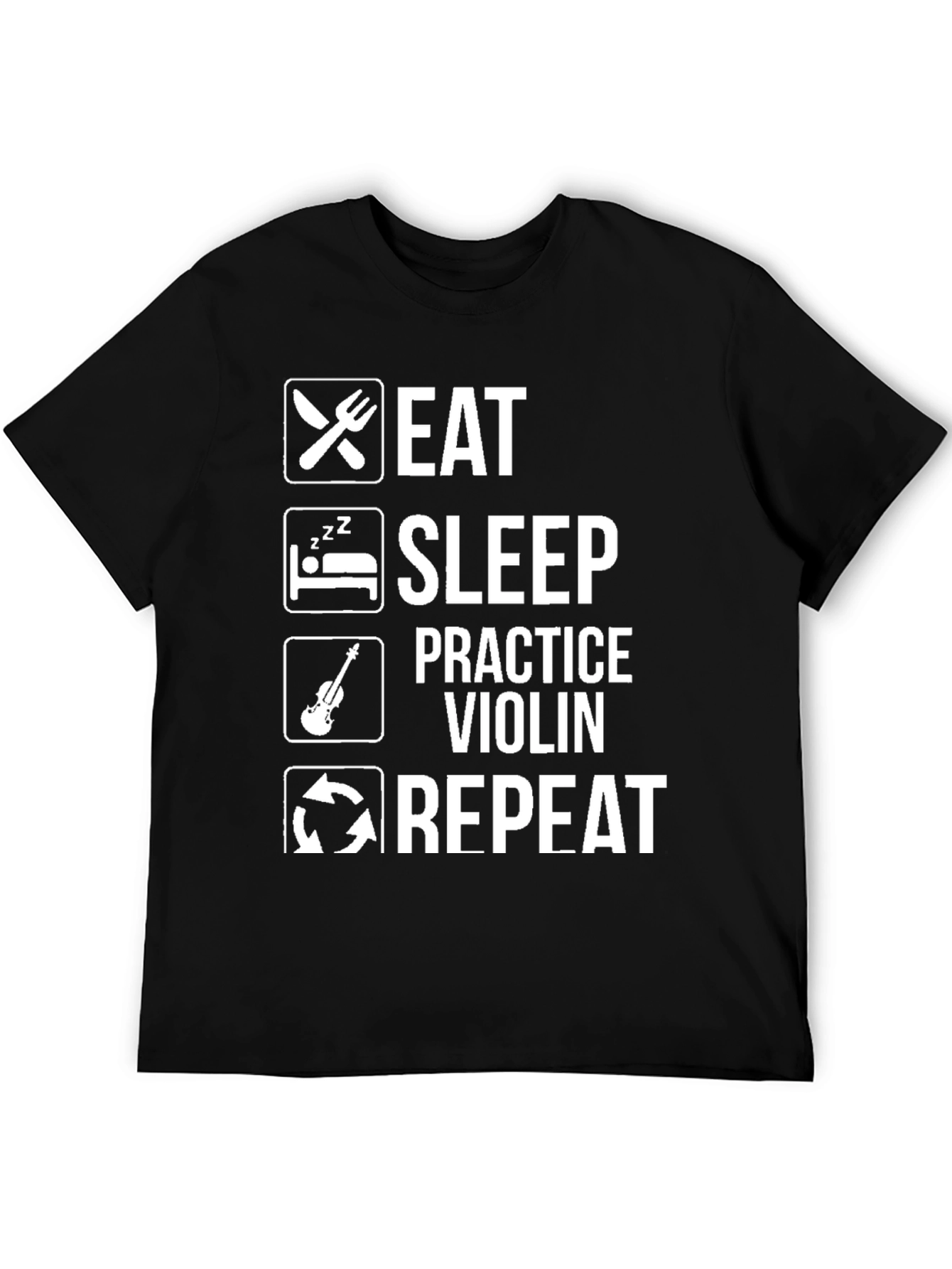 Esta camiseta negra presenta un diseño divertido y musical. Muestra un gráfico blanco que representa un ciclo de vida: "Eat, Sleep, Practice Violin, Repeat" (Comer, Dormir, Practicar Violín, Repetir), ideal para amantes de la música y violinistas. Confeccionada en un material aparentemente suave y cómodo, esta camiseta de manga corta es perfecta para el uso diario, ensayos de orquesta o simplemente para expresar tu pasión por el violín. Un regalo ideal para cualquier músico con sentido del humor.