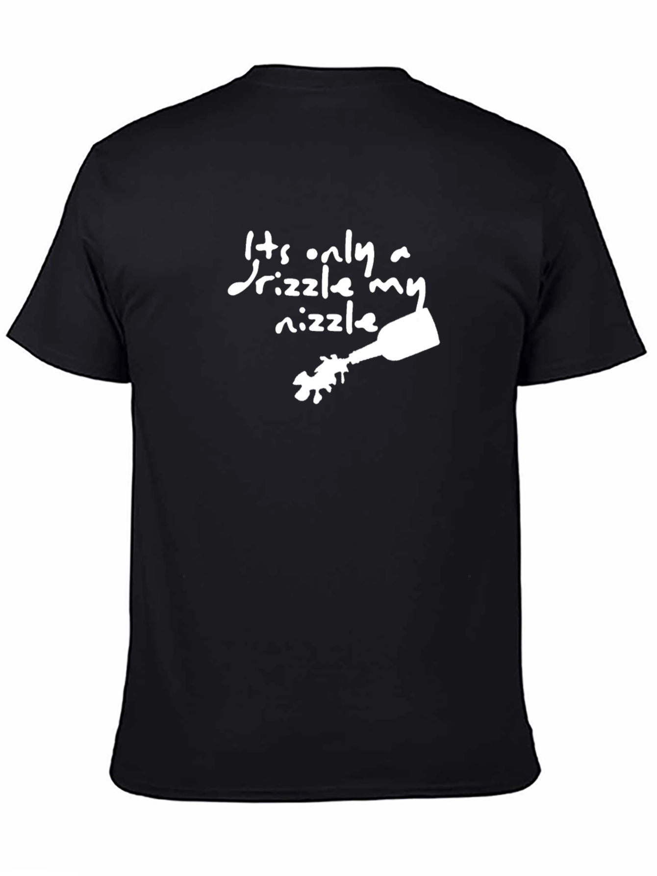 Esta camiseta negra presenta un diseño gráfico divertido en blanco que dice: "Es solo una llovizna mi llovizna". El diseño también incluye una ilustración de una botella que parece estar derramando su contenido, lo que añade un toque lúdico a la prenda. Hecha de un material suave y cómodo, esta camiseta es ideal para el uso diario. Su corte clásico la hace versátil para combinar con diferentes estilos, ya sea para un look casual con jeans o para relajarse en casa. Perfecta para aquellos con sentido del humor y que buscan una prenda original y llamativa.