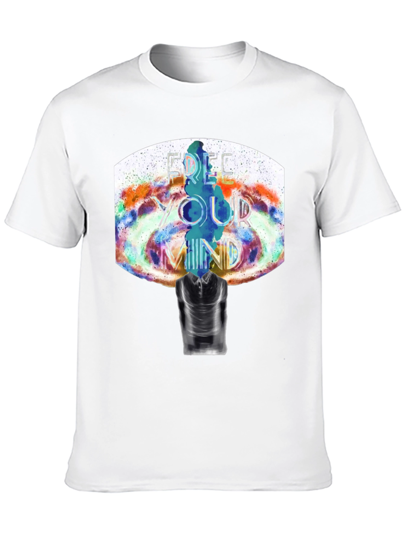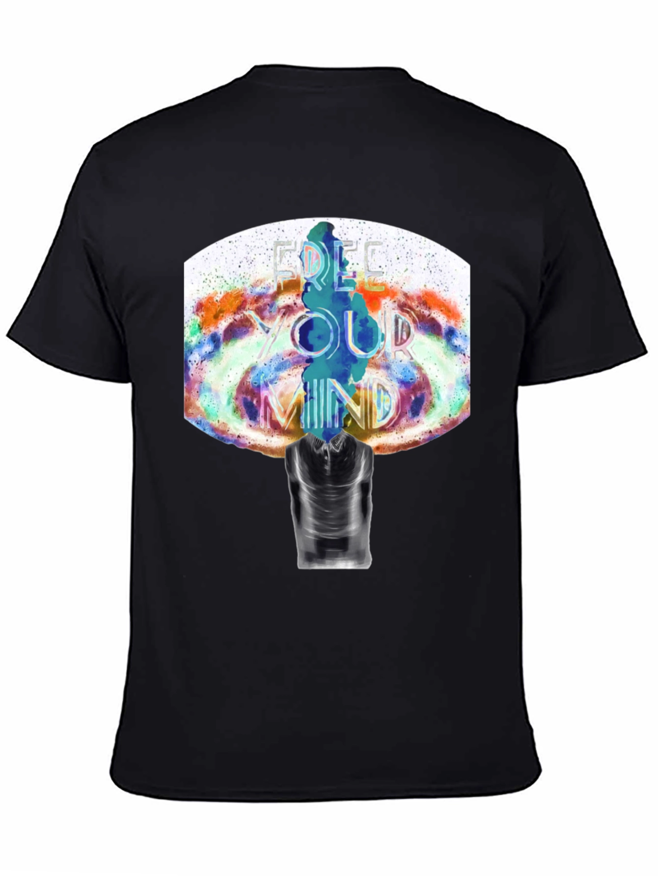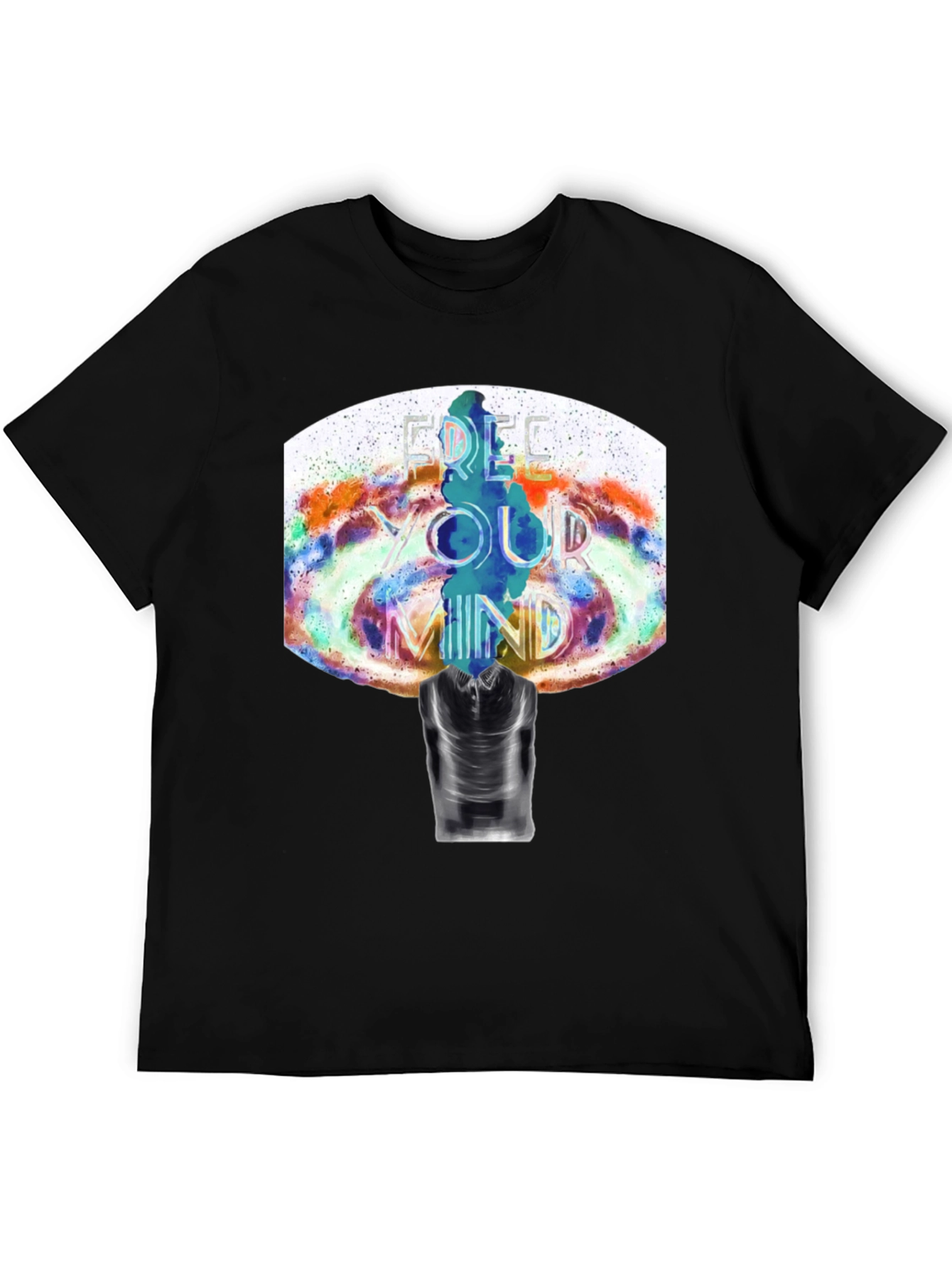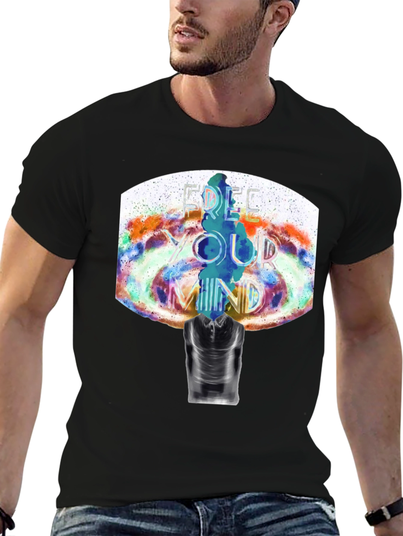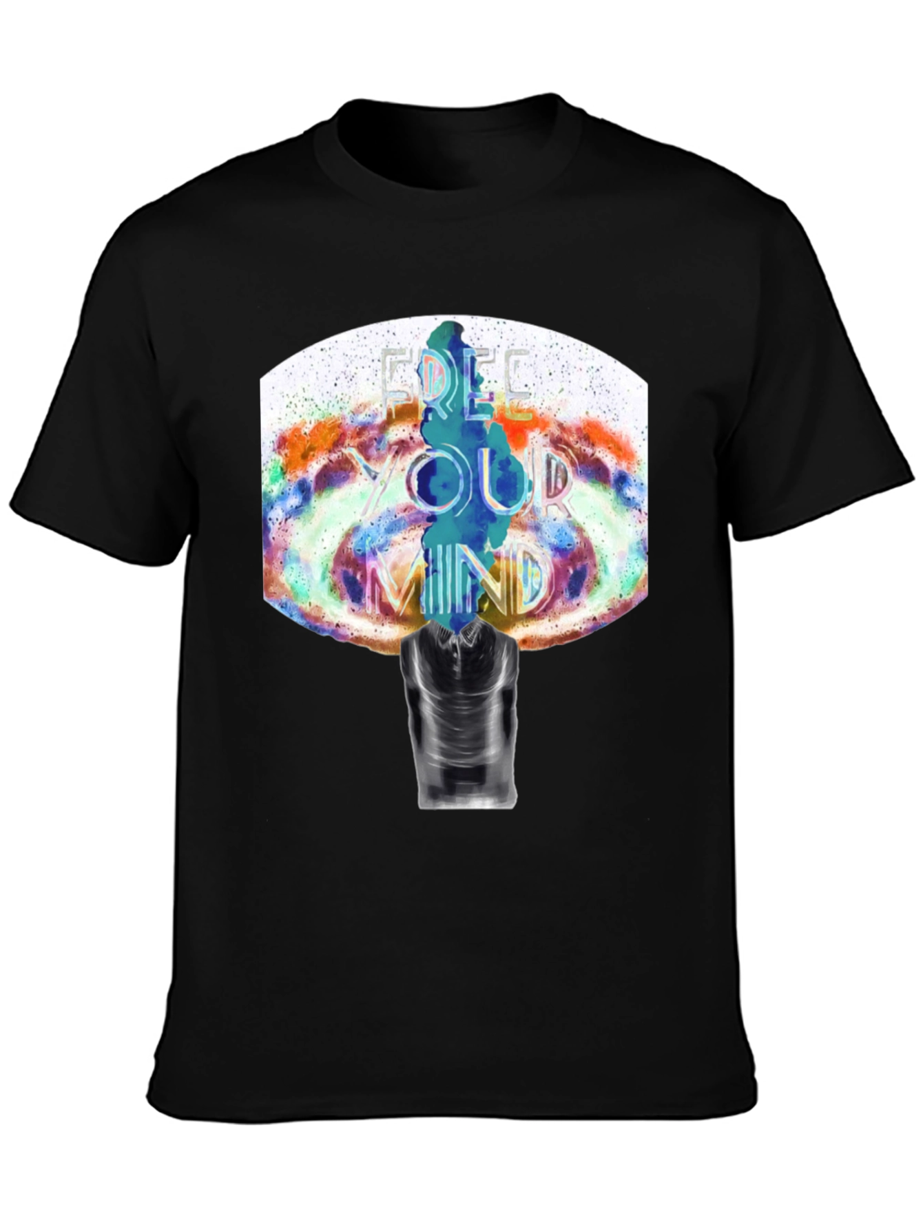 Expresa tu individualidad con esta llamativa camiseta negra. Presenta un diseño artístico con la frase "Free Your Mind" (Libera Tu Mente) sobre un fondo vibrante de colores difuminados y una imagen abstracta. Fabricada en un tejido suave y cómodo, esta camiseta de manga corta es perfecta para el uso diario, ya sea para relajarte en casa o para salir con amigos. Su diseño único la convierte en una excelente opción para aquellos que buscan destacar entre la multitud y expresar su creatividad.