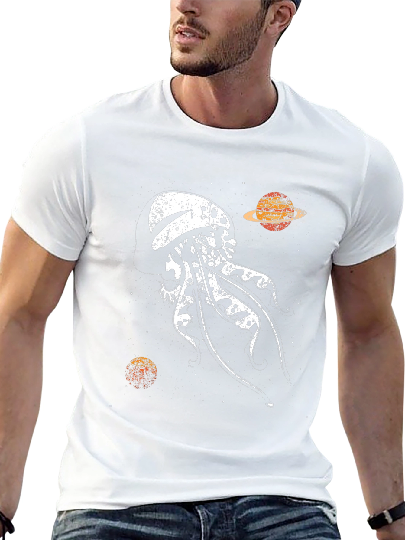 Eleva tu estilo con esta moderna camiseta negra de corte clásico. Presenta un llamativo diseño de una medusa en estilo vintage con detalles de cráneos, acompañada de planetas, creando una estética espacial única. Perfecta para expresar tu individualidad y amor por el cosmos. Fabricada con tela suave y confortable, ideal para uso diario, conciertos o reuniones casuales. Combínala con jeans o pantalones para un look relajado pero con actitud. Impresión de alta calidad que asegura durabilidad y resistencia al lavado. ¡Atrévete a destacar con esta prenda original!