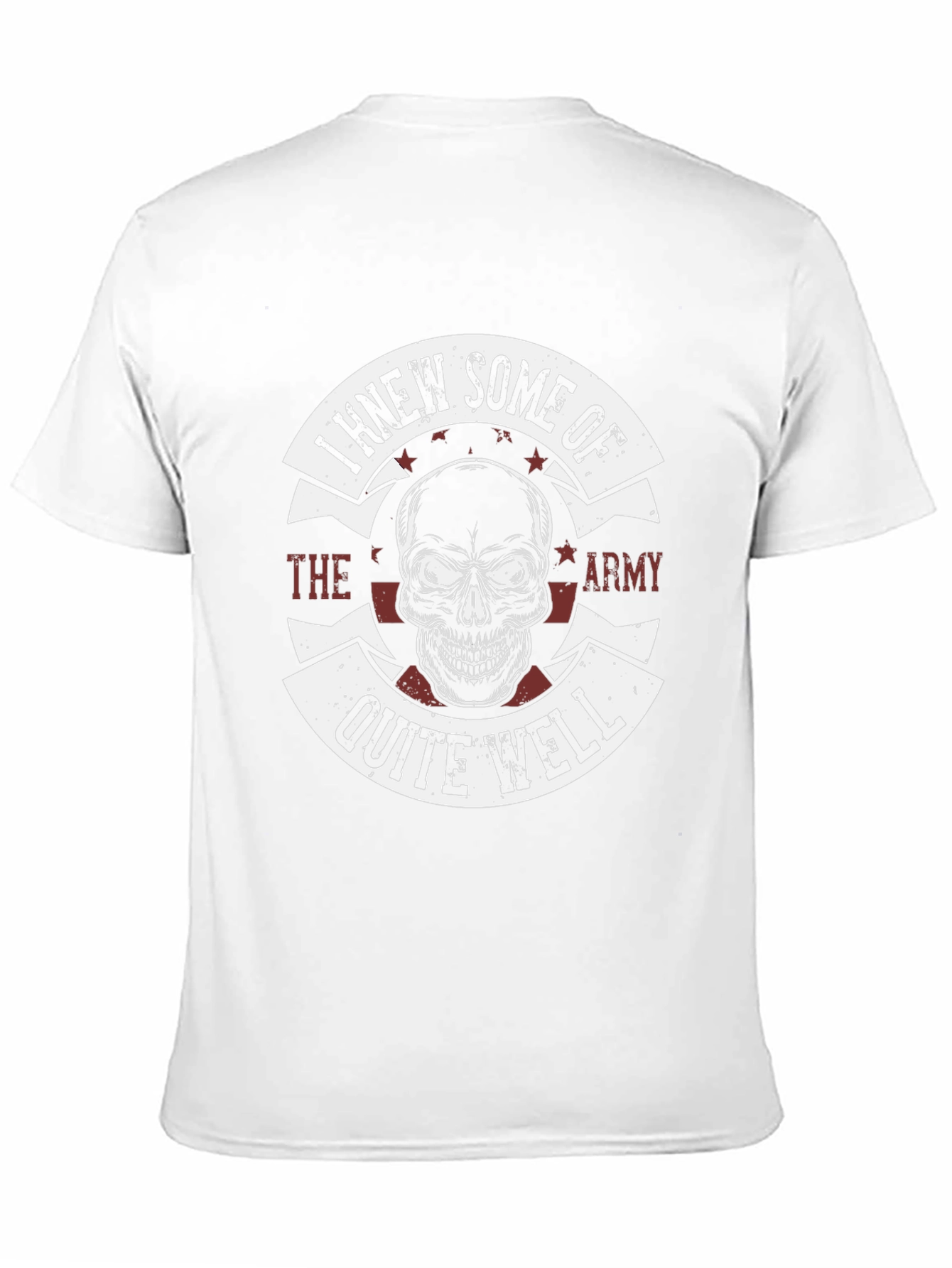 Demuestra tu estilo con esta camiseta negra de manga corta. Presenta un diseño llamativo con un cráneo estilizado rodeado de texto que dice "I Knew Some of the Army Quite Well", ideal para aquellos con un sentido del humor audaz y aprecio por la temática militar. Perfecta para uso casual, esta camiseta destaca por su diseño único y confortable, ideal para expresar tu personalidad con un toque rebelde. Fabricada con materiales suaves, proporciona una comodidad duradera. Combina esta prenda con jeans o pantalones casuales para un look relajado pero con carácter.