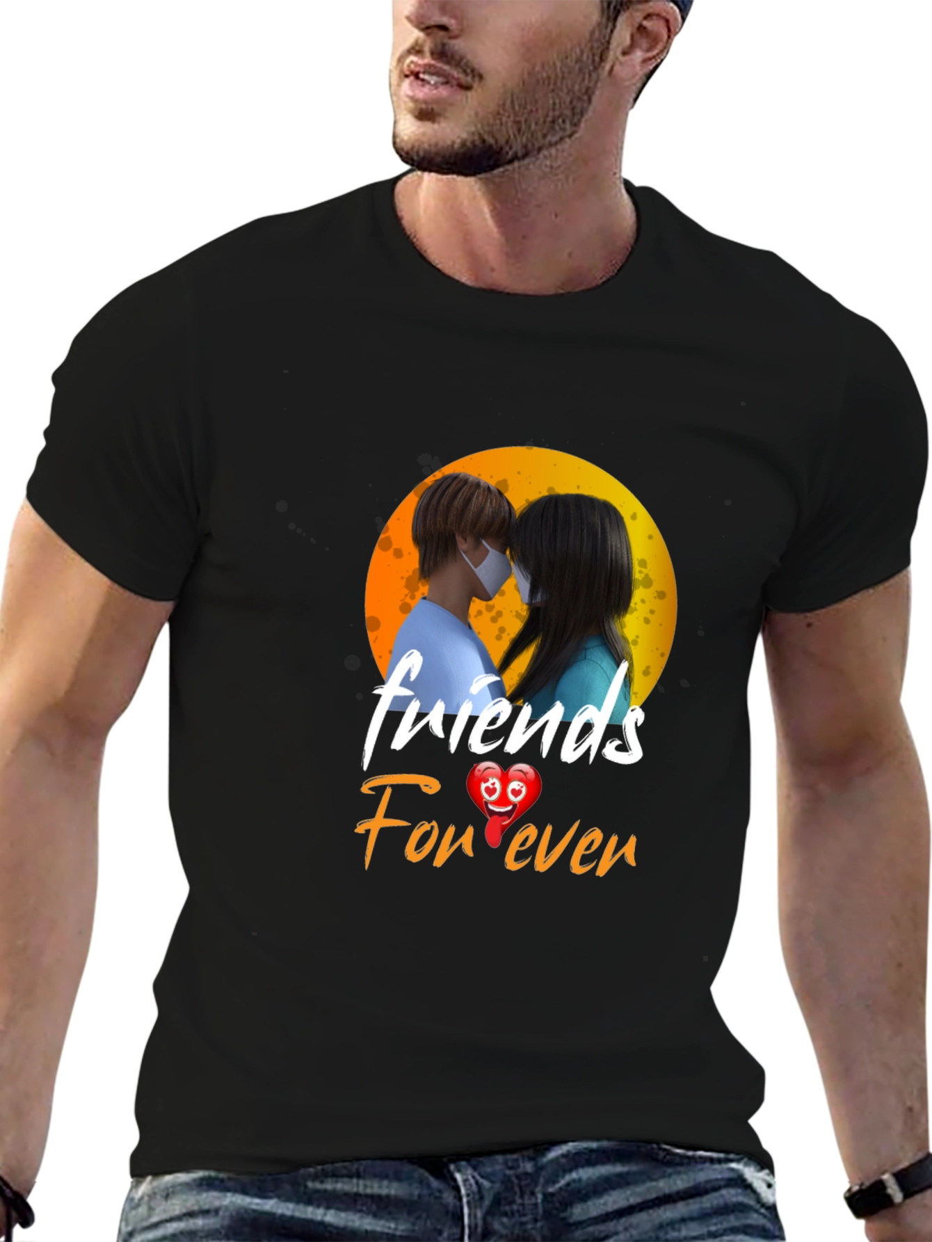 Luce esta camiseta negra con un diseño único y adorable. Presenta la frase 'Friends Forever' con una pareja que parece muy unida, sobre un círculo naranja con un fondo que le da un toque artístico. La camiseta de manga corta es ideal para uso diario, salidas informales con amigos o para expresar tu lado cariñoso. Perfecta para regalar a tu mejor amigo o para demostrar tu afecto. Un diseño original que destaca por su sencillez y mensaje positivo. ¡Muestra tu amistad con estilo!