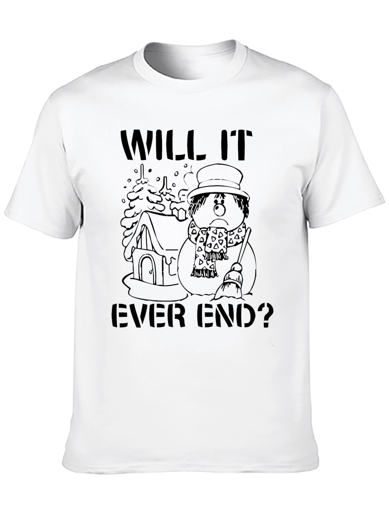 Luce esta camiseta negra de manga corta con un diseño único. Presenta un gráfico en tinta oscura de un muñeco de nieve con expresión triste, parado frente a una casita y un árbol nevado. La frase "WILL IT EVER END?" (¿Alguna vez terminará?) añade un toque de humor melancólico. Perfecta para expresar tu sentir sobre los largos inviernos o simplemente para aquellos que aman la estética oscura. Ideal para uso casual, esta camiseta se convertirá en una pieza clave de tu guardarropa. ¡Muestra tu estilo único con esta prenda llamativa!