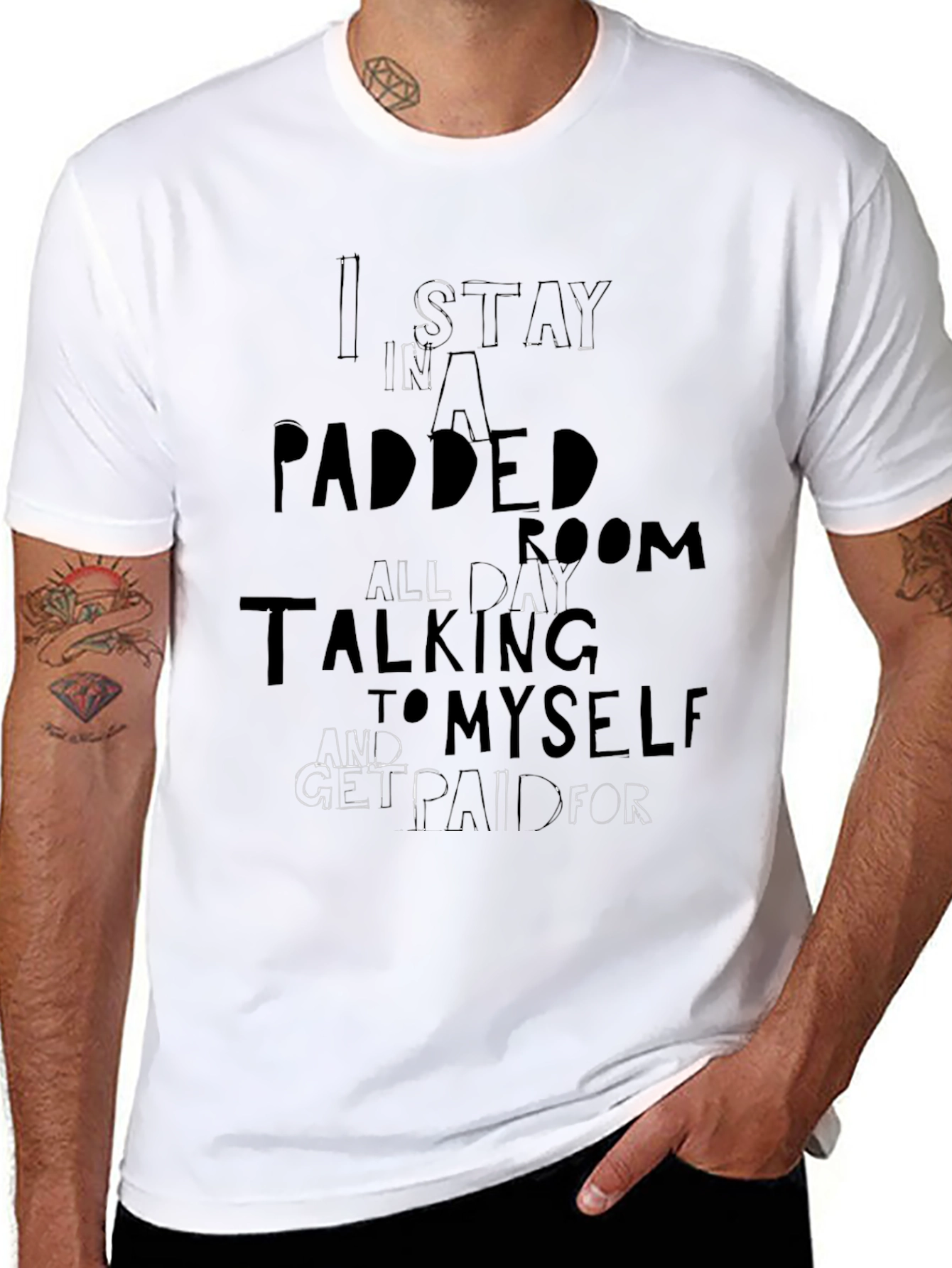 Esta camiseta negra para hombre presenta un diseño audaz y llamativo. El texto "I stay in a padded room all day talking to myself and get paid for" está estampado en la parte delantera, creando un look único y divertido. Fabricada con materiales suaves y cómodos, esta camiseta es perfecta para el uso diario. Su corte clásico la hace versátil para combinar con jeans, pantalones cortos o incluso debajo de una chaqueta. Ideal para aquellos que buscan expresar su personalidad con un toque de humor y originalidad. Añade un toque distintivo a tu guardarropa con esta camiseta.