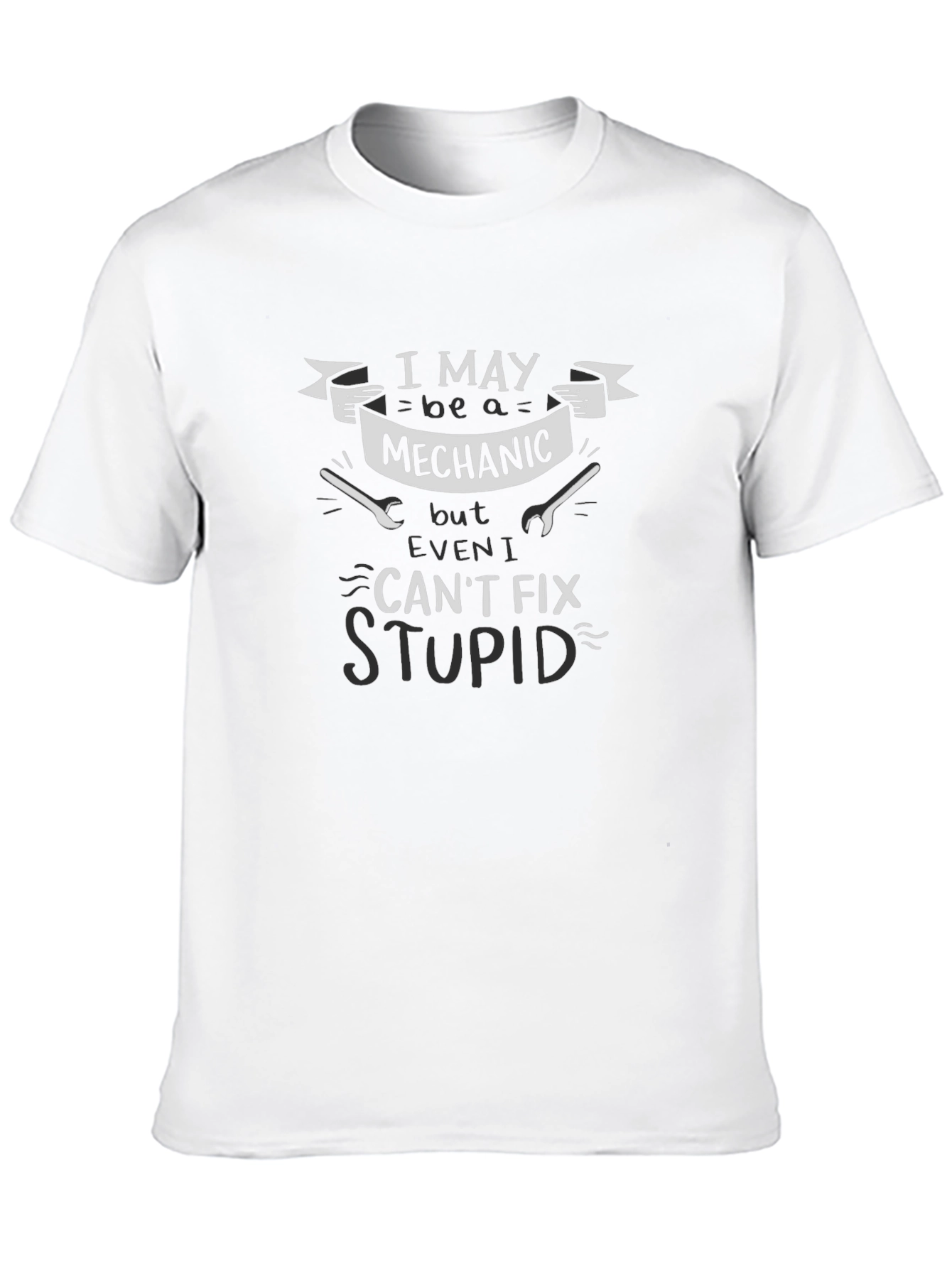 Luce esta divertida camiseta negra con un diseño único. Presenta una inscripción en blanco y gris que dice "I may be a mechanic but I can’t even fix stupid" (Puede que sea mecánico, pero ni siquiera puedo arreglar la estupidez), ideal para mecánicos con sentido del humor. El diseño incluye una pancarta decorativa y herramientas cruzadas. Perfecta para usar en el taller o en cualquier ocasión casual. Fabricada con materiales cómodos y duraderos, esta camiseta es una excelente adición a tu guardarropa o un regalo divertido para un amigo mecánico.
