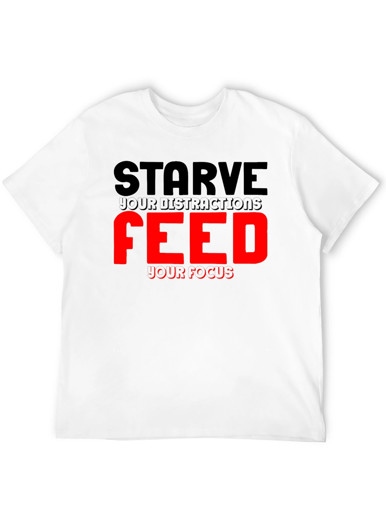 Destaca con esta camiseta negra de corte clásico, perfecta para el día a día. Su diseño presenta un mensaje inspirador en letras llamativas: "Starve Your Distractions, Feed Your Focus". La combinación de texto en negro y rojo añade un toque audaz y moderno. Fabricada con materiales de alta calidad, ofrece comodidad y durabilidad. Ideal para expresar tu mentalidad enfocada y motivada, ya sea en el gimnasio, en la calle o en cualquier actividad que requiera concentración. ¡Una prenda imprescindible para aquellos que buscan el éxito!