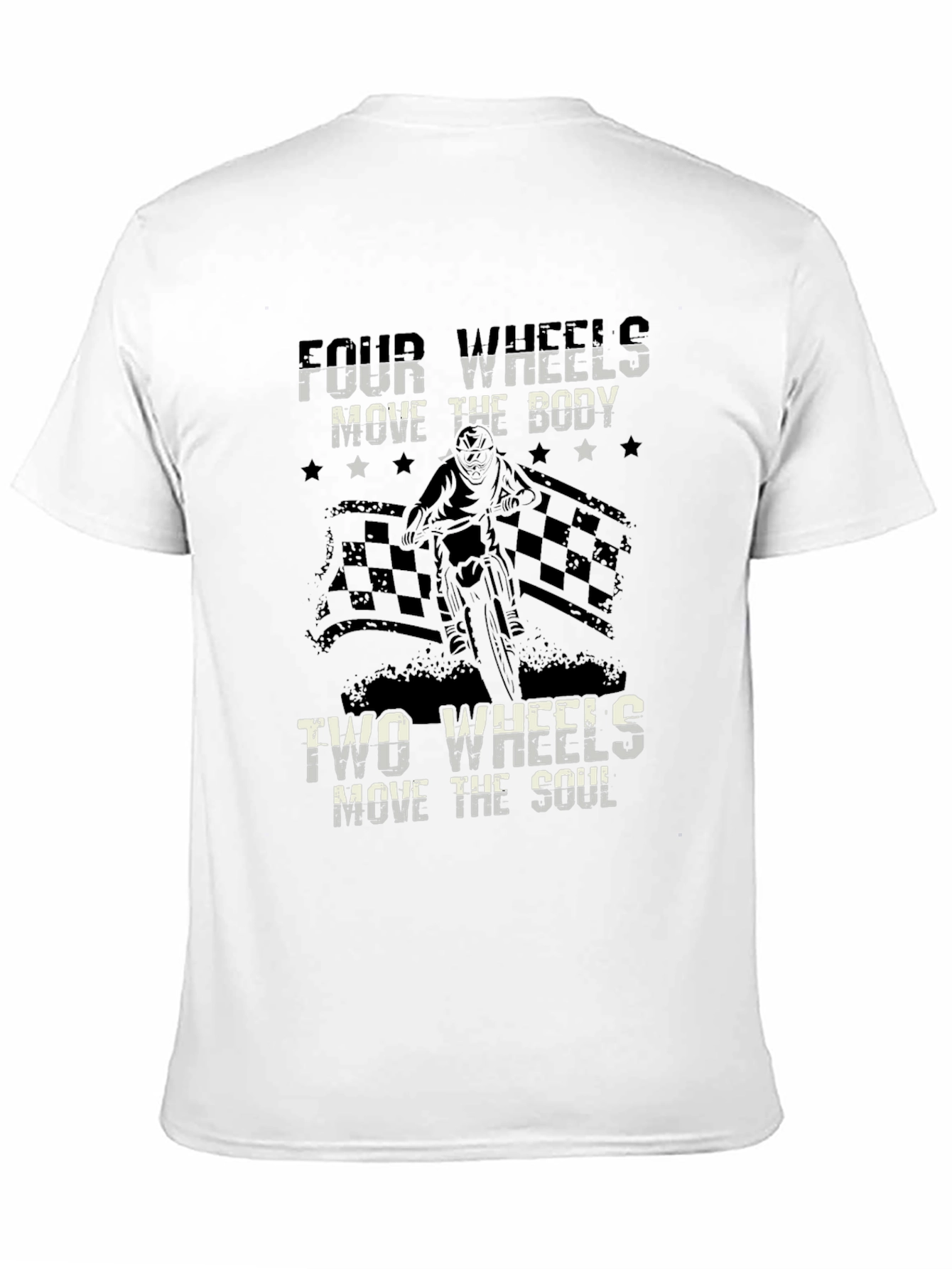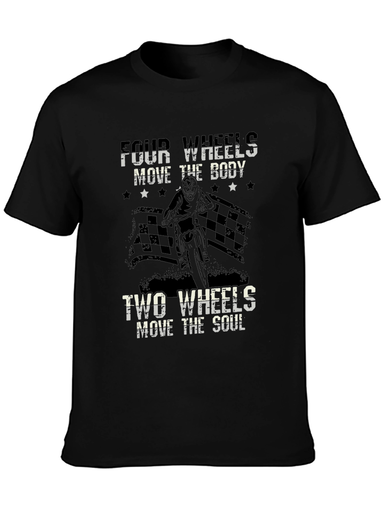 Expresa tu pasión por el motociclismo con esta camiseta negra de manga corta. El diseño llamativo presenta un gráfico con una moto sobre una bandera a cuadros, resaltado por las frases "Four Wheels Move The Body" y "Two Wheels Move The Soul", ideal para los amantes de la adrenalina y la velocidad. Perfecta para uso diario o para lucir en tus rutas y encuentros moteros. Fabricada con materiales que parecen suaves y cómodos, esta camiseta ofrece estilo y confort en cada aventura. Añade un toque distintivo a tu guardarropa con esta prenda única.