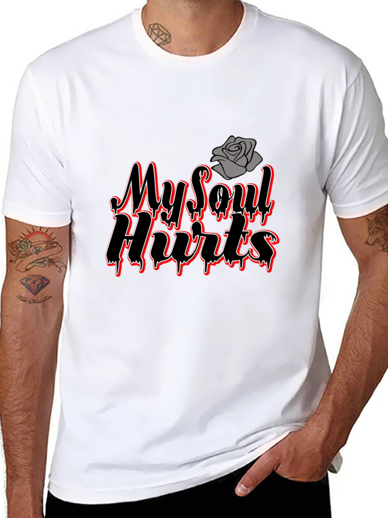 Expresa tu lado más profundo con esta camiseta negra de manga corta. Presenta un llamativo diseño gótico con la frase "My Soul Hurts" en letras estilizadas con efecto de goteo rojo, acentuado por una rosa gris. Perfecta para quienes aprecian la moda alternativa y las declaraciones audaces. Confeccionada en un material suave y cómodo, ideal para usar a diario o para eventos especiales. Esta camiseta es una forma única de mostrar tu personalidad y estilo individual. Combina bien con jeans, pantalones de cuero o faldas para crear looks versátiles y con actitud.