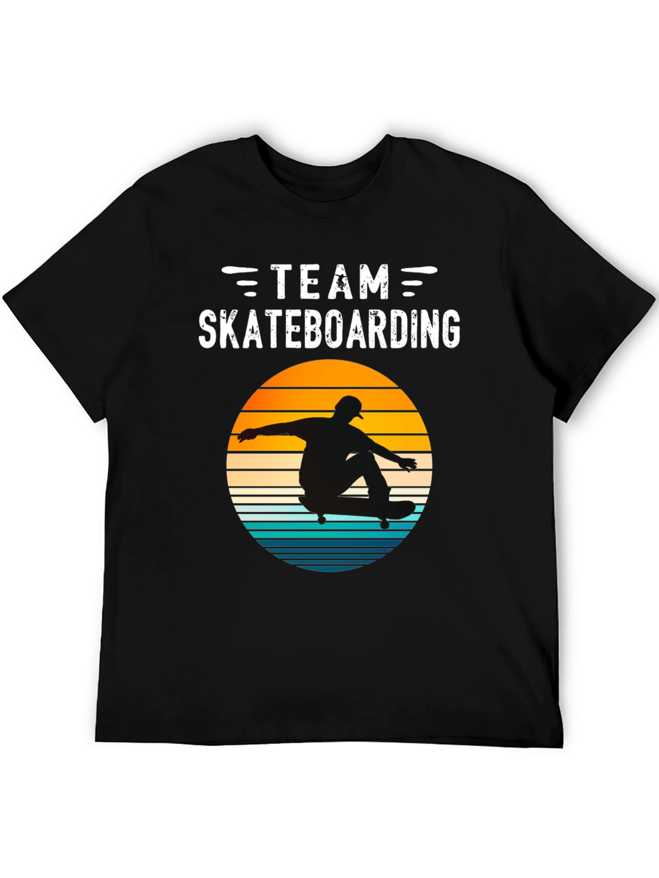 Luce un estilo casual y auténtico con esta camiseta negra de manga corta. Presenta un diseño llamativo con la inscripción "TEAM SKATEBOARDING" en color blanco, sobre un círculo con degradado de colores cálidos y fríos que simula un atardecer retro. En el centro, se distingue la silueta de un skater realizando un truco. Ideal para amantes del skateboarding y la moda urbana, esta camiseta es perfecta para usar en el día a día, salir con amigos o practicar tu deporte favorito. Su diseño original y cómodo la convierte en una prenda imprescindible en tu guardarropa. ¡Muestra tu pasión por el skate con esta camiseta única!