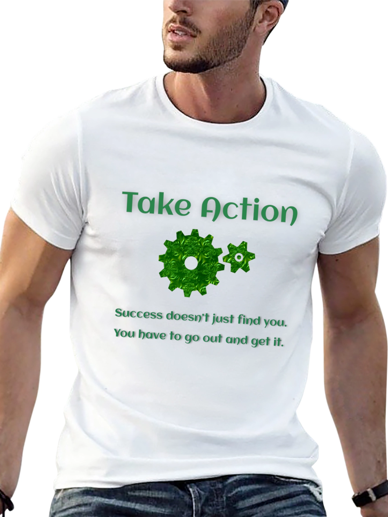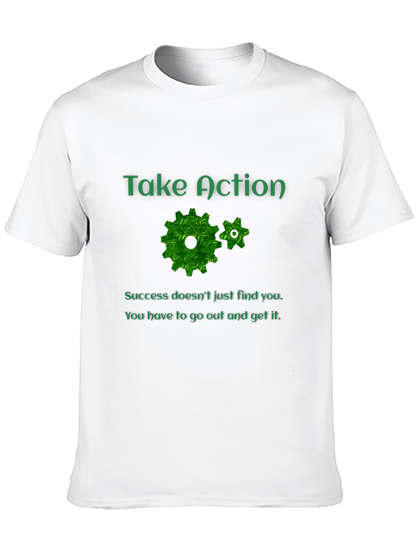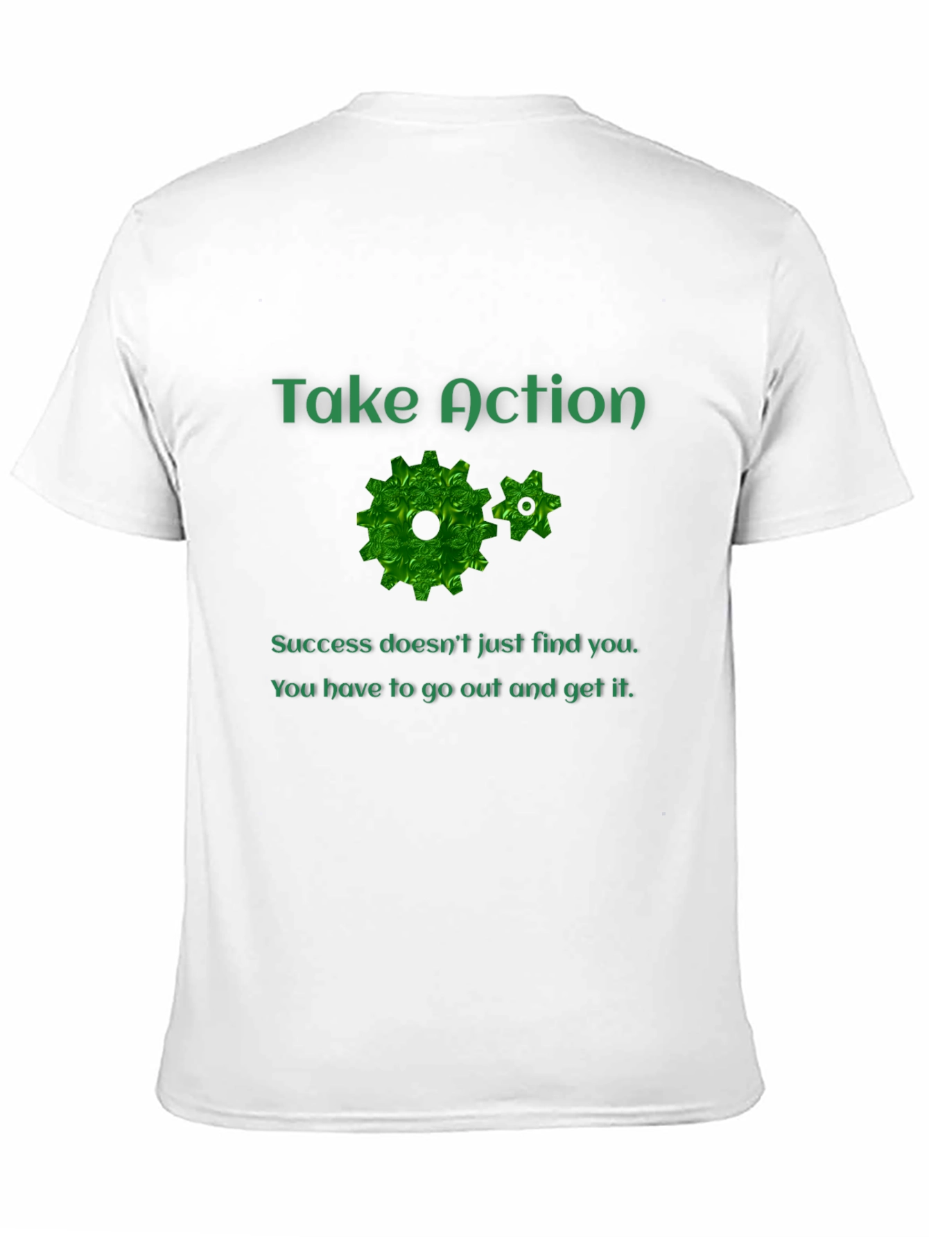 Esta camiseta negra presenta un diseño inspirador con el texto "Toma Acción" en color verde, acompañado de un motivo de engranajes. Fabricada con materiales suaves y cómodos, esta camiseta es perfecta para el uso diario y para aquellos que buscan motivación en su vestimenta. El mensaje inspirador, "El éxito no te encuentra, tienes que salir a buscarlo", la convierte en una prenda ideal para personas proactivas y con mentalidad de crecimiento. Lúcela en tus actividades cotidianas, en el gimnasio o como una declaración de principios en tus eventos sociales. Un estilo único y un mensaje poderoso en una sola prenda.