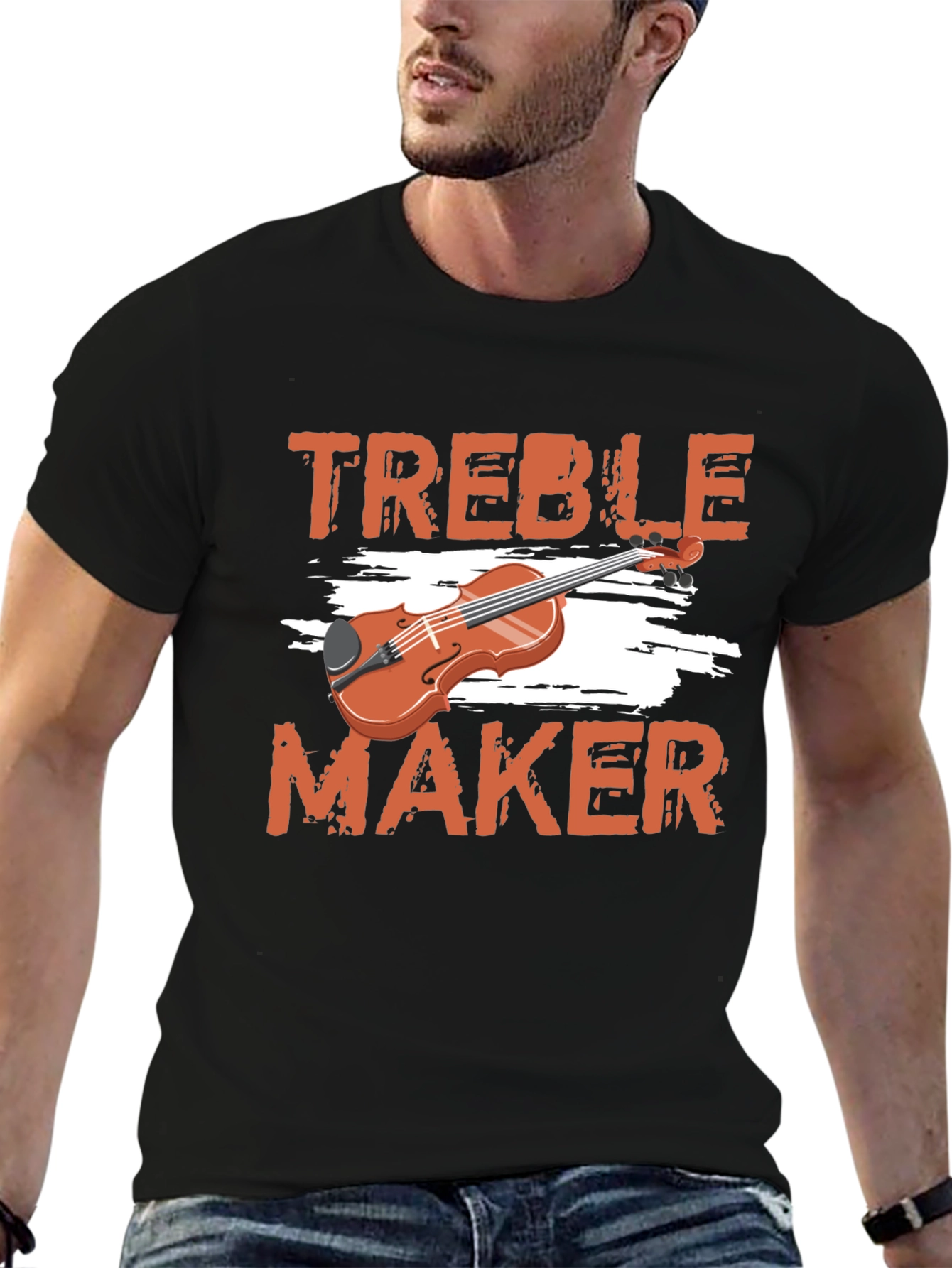 Esta elegante camiseta negra presenta un diseño llamativo con la frase 'Treble Maker' y una ilustración de un violín, ideal para músicos y amantes de la música. La camiseta, de corte clásico, parece estar confeccionada con un tejido suave y cómodo, perfecto para el uso diario. Su diseño único la convierte en una excelente opción para expresar tu pasión por la música o como un regalo original para ese amigo o familiar melómano. Combina esta camiseta con tus jeans favoritos para un look casual y moderno, o úsala en tu próxima presentación musical para destacar tu estilo.