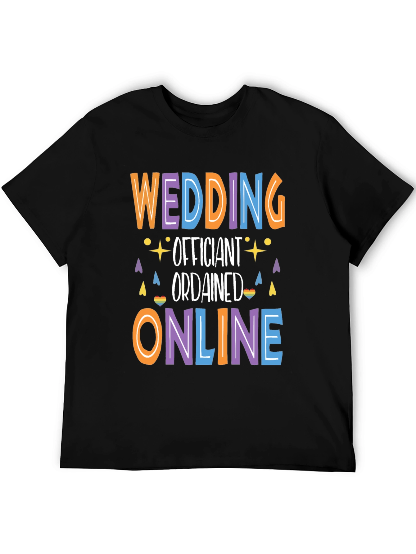 Esta camiseta negra presenta un diseño divertido y llamativo, perfecto para un oficiante de bodas moderno. Las palabras "WEDDING", "OFFICIANT", "ORDAINED" y "ONLINE" están impresas en colores vibrantes como naranja, lila y azul, creando un contraste alegre sobre el fondo oscuro. Adornada con pequeños símbolos festivos, como estrellas y corazones de arcoíris, la camiseta refleja un ambiente inclusivo y de celebración. Ideal para bodas informales o para mostrar con orgullo tu rol como oficiante, esta prenda es cómoda y llamativa.