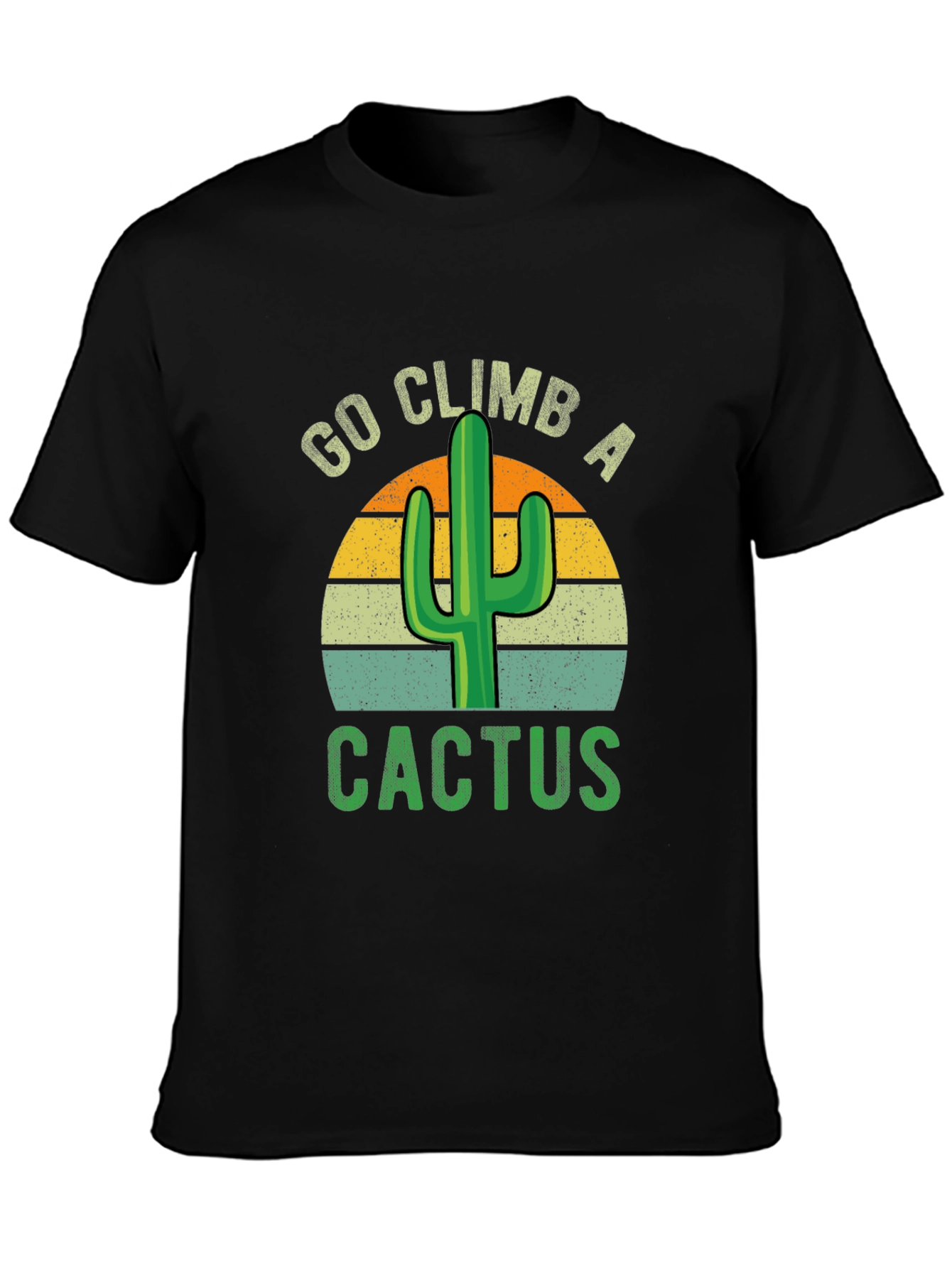 Luce esta llamativa camiseta negra con un diseño retro de un cactus y la frase "Go Climb A Cactus" (Sube un Cactus). Perfecta para los amantes de la naturaleza, aventureros y aquellos con un sentido del humor único. El diseño presenta un estilo vintage con un cactus verde brillante sobre un fondo de rayas horizontales en tonos naranja y verde. Hecha de un material suave y cómodo, ideal para el uso diario. Muestra tu espíritu audaz y original con esta prenda que seguro llamará la atención y despertará sonrisas. Combínala con jeans o pantalones casuales para un look relajado y con estilo. ¡Atrévete a subir un cactus!