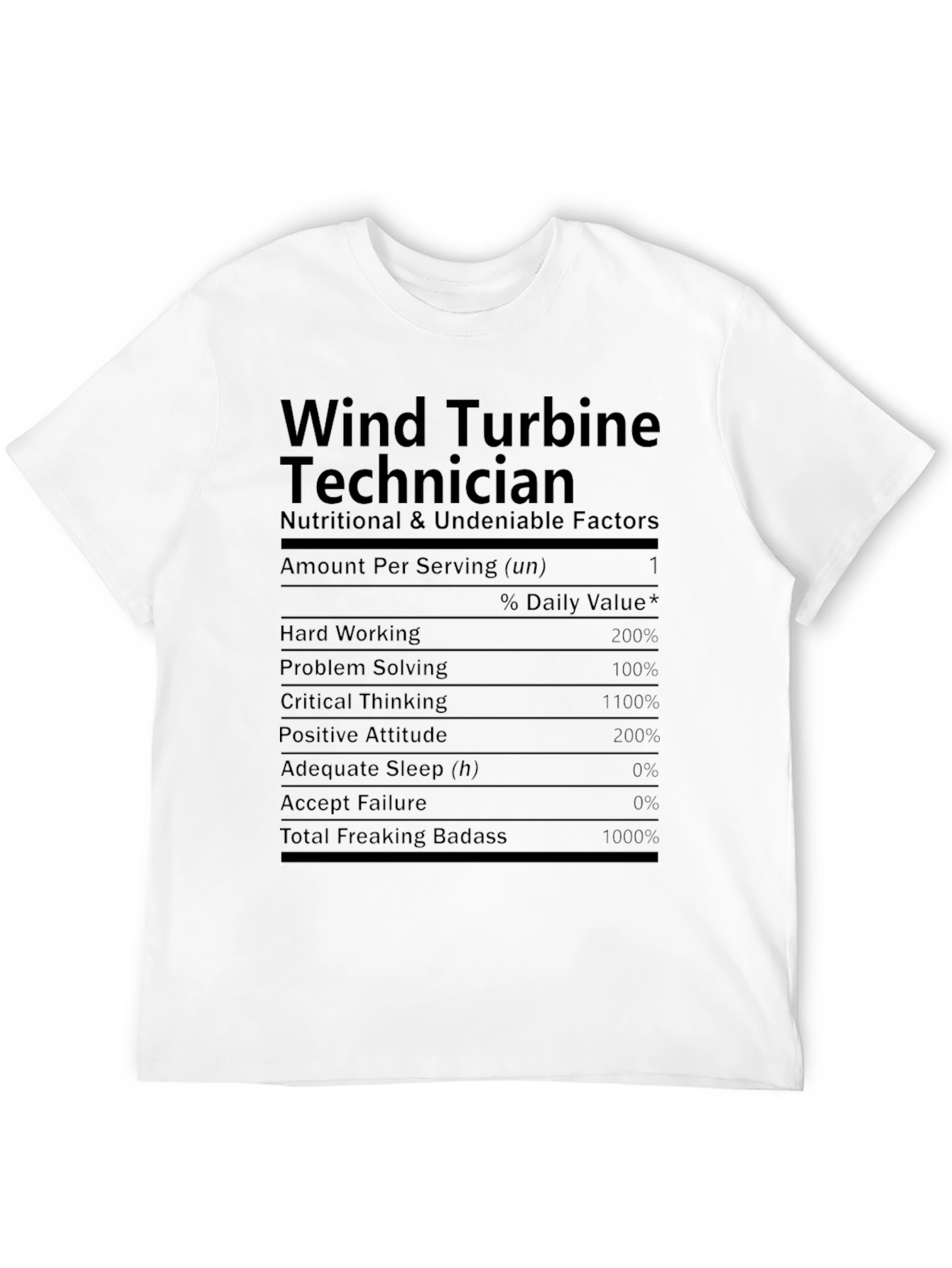Luce esta camiseta negra con un diseño único que destaca las cualidades de un técnico de turbina eólica. El diseño simula una etiqueta de información nutricional, con datos como "Trabajo Duro 200%", "Resolución de Problemas 100%", "Pensamiento Crítico 1100%" y "Actitud Positiva 200%". Ideal para ingenieros, técnicos y amantes de la energía eólica que deseen mostrar su pasión con estilo y humor. Perfecta para el uso diario, eventos relacionados con energías renovables o como un regalo original y divertido. ¡Muestra tu dedicación con esta prenda única!