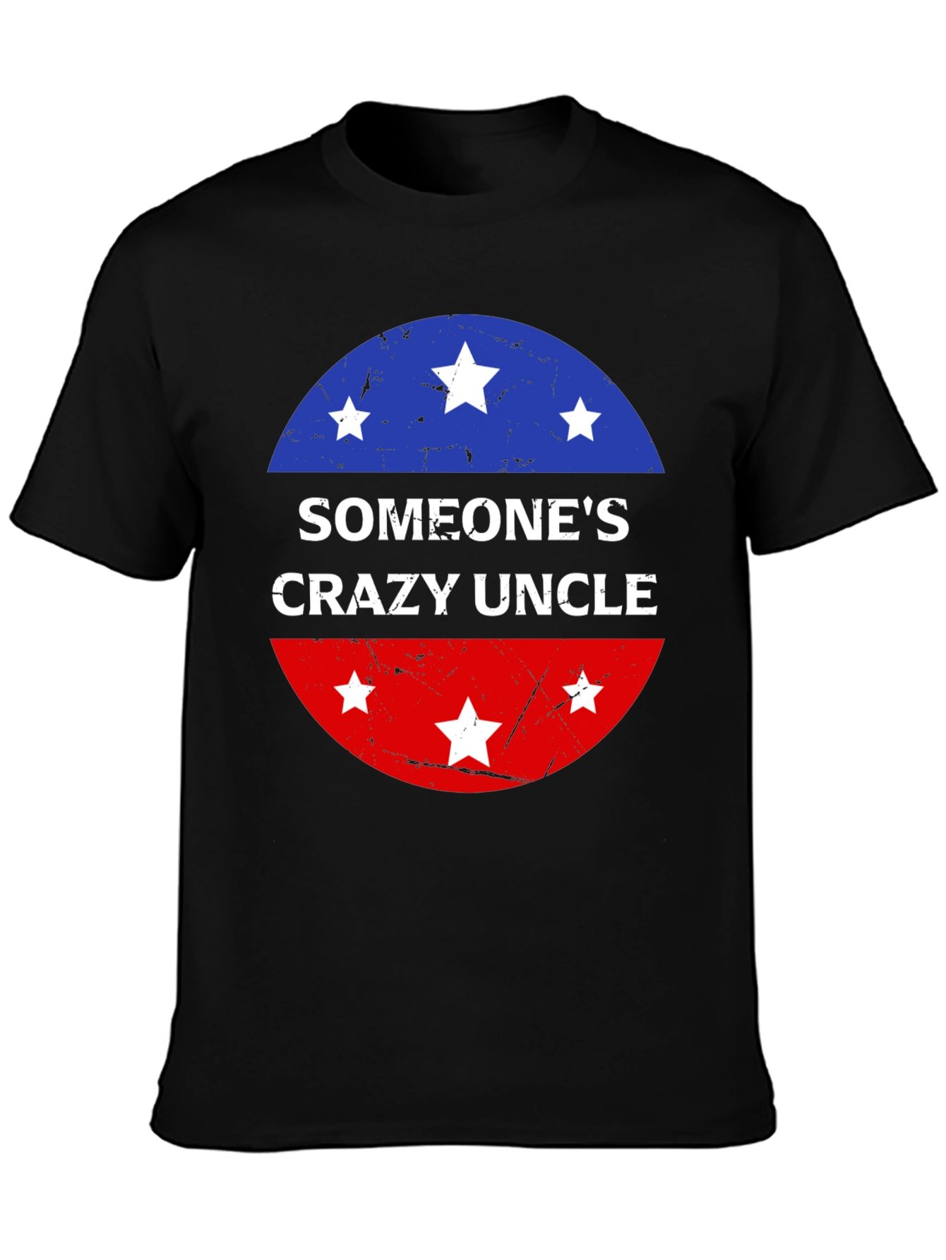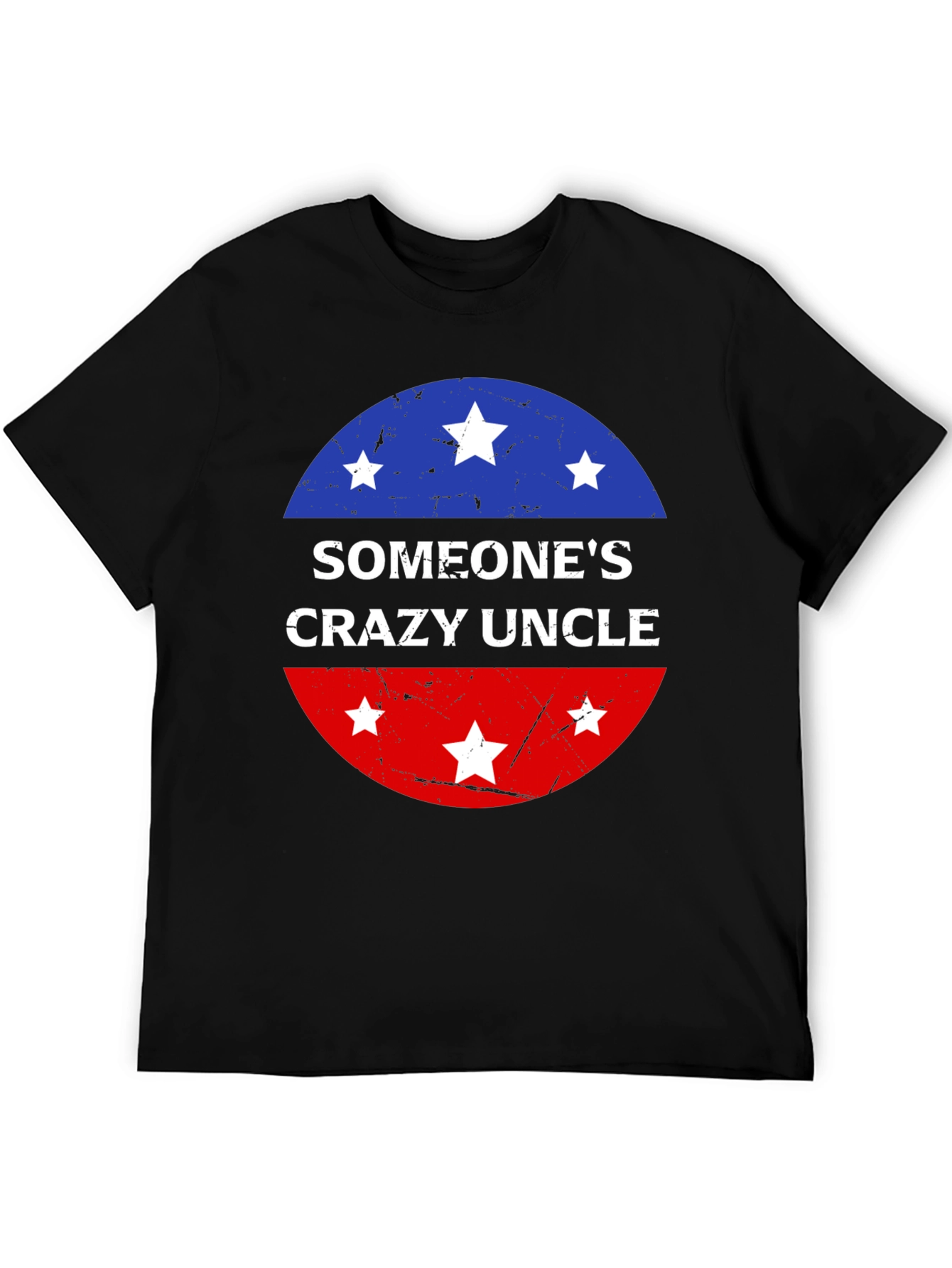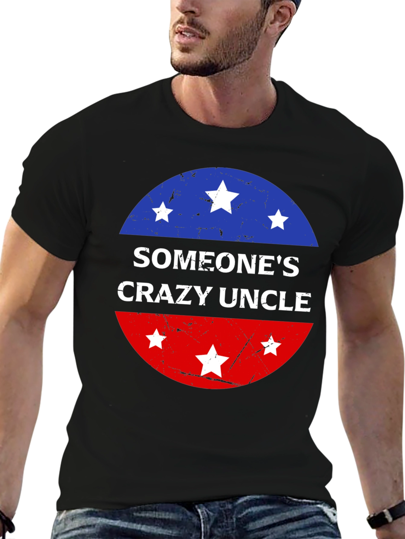 Luce un estilo divertido y patriótico con esta camiseta negra de manga corta. El diseño presenta un círculo dividido en azul y rojo con estrellas blancas, junto con el texto "SOMEONE'S CRAZY UNCLE" (El Tío Loco de Alguien) en letras blancas. Perfecta para reuniones familiares, fiestas del 4 de julio o simplemente para mostrar tu sentido del humor único. La camiseta parece ser de algodón suave, ofreciendo comodidad y durabilidad. Ideal para aquellos tíos orgullosos de su peculiaridad y que quieren destacar en cualquier ocasión. ¡Muestra tu lado divertido con esta original camiseta!