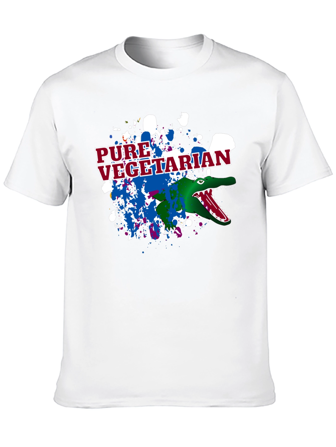 Esta llamativa camiseta negra presenta un diseño único con el texto "Vegetariano Puro" en letras rojas impactantes. Un cocodrilo verde estilizado con la boca abierta añade un toque audaz y divertido. El diseño está adornado con salpicaduras de pintura azul, blanca y morada, creando un efecto visual moderno y artístico. Perfecta para vegetarianos con sentido del humor y estilo propio. Ideal para uso diario, eventos informales o para expresar tu estilo de vida de manera original. Fabricada con materiales de alta calidad para mayor comodidad y durabilidad.