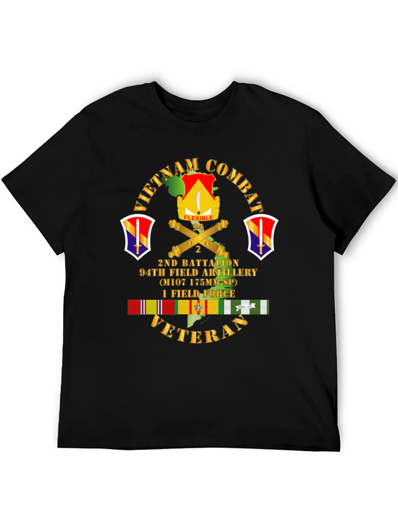 Muestra tu orgullo con esta camiseta negra de manga corta. Presenta un diseño llamativo con el emblema de Vietnam Combat Veteran, el 2do Batallón y el 94º de Artillería de Campaña (M107 175MM-SP), y la 1ª Fuerza de Campo. Perfecta para veteranos y patriotas, esta camiseta es una forma de honrar el servicio y el sacrificio. El diseño incluye colores vibrantes y detalles intrincados. Hecha con materiales cómodos y duraderos, ideal para uso diario o eventos especiales. Vístela con orgullo y comparte tu historia.